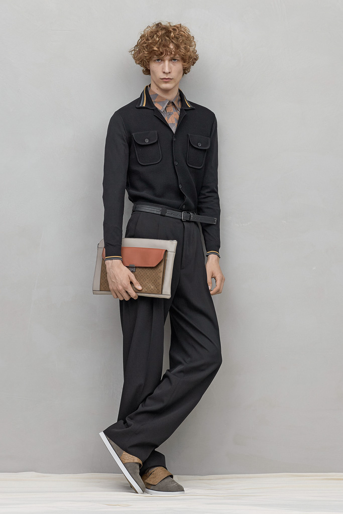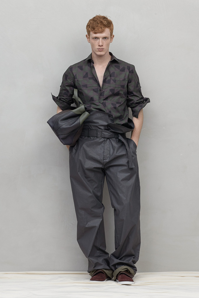 The brand’s signature braiding sprouted over brogues, biker jackets and blousons, adding texture to pockets and yokes on clothing. Puzzle-like patchworks on leather blousons recalled the Seventies, as did camp shirts and donkey jackets in a polyester doubleknit. While some of the clothes were overcharged with crinkling and patchworking, Maier nailed it with the quiet chic of a languid, beige silk trench, or a crisp uniform-like shirt tucked into those big pants.