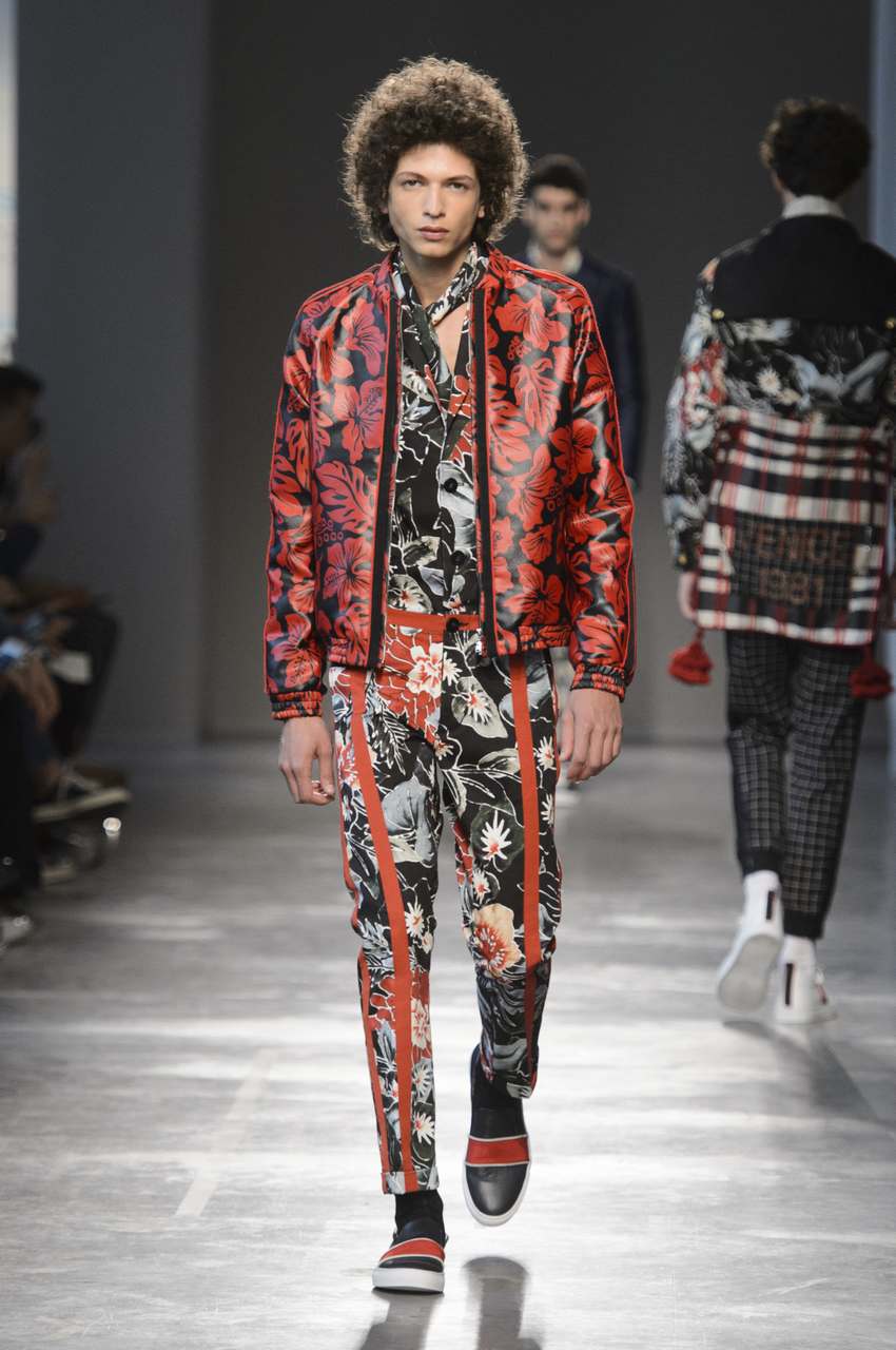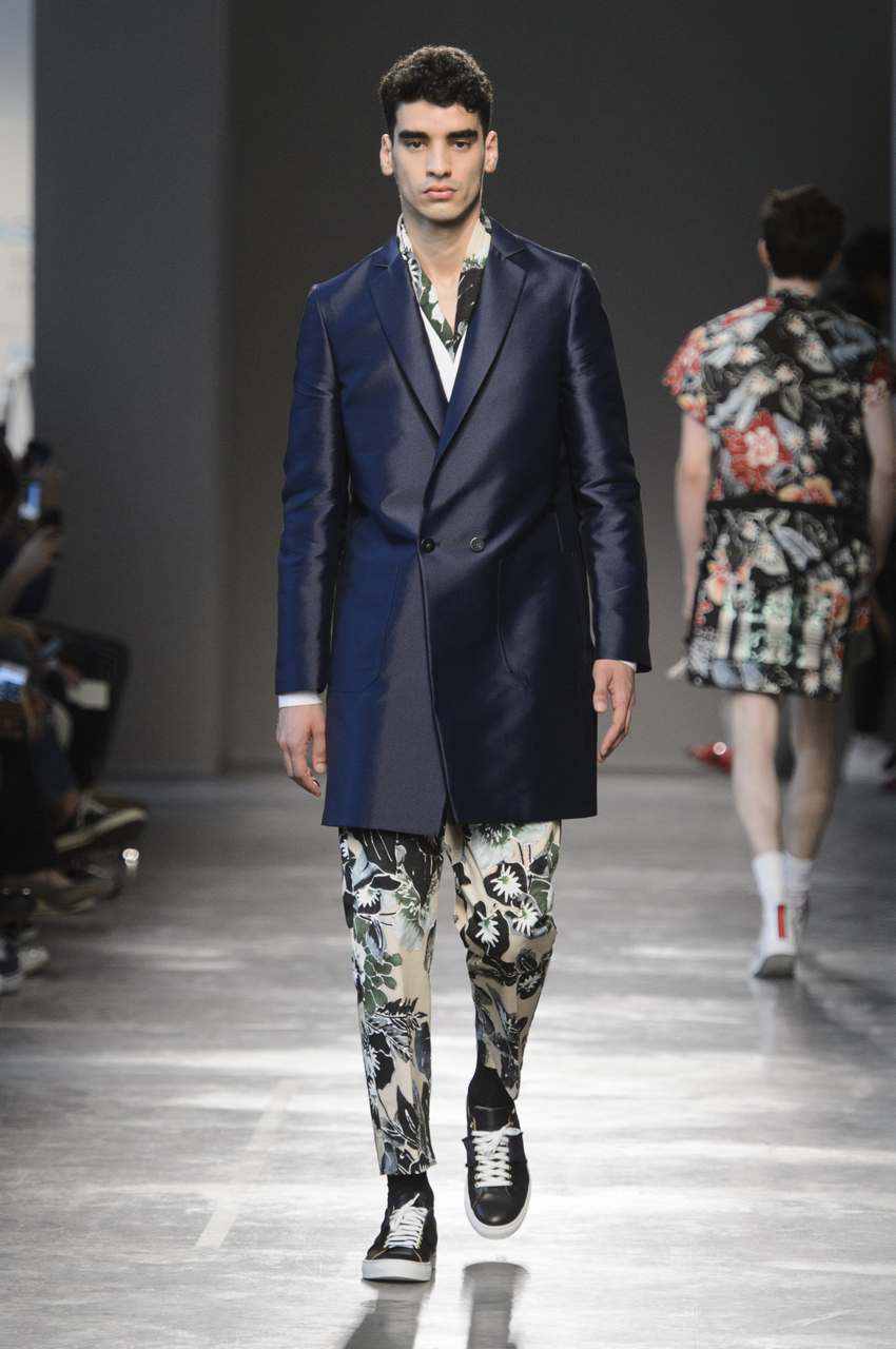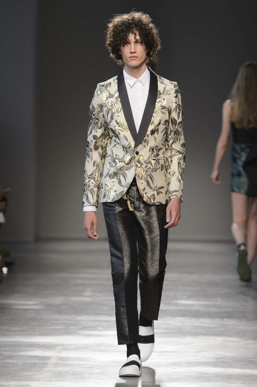 Bold floral prints bloomed on cotton shirts, short pants, as well as a red-and-black leather bomber, transporting a Californian surfer vibe. Bridging the contrasting spirits of the collection, Pellizzari employed floral brocades and jacquards — a tribute to the opulent Venetian style of the 18th century — for suits and tuxedo jackets.
