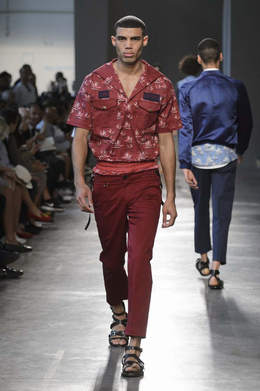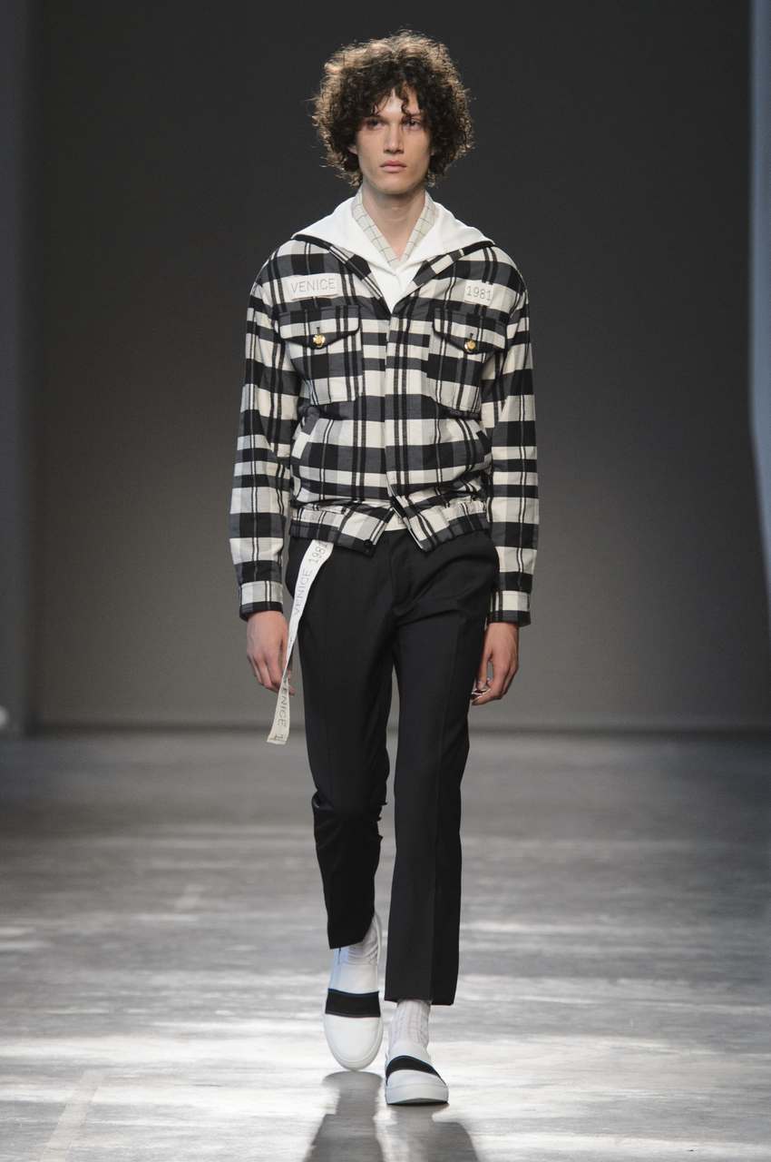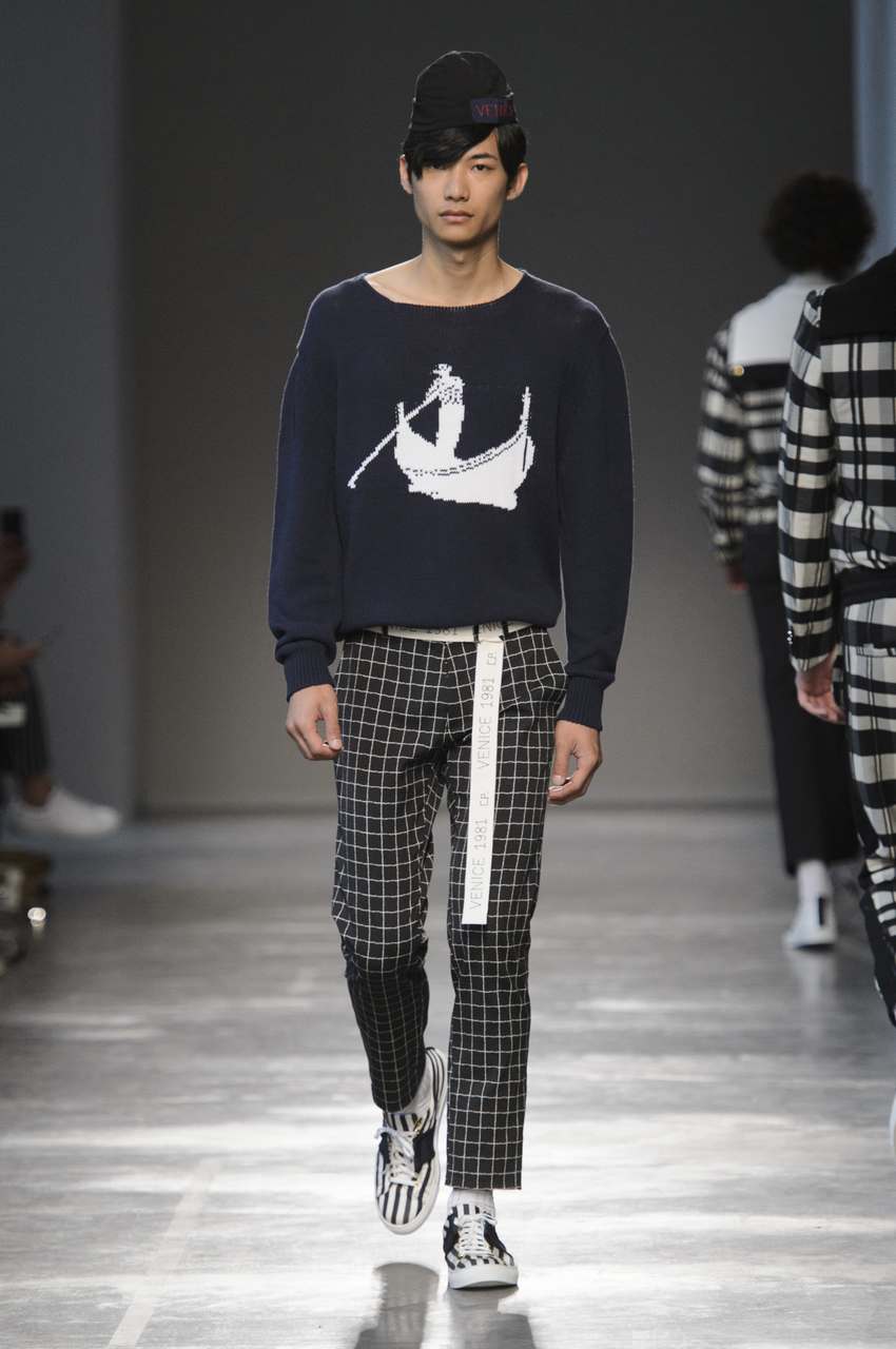 Venice and Venice Beach were the two cities that influenced Christian Pellizzari’s collection. References to the former emerged in the original outwear pieces inspired by the traditional uniforms worn by gondoliers. These came worked in a range of patterns from checks to micro graphics and were paired with slim pants, as well as relaxed joggers.