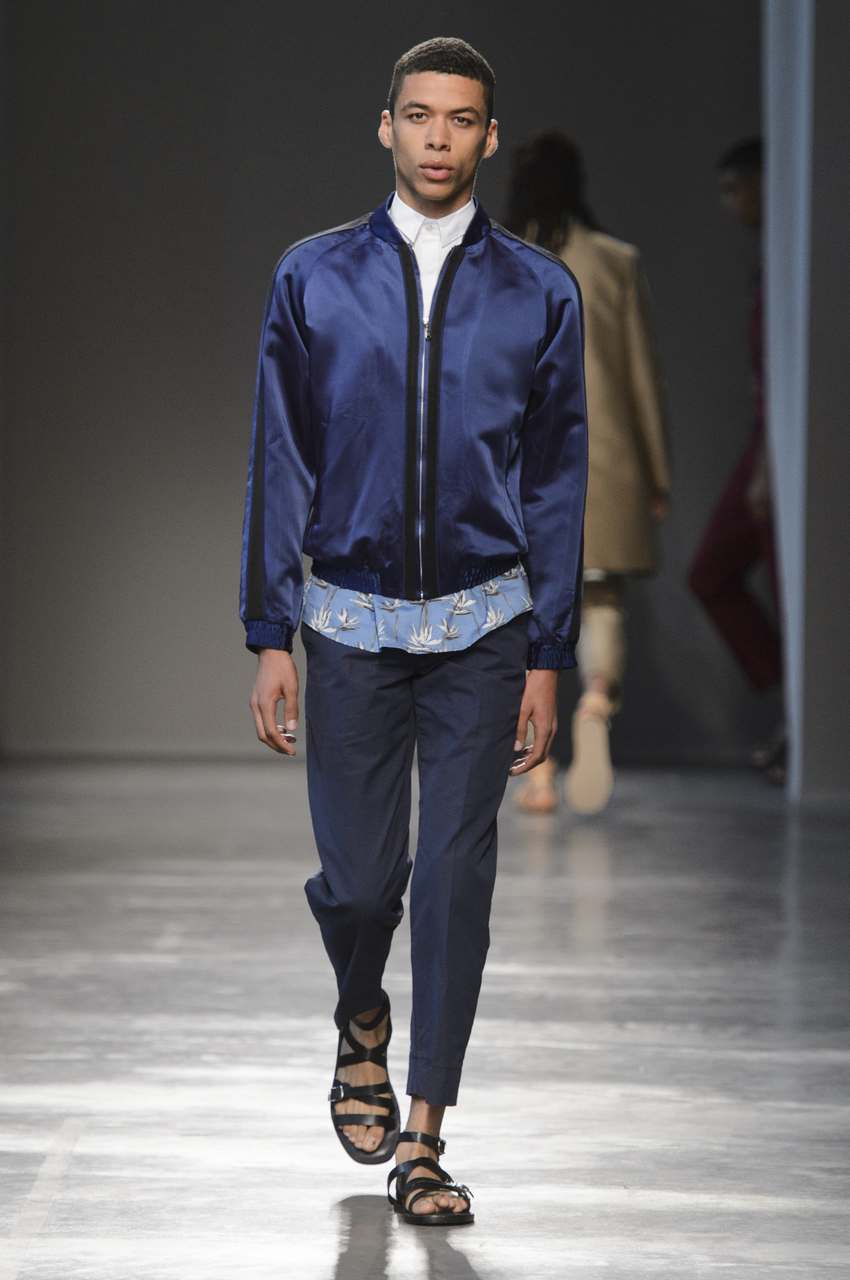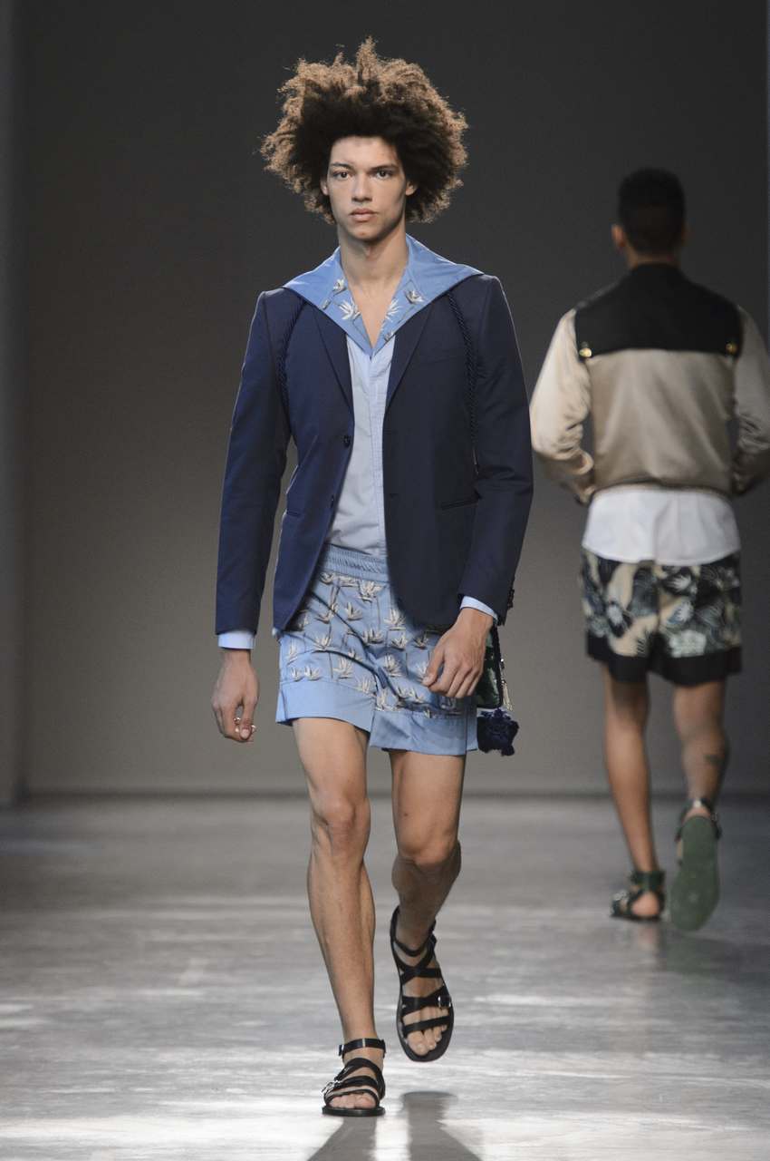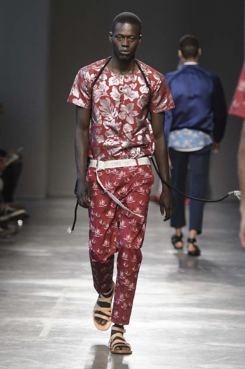 Venice and Venice Beach were the two cities that influenced Christian Pellizzari’s collection. References to the former emerged in the original outwear pieces inspired by the traditional uniforms worn by gondoliers. These came worked in a range of patterns from checks to micro graphics and were paired with slim pants, as well as relaxed joggers.