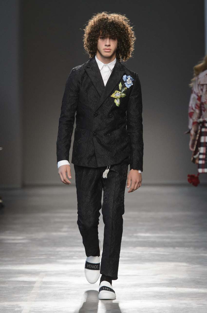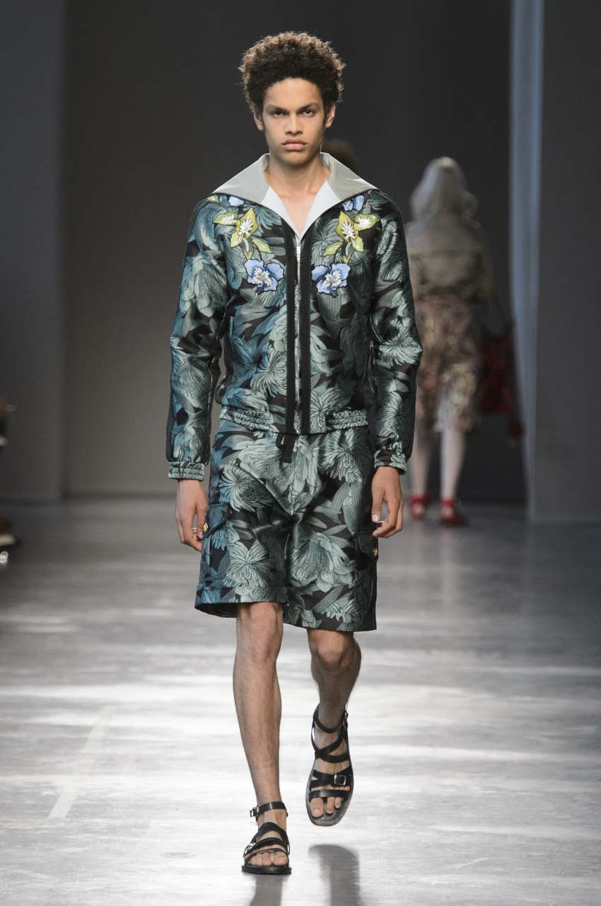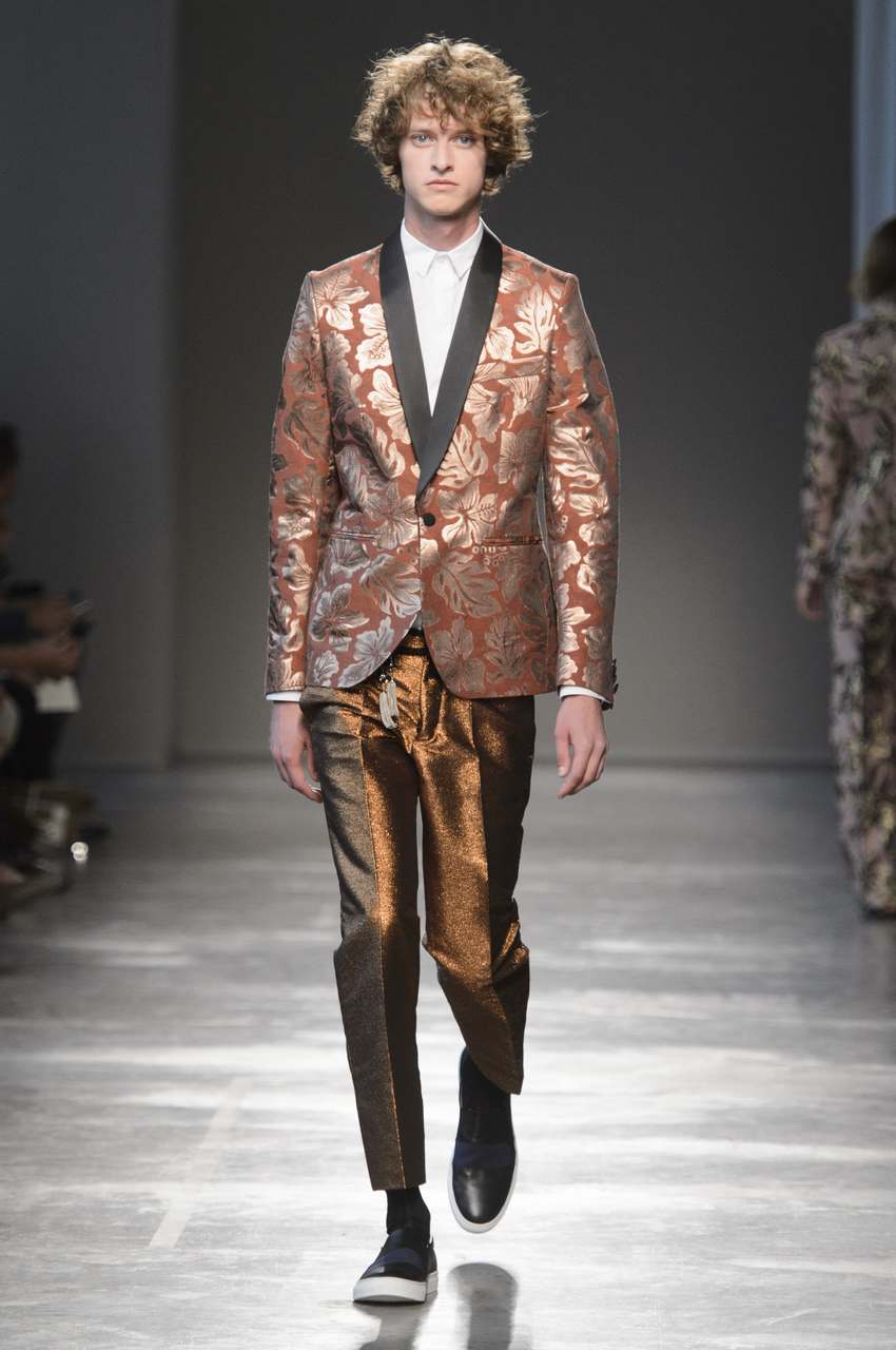 Bold floral prints bloomed on cotton shirts, short pants, as well as a red-and-black leather bomber, transporting a Californian surfer vibe. Bridging the contrasting spirits of the collection, Pellizzari employed floral brocades and jacquards — a tribute to the opulent Venetian style of the 18th century — for suits and tuxedo jackets.