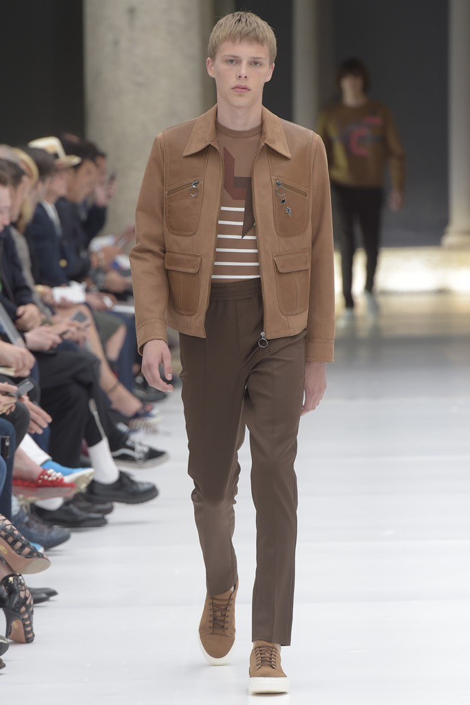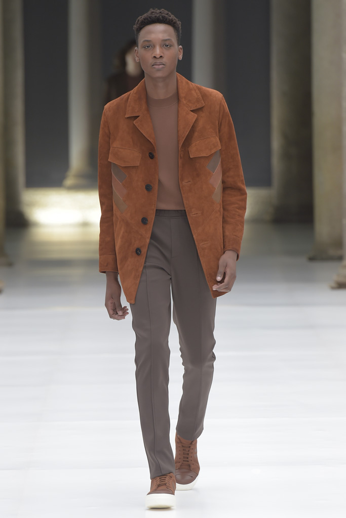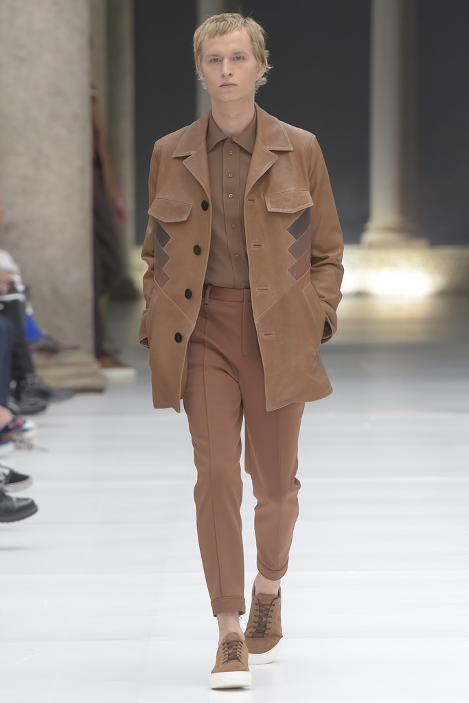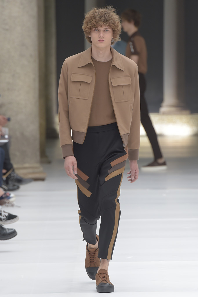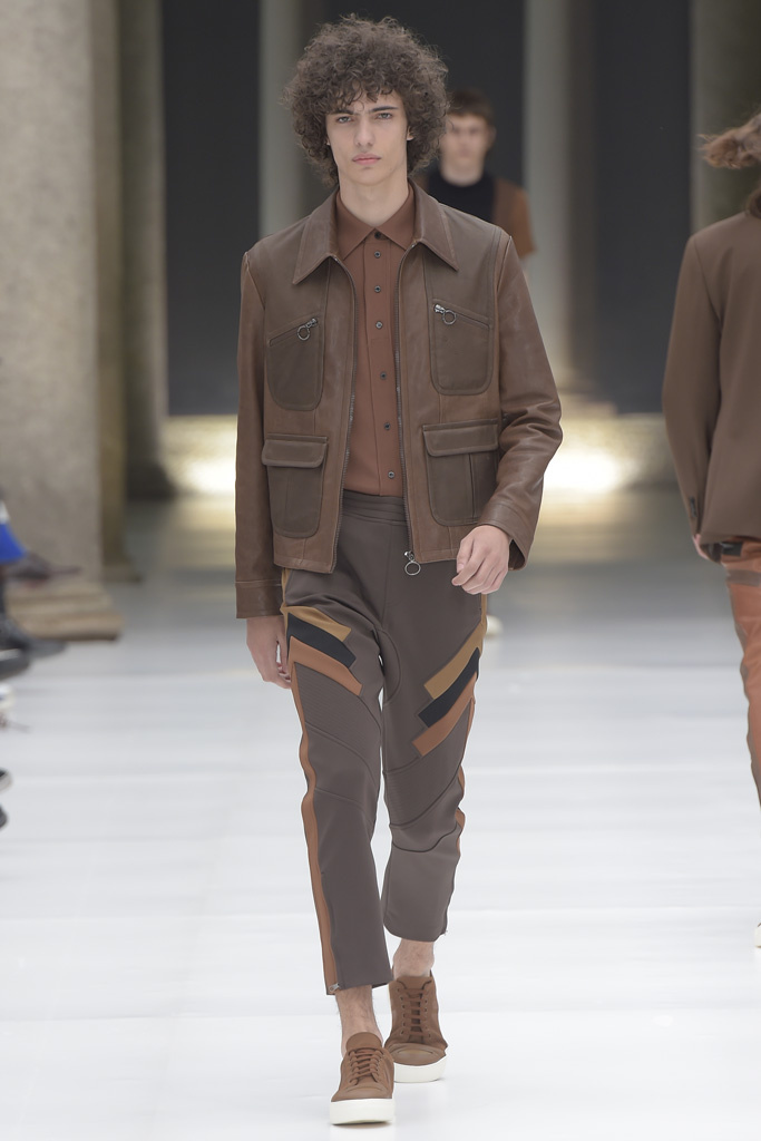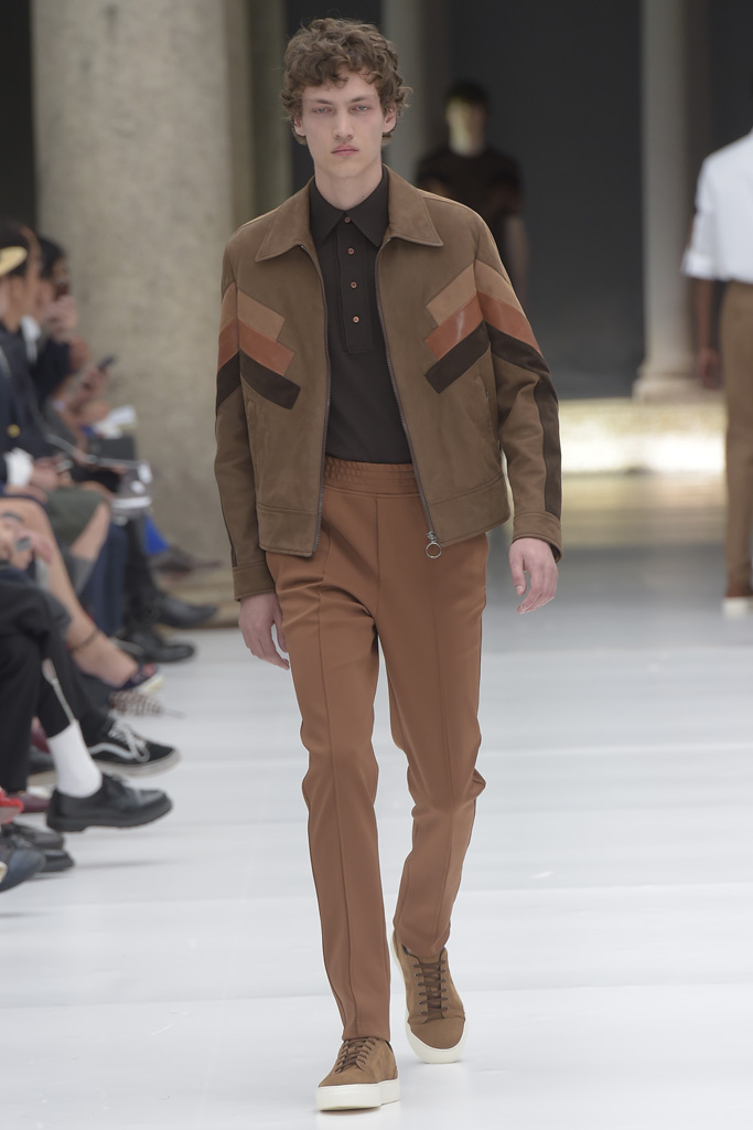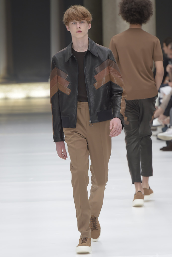 This was a repetitive show. Gosh knows how many leather blousons passed by, most of them in sickly thrift-shop browns with contrasting strips inserted in chevron formation around the ribcage and fanning out over the sleeves. Ditto for the tapered double-knit pants ending in low-cut leather sneakers.