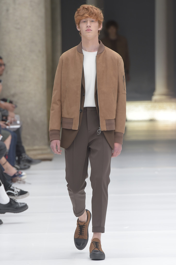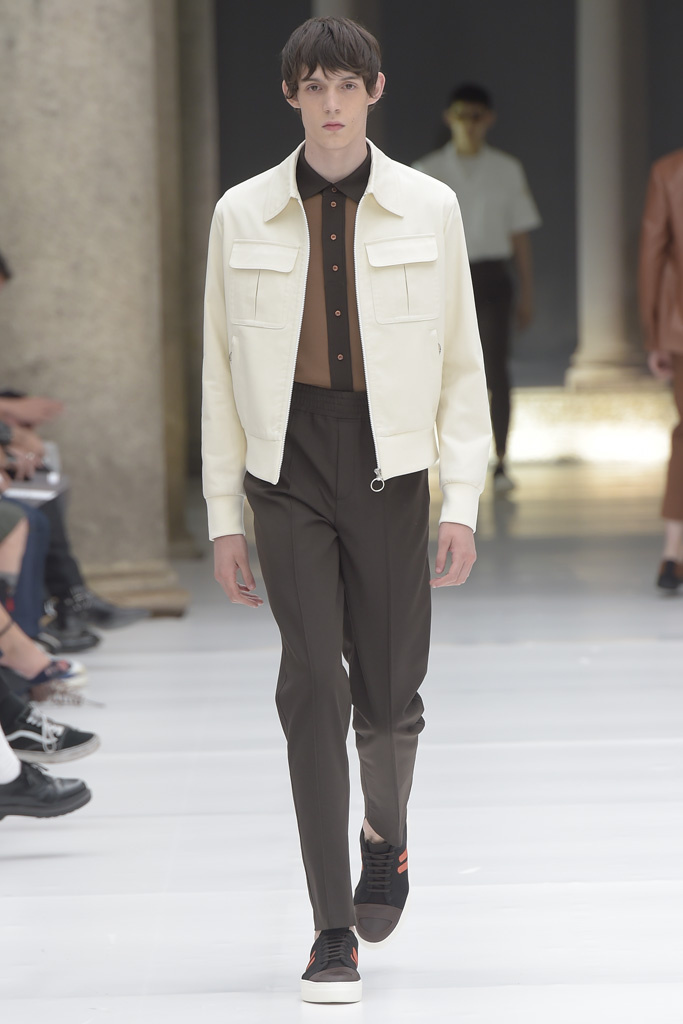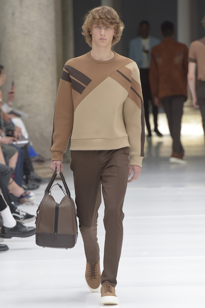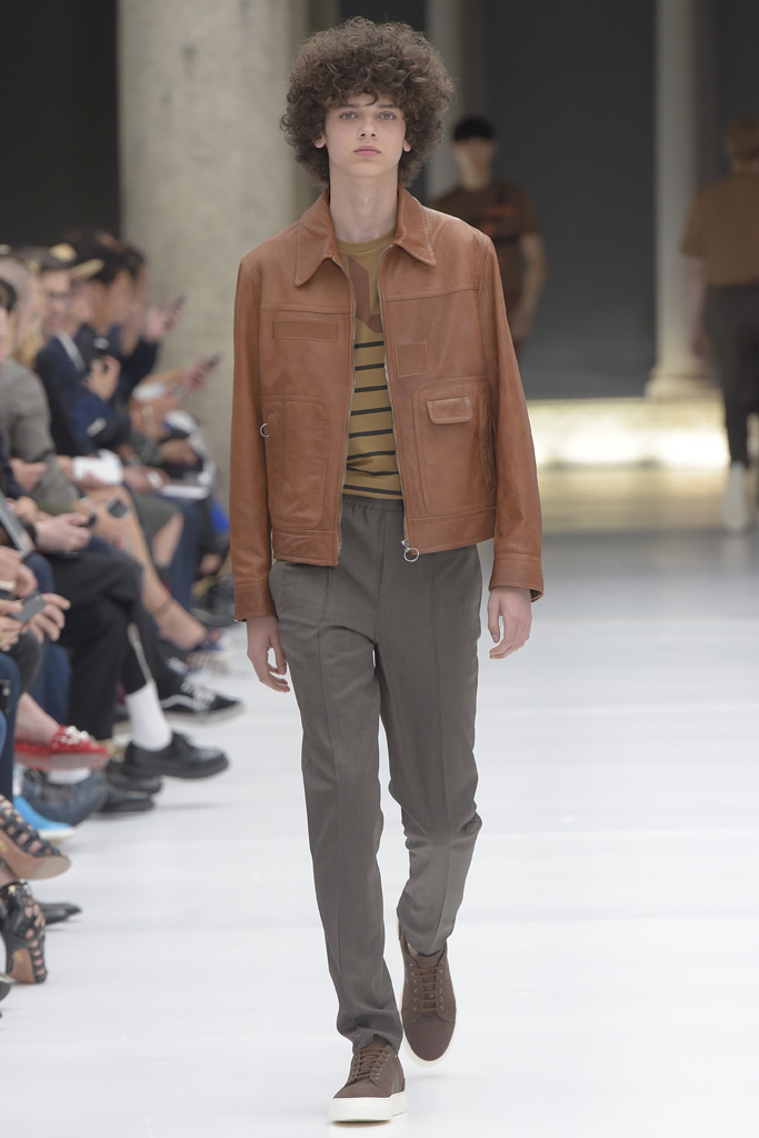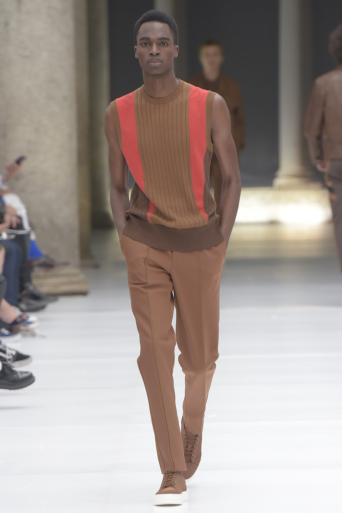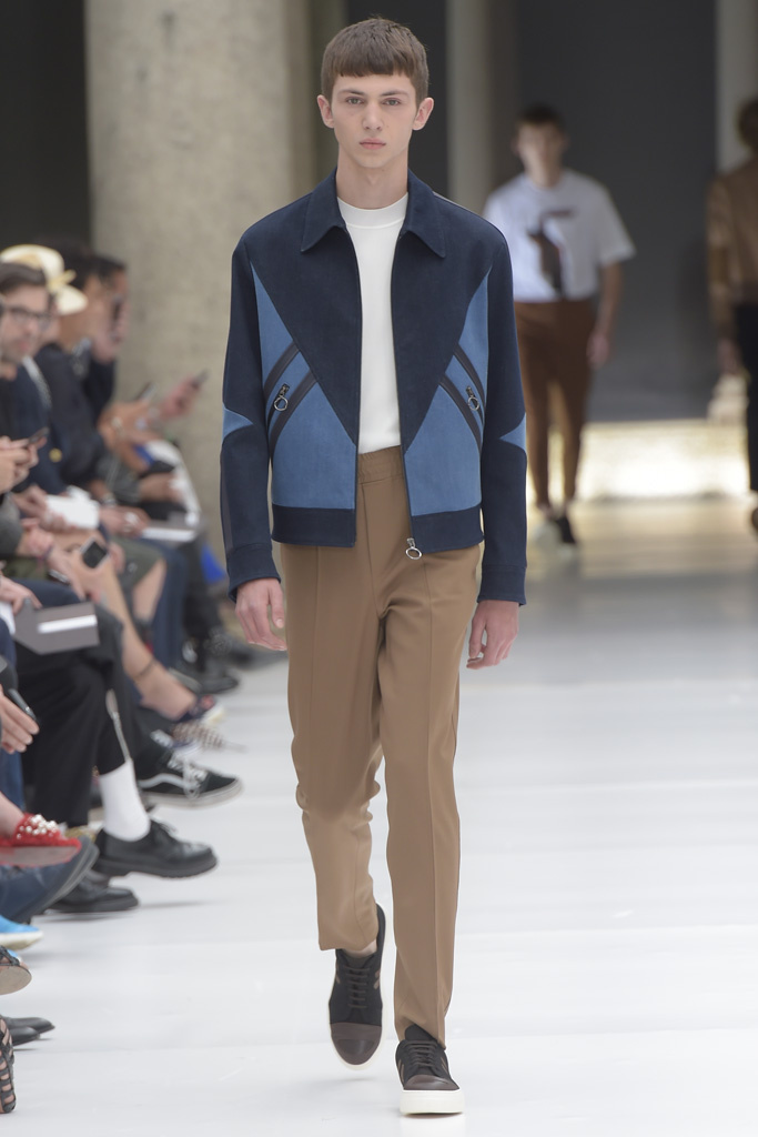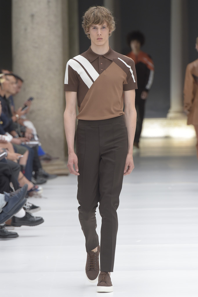 This was a repetitive show. Gosh knows how many leather blousons passed by, most of them in sickly thrift-shop browns with contrasting strips inserted in chevron formation around the ribcage and fanning out over the sleeves. Ditto for the tapered double-knit pants ending in low-cut leather sneakers.