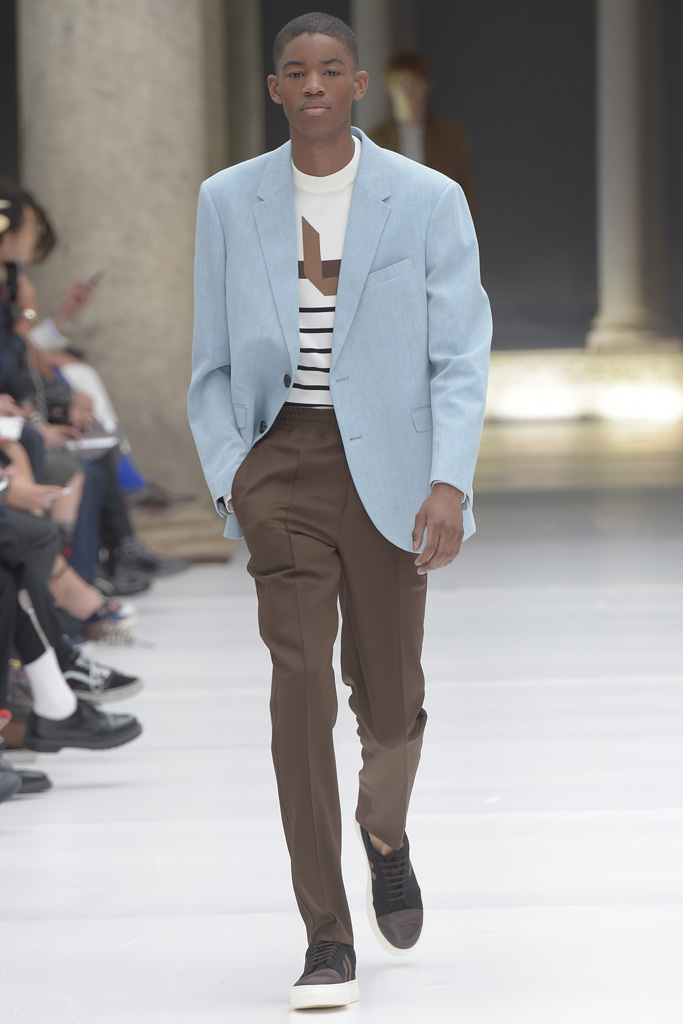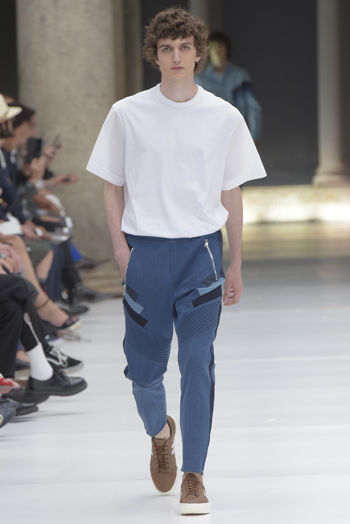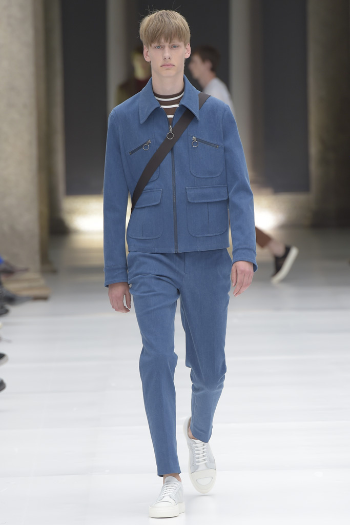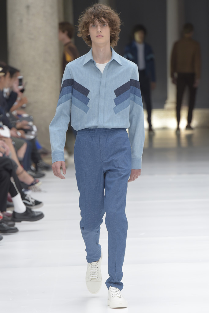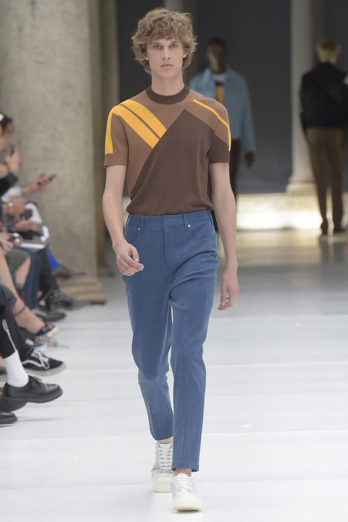The button-up short sleeves on camp shirts and T-shirts brought to mind park wardens; Leisure suits in sky-blue denim evoked camera-toting dads at Grand Canyon. He gave everything a boyish charm and a modernist gloss, enhanced by the crisp fabrics and a consistent silhouette. Most exits were voluminous on top and tapering to the bottom, as tempting as a cone of soft serve.