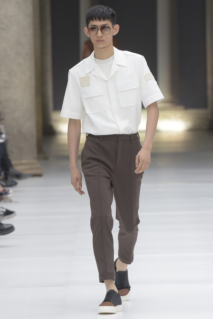 The button-up short sleeves on camp shirts and T-shirts brought to mind park wardens; Leisure suits in sky-blue denim evoked camera-toting dads at Grand Canyon. He gave everything a boyish charm and a modernist gloss, enhanced by the crisp fabrics and a consistent silhouette. Most exits were voluminous on top and tapering to the bottom, as tempting as a cone of soft serve.