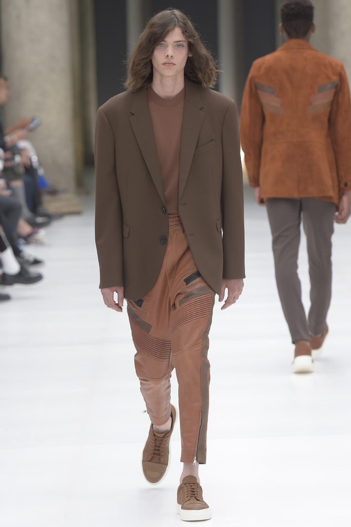 This was a repetitive show. Gosh knows how many leather blousons passed by, most of them in sickly thrift-shop browns with contrasting strips inserted in chevron formation around the ribcage and fanning out over the sleeves. Ditto for the tapered double-knit pants ending in low-cut leather sneakers.