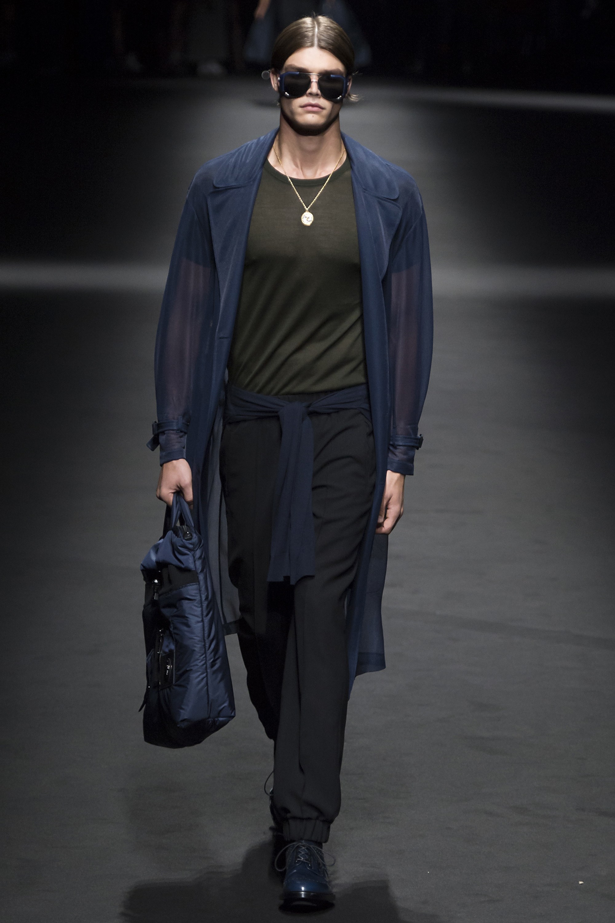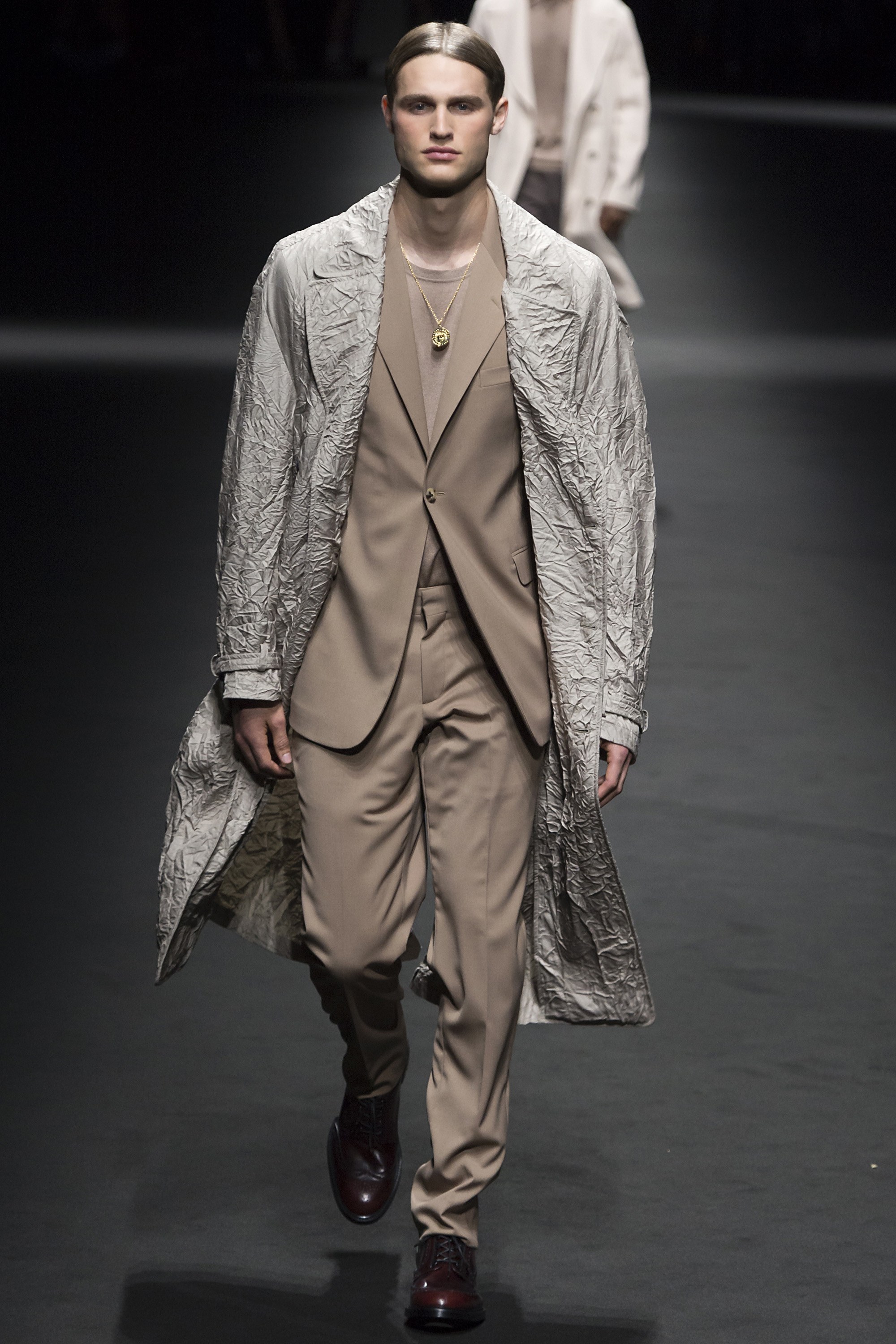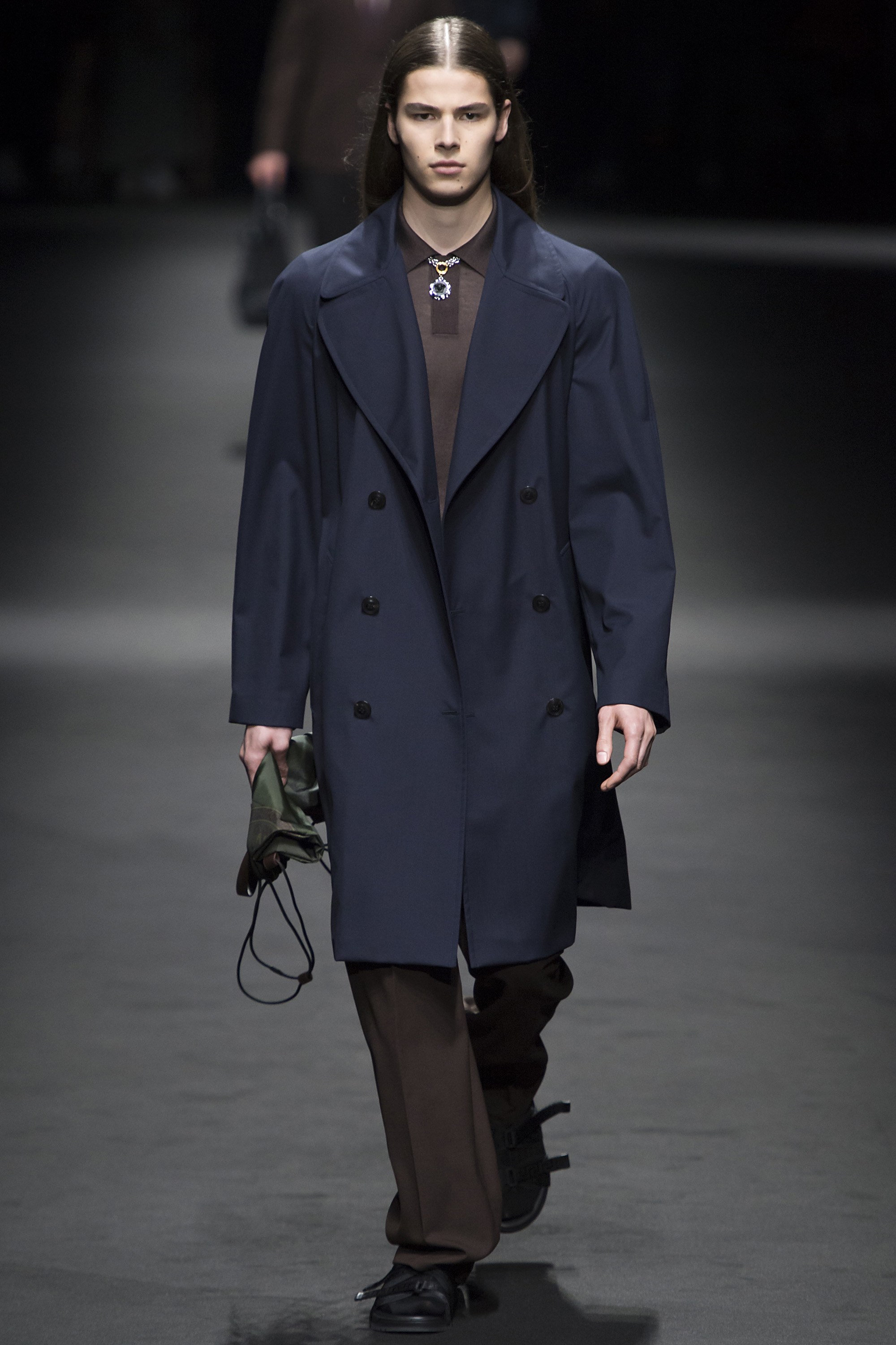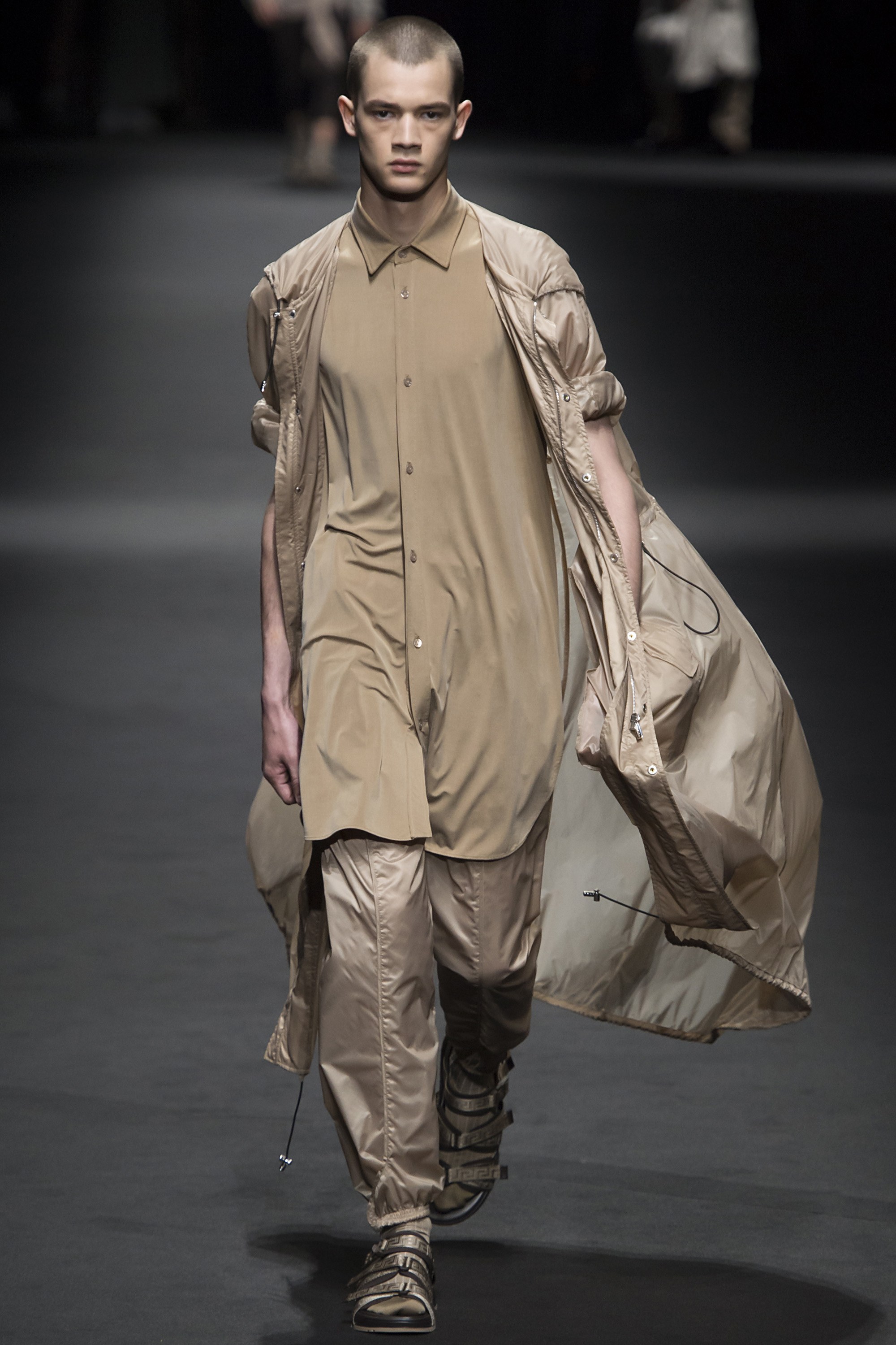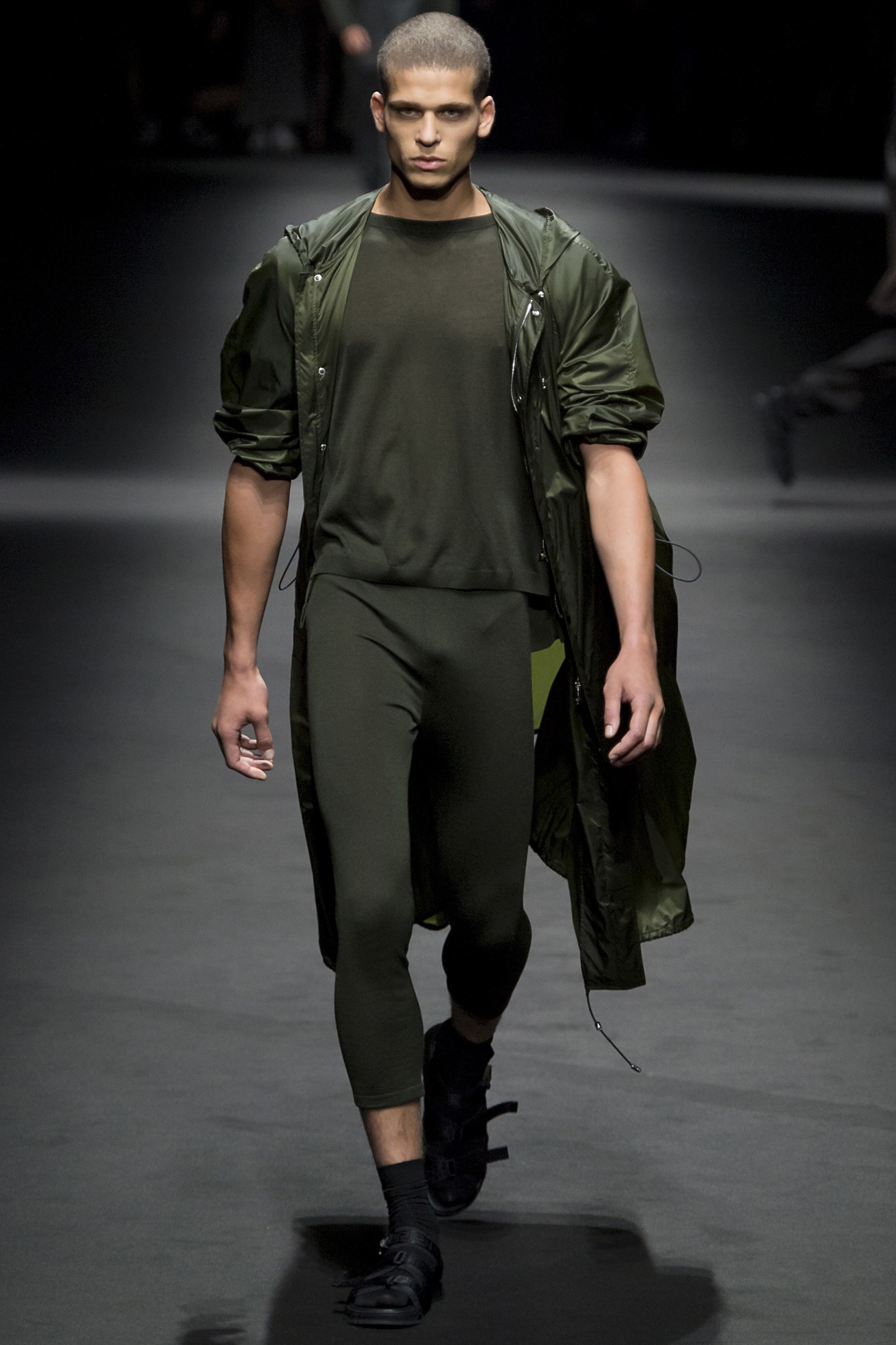 2. The first model out wore an army green parachute jacket and slim trousers, a look that would set the tone for the rest of the collection’s muted colors and utilitarian feel.