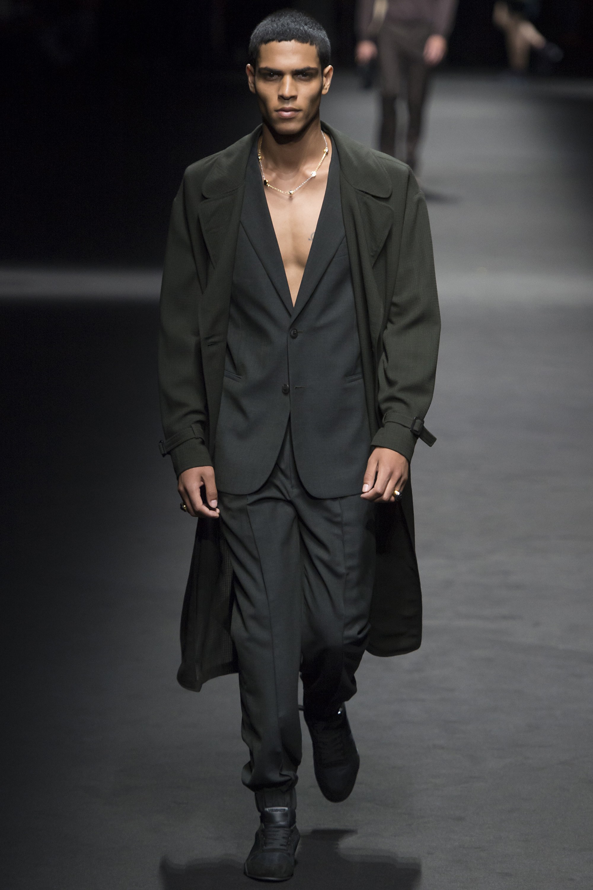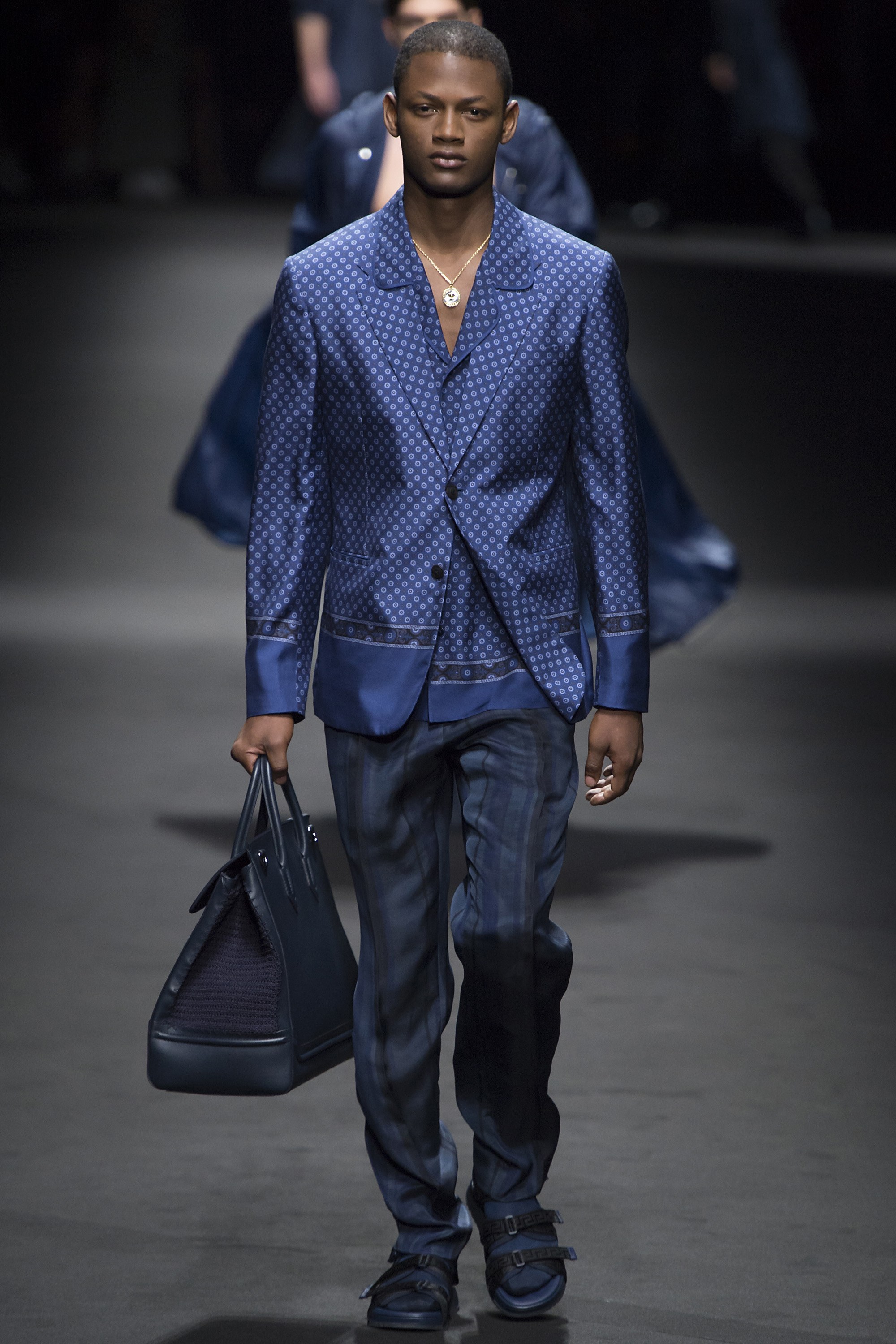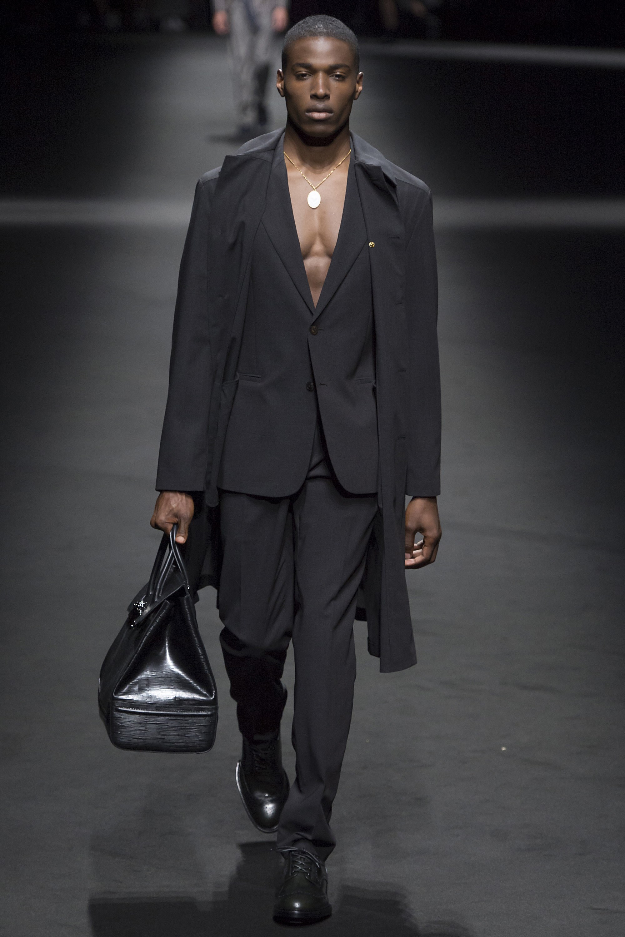 1. Two large screens with the text “Versace Men” framed the runway. Before the show started, a film by Bruce Weber set to a medley of Prince songs was projected on the screens.