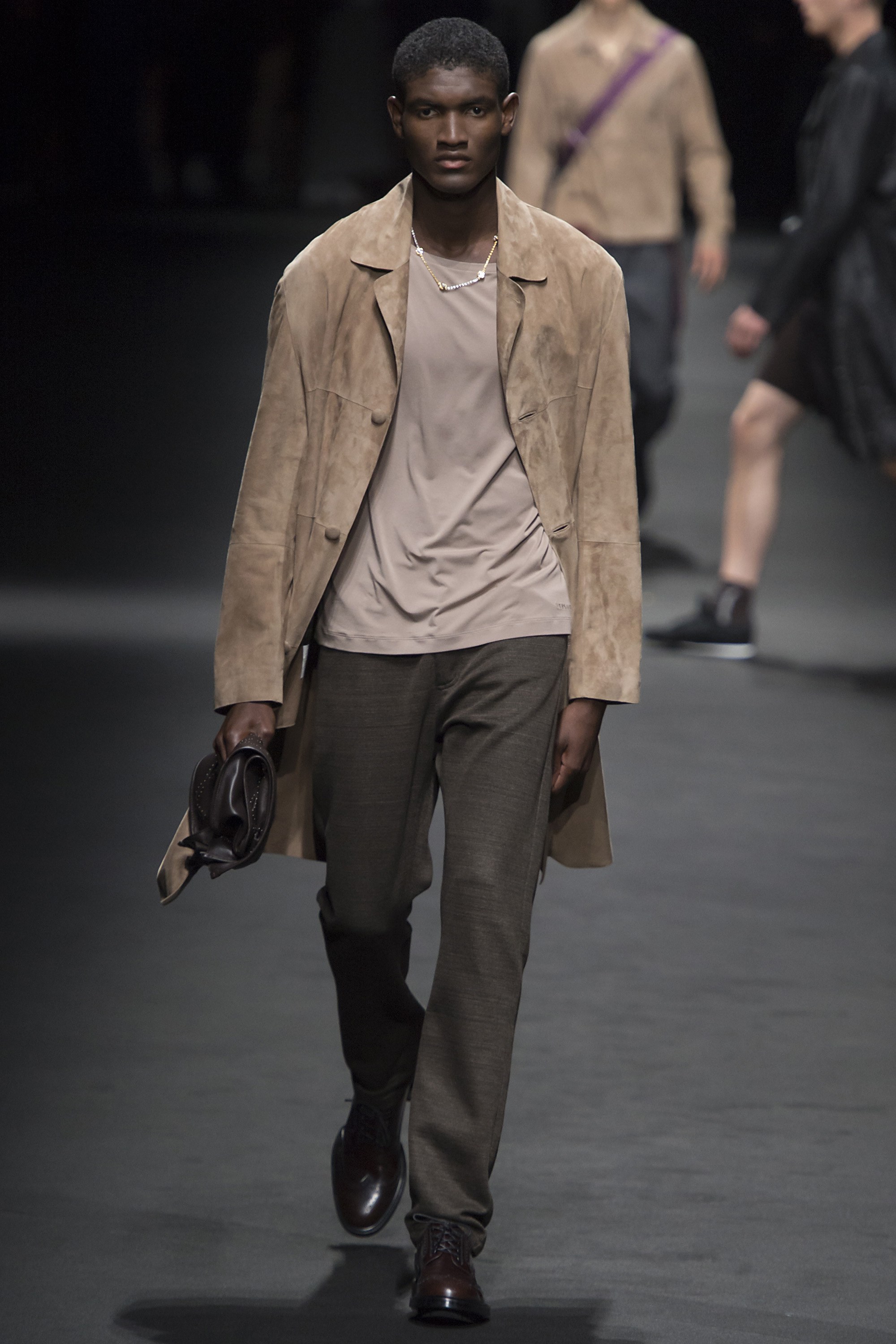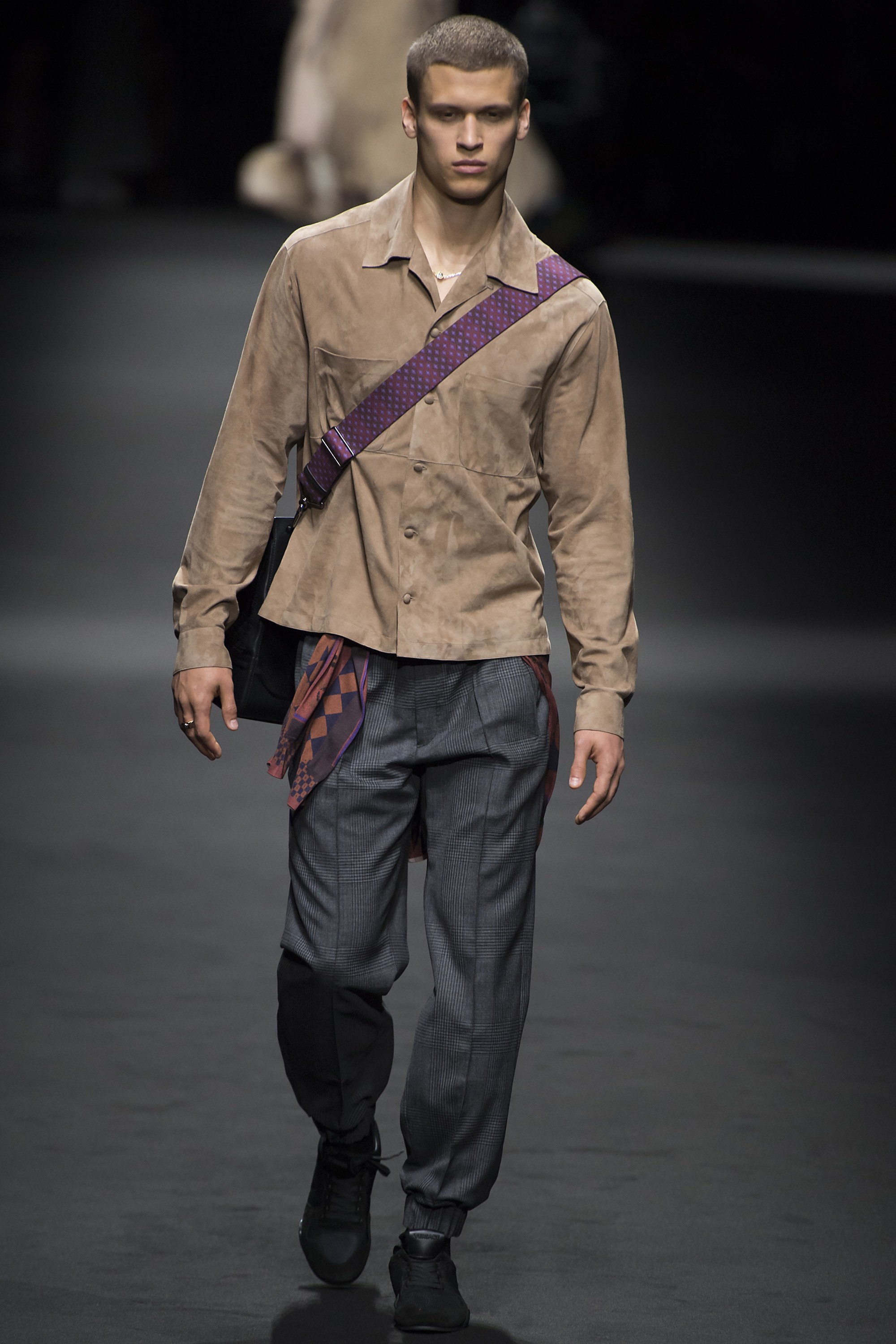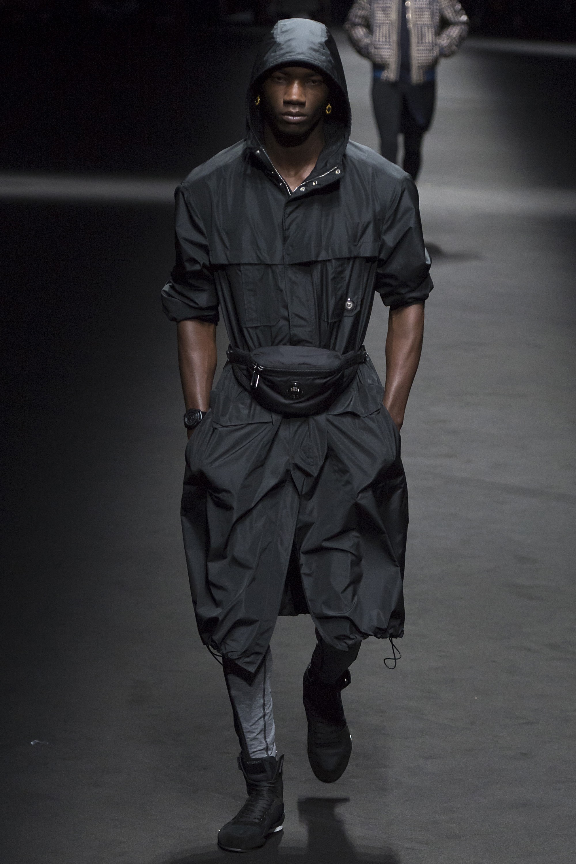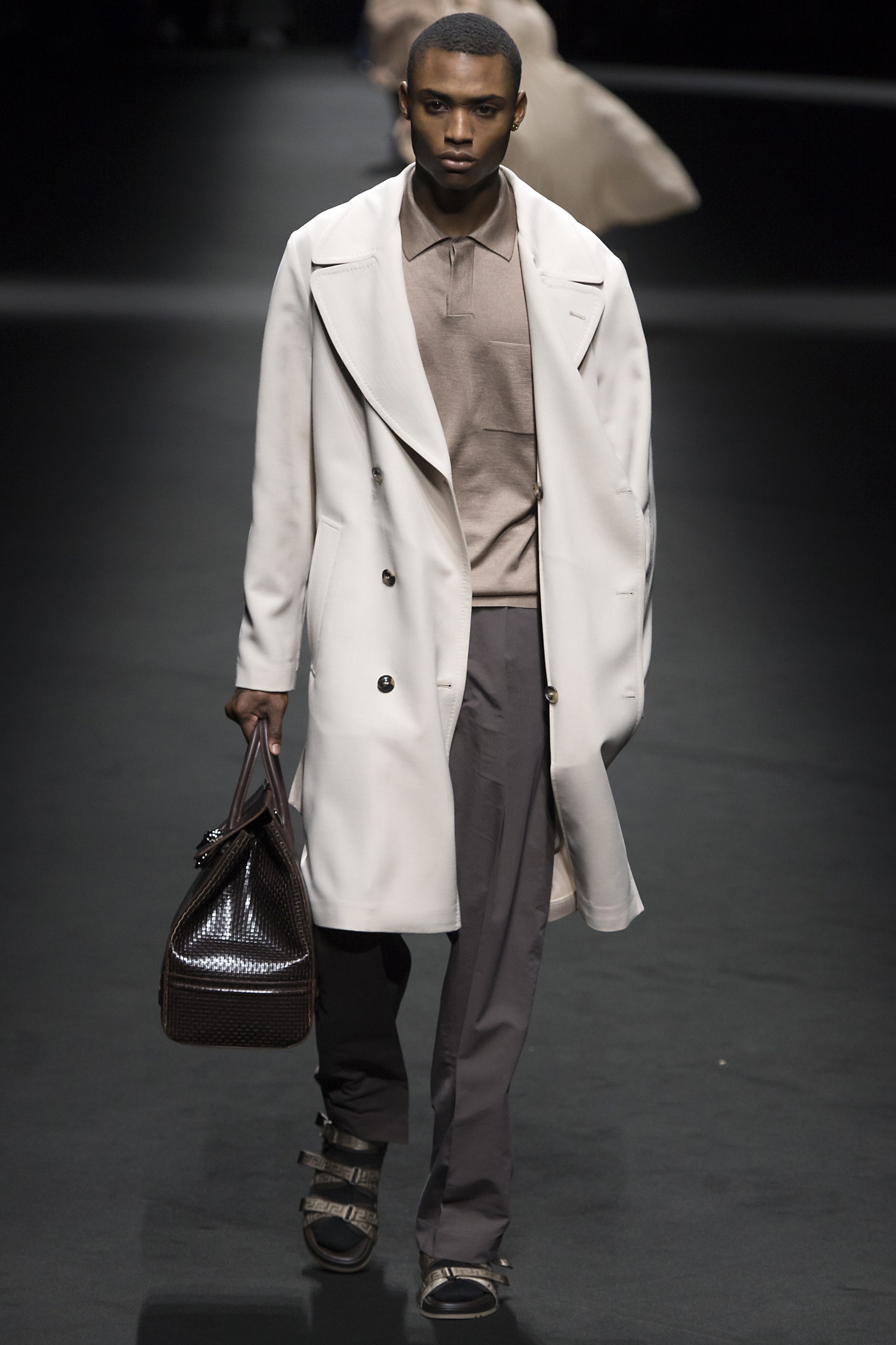 1. Two large screens with the text “Versace Men” framed the runway. Before the show started, a film by Bruce Weber set to a medley of Prince songs was projected on the screens.