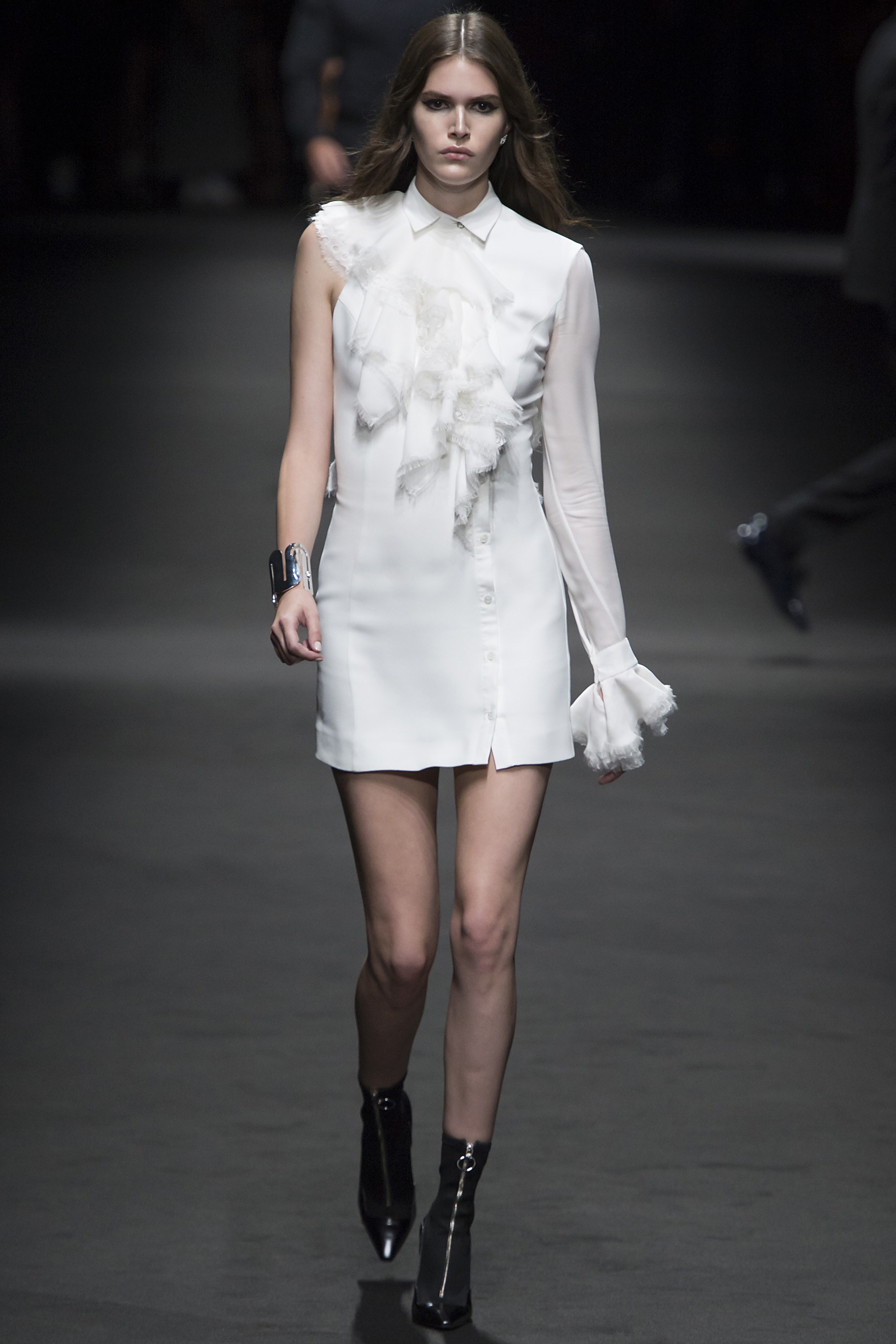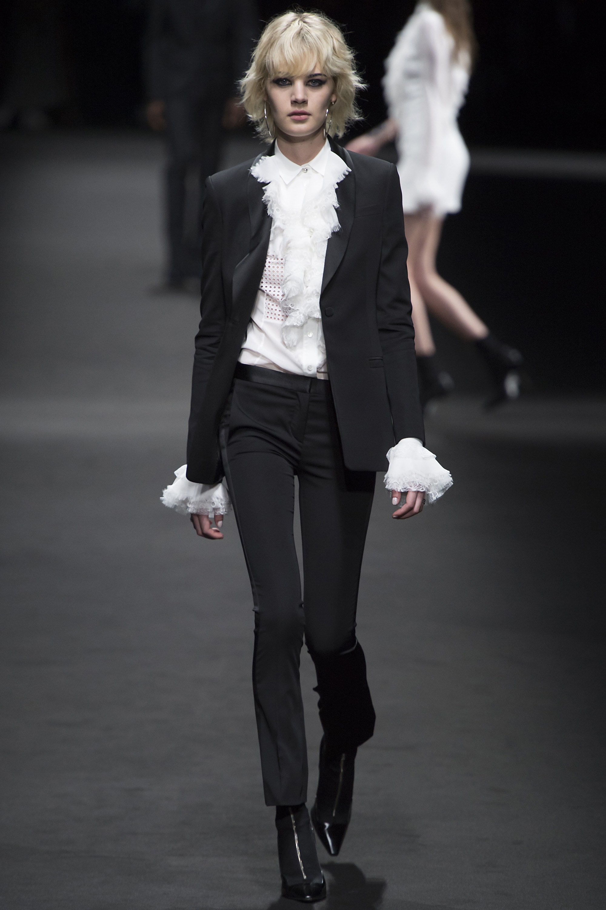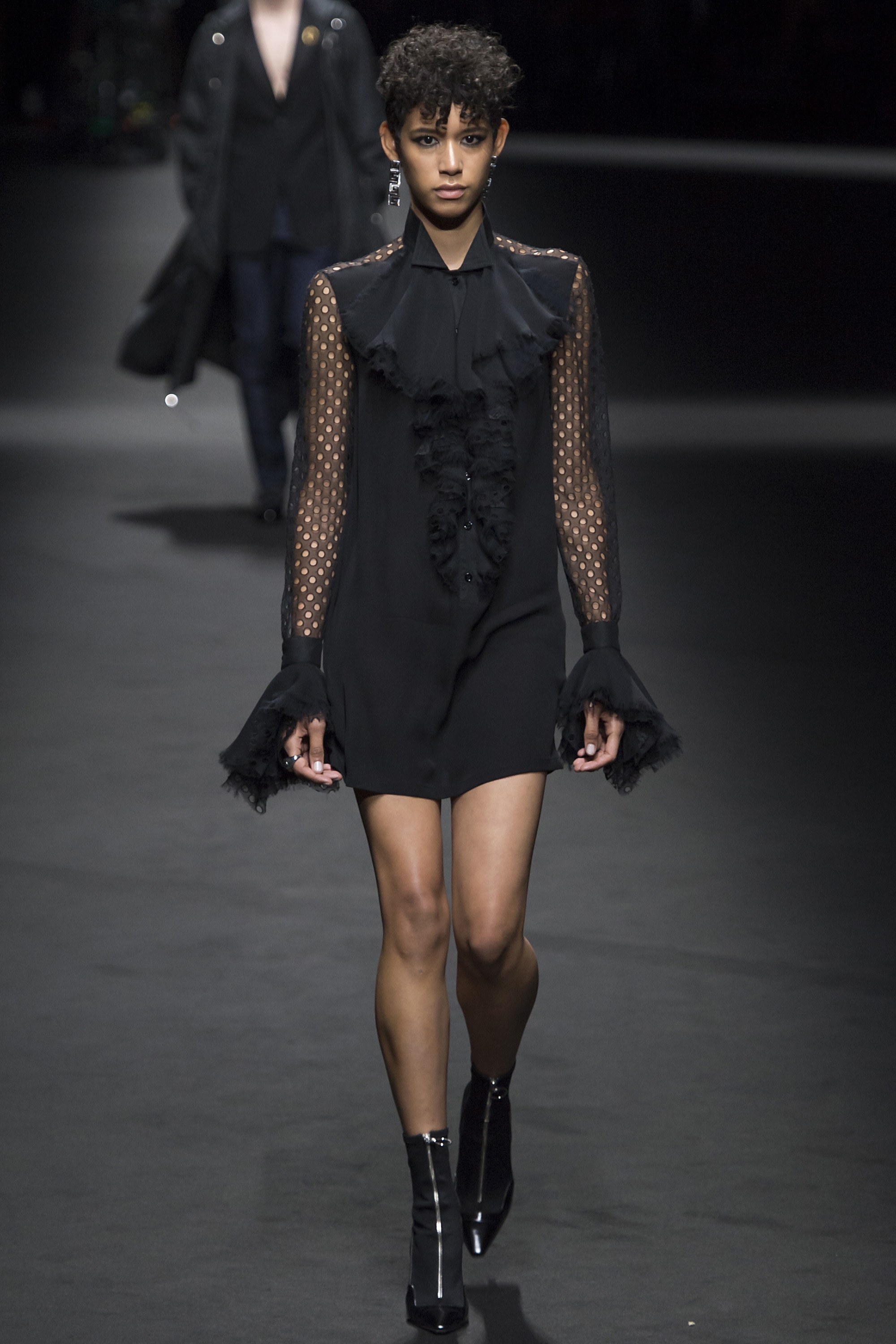 5. Instead of a traditional finale, models formed a straight line across the runway, with Donatella Versace meeting them and bowing in the center. The designer wore a dark purple suit, a tribute to her late friend Prince.
