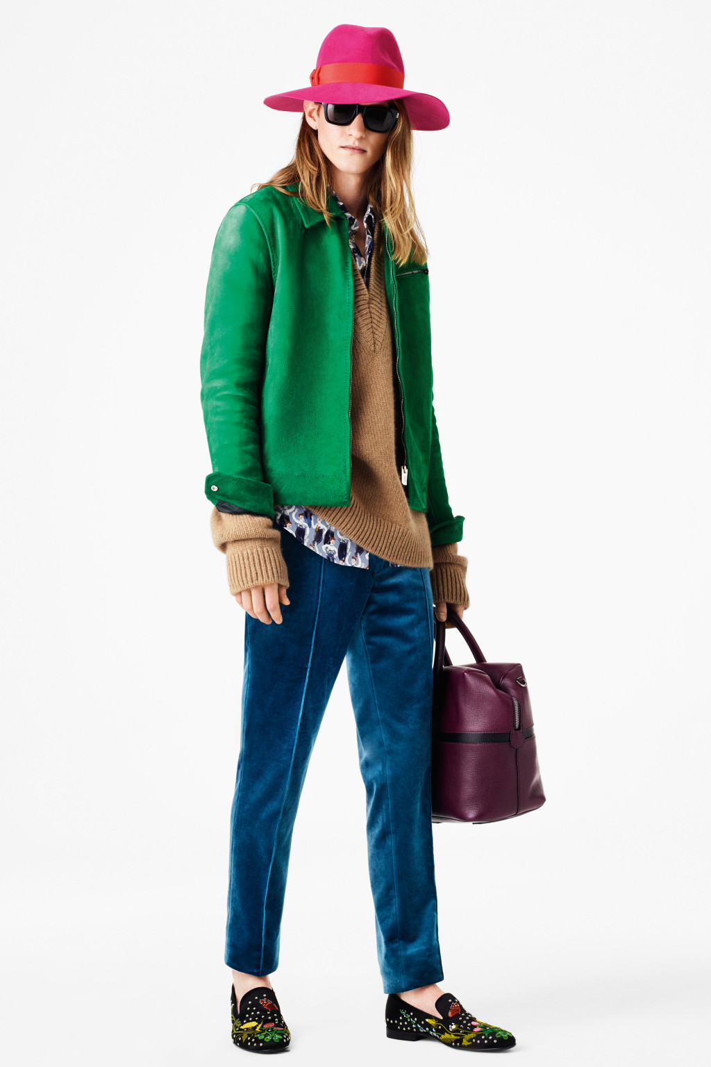 The collection took a psychedelic turn with hot pink and orange ribbed knits, an emerald and yellow geometric patterned kimono, and a bright azure leather motorcycle jacket. A magenta short-sleeved top shot through with shiny yarn completed the eye-popping lineup. It was a beautiful, gutsy outing – although only for the boldest of Bally customers.
