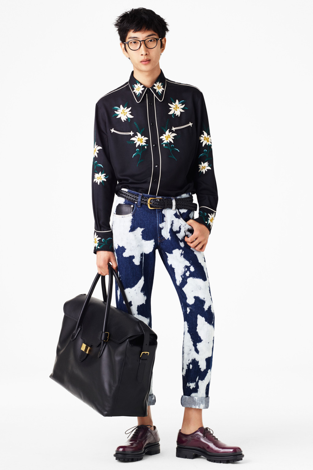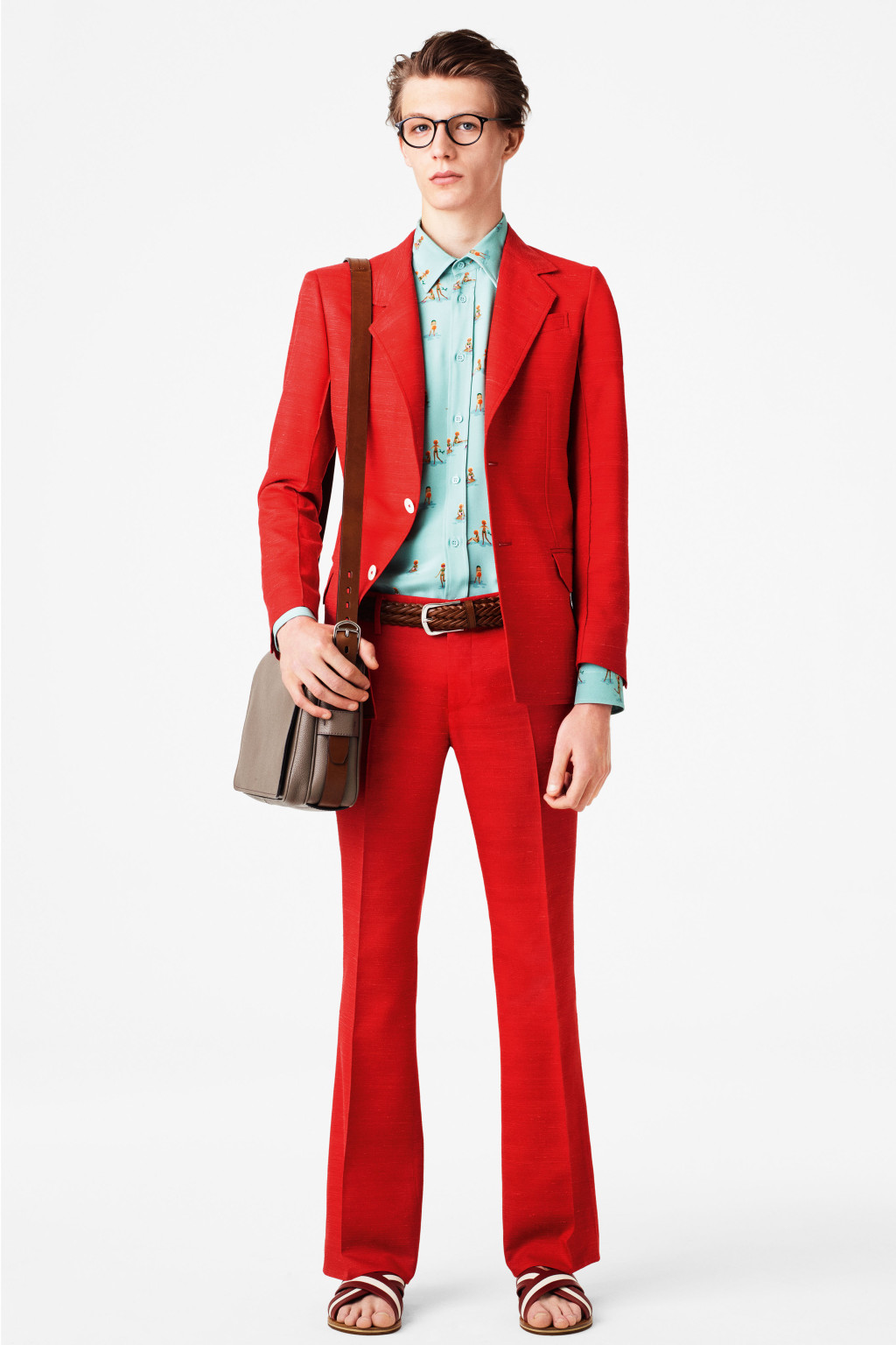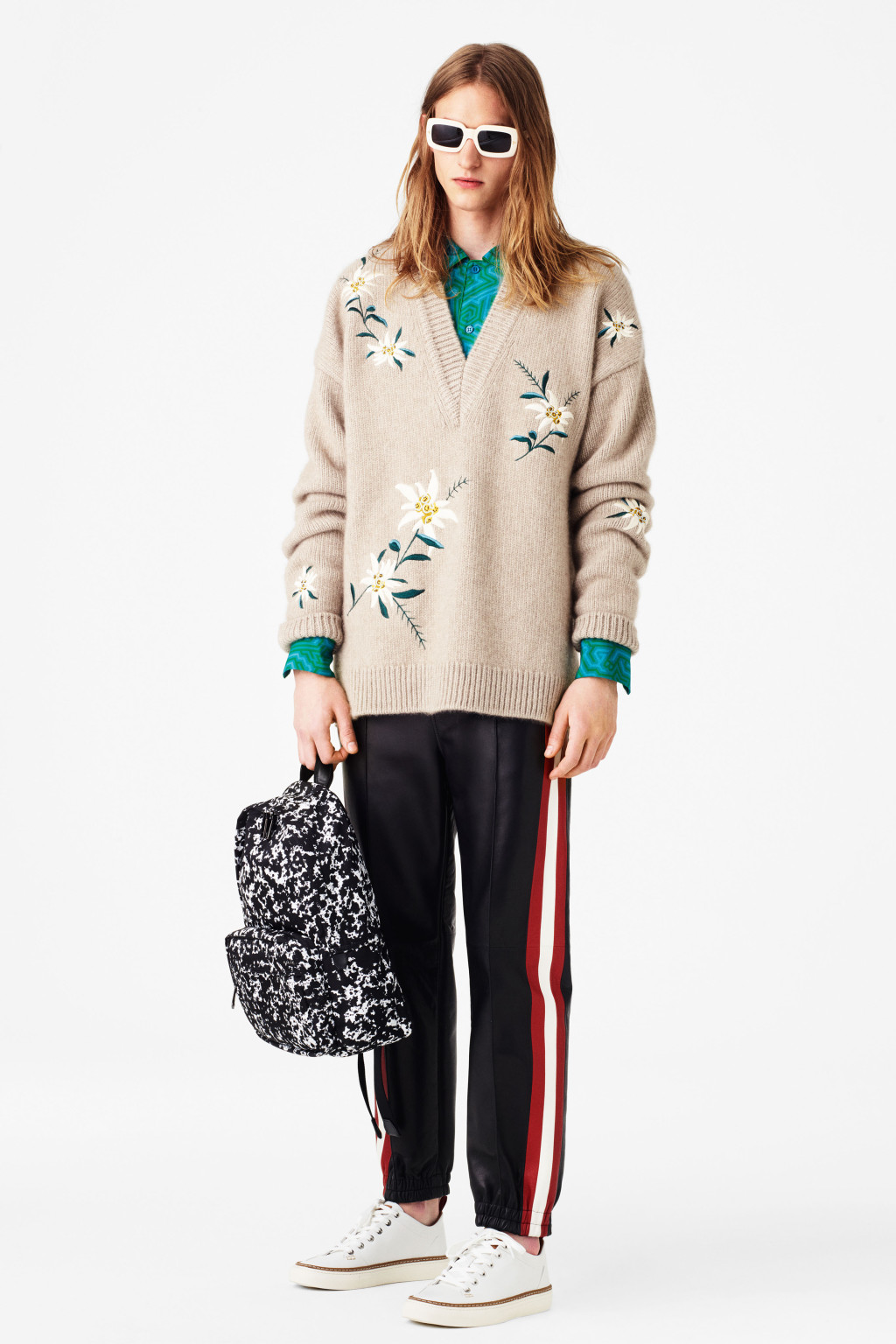 Among the more subdued looks was a fire-engine red linen and silk suit with wide-leg trousers, a lineup of nubby cotton turtlenecks with thick, faded stripes in orange or red, and an 8-ply cashmere v-neck embroidered with edelweiss, a nod to the company’s Swiss pedigree. The flower also also appeared on white leather sneakers, and as one of many patterns for a cool line of lightweight backpacks for spring.