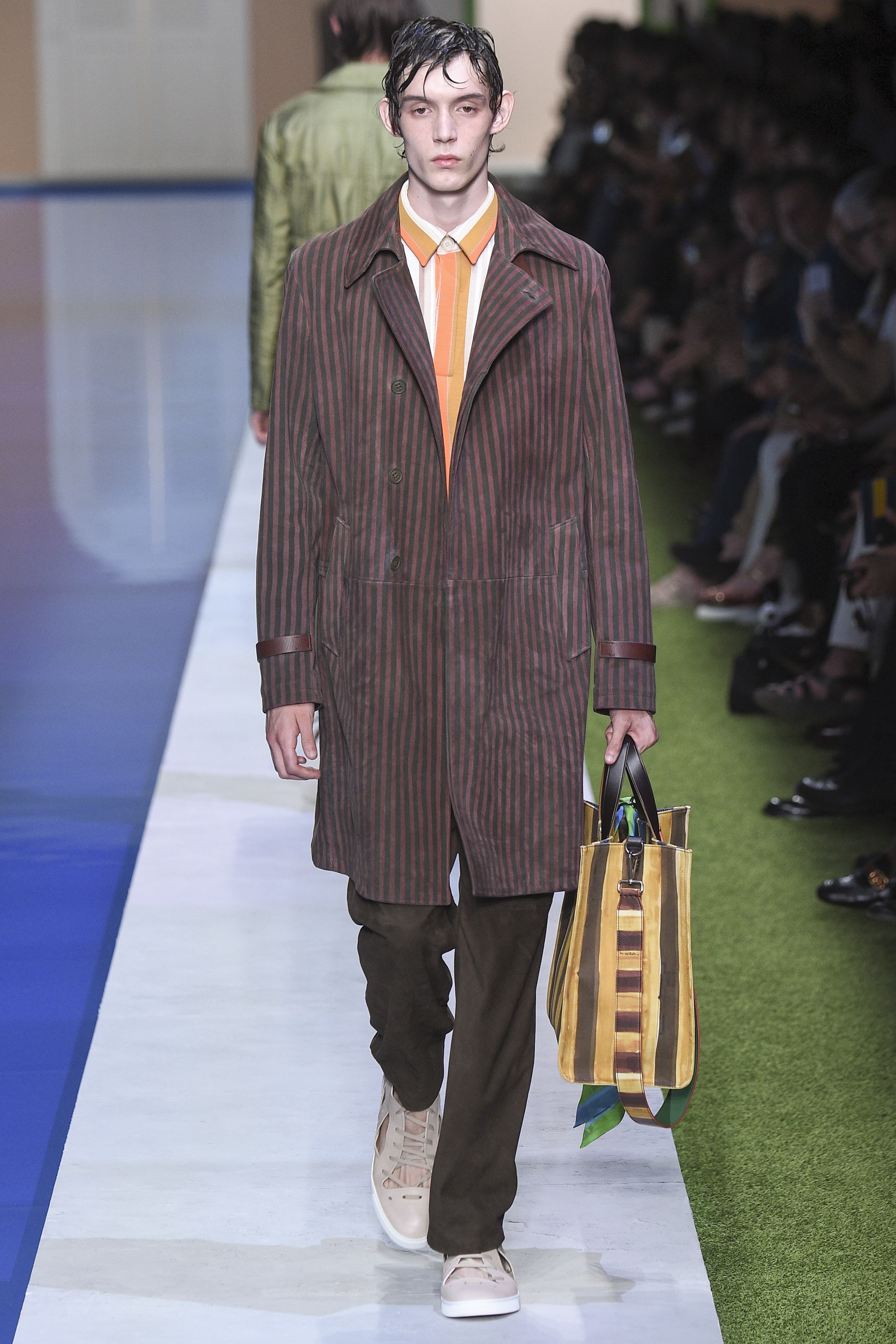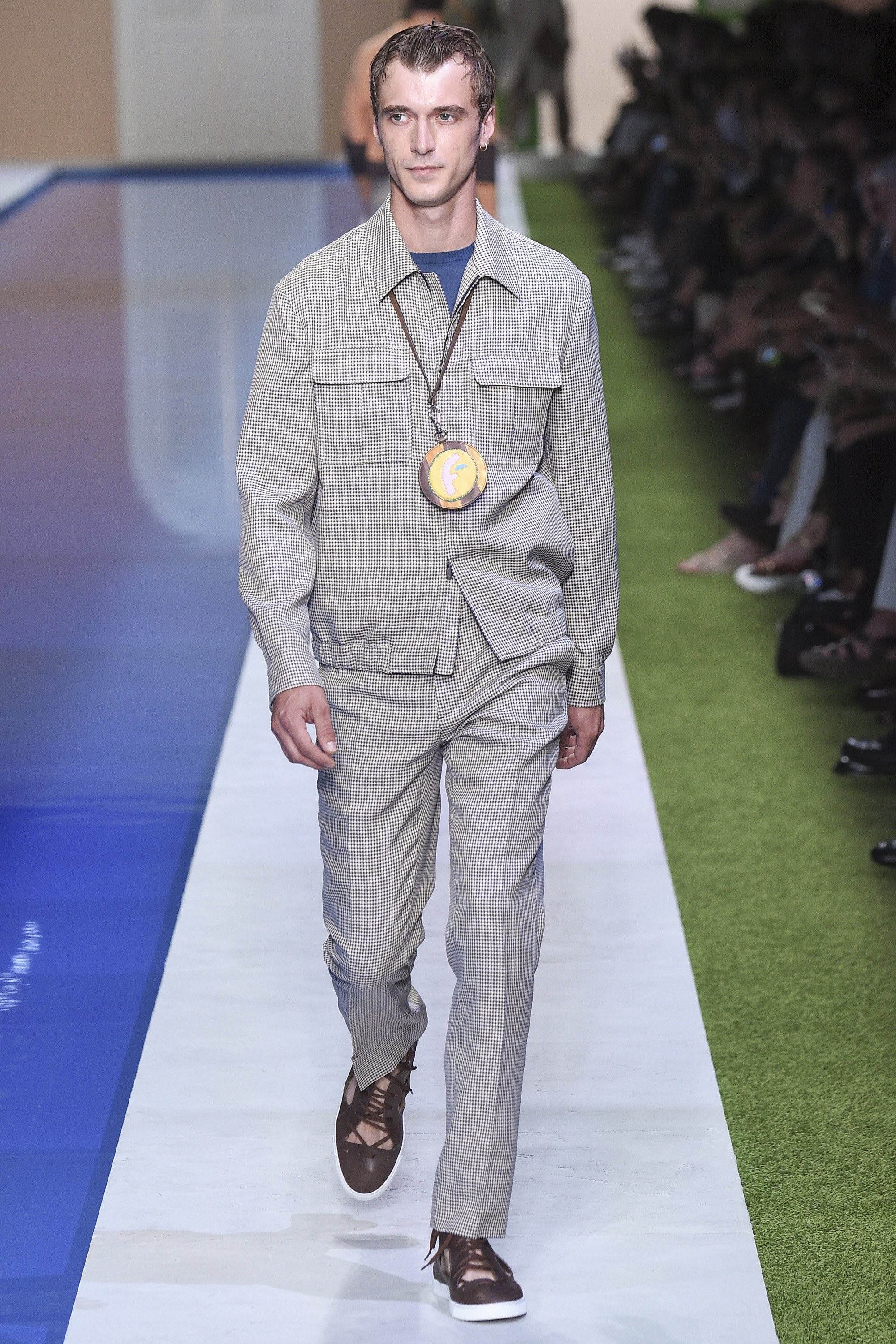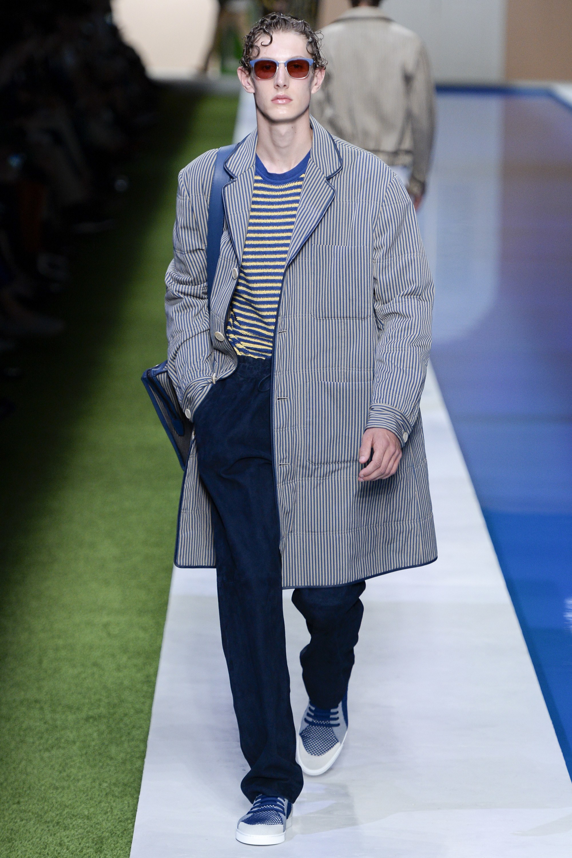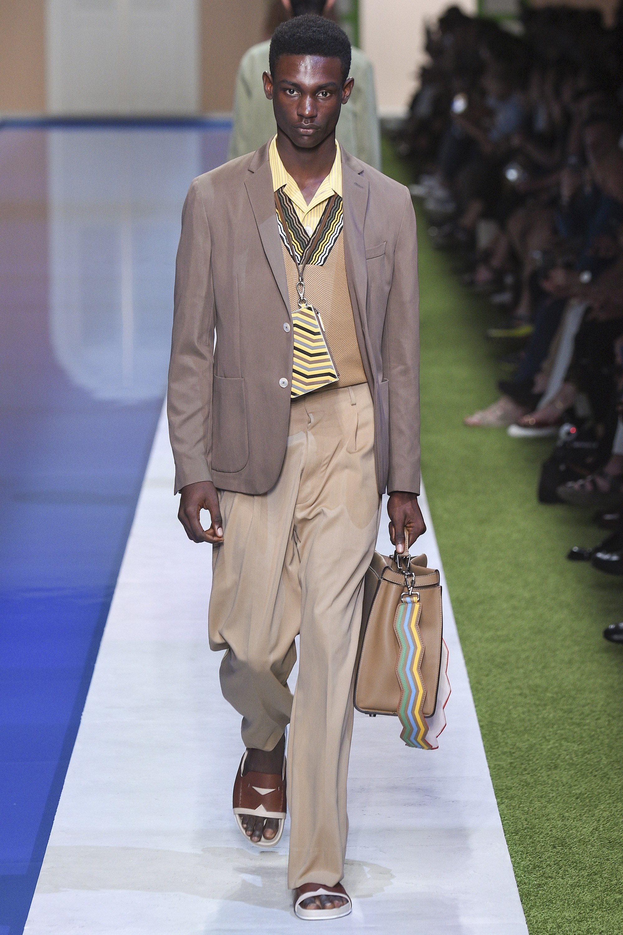 Models circled the periphery of an elongated bright blue lap pool set, feet shod in slides and lugging a range of weekenders and totes in ticking stripes that Fendi revived from the Seventies. The Roman house also debuted its first men’s eyewear collection in collaboration with Safilo, including round retro-inspired shades.