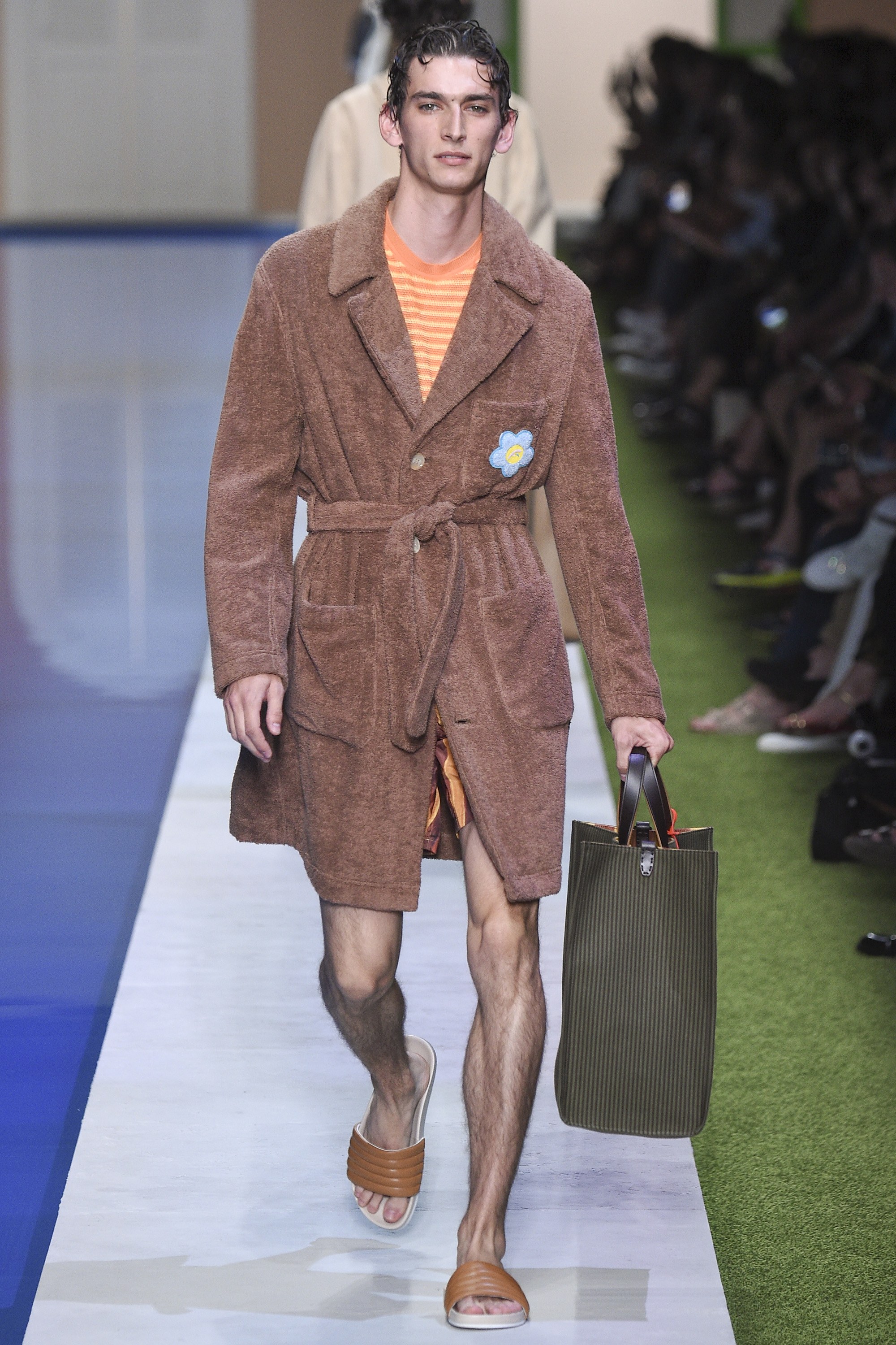 “Sun and fun,” Silvia Venturini Fendi said backstage, wearing a pajamalike shirt in the same painterly stripes she applied to tote bags and cabana shirts that reversed to white terrycloth. She was waiting for someone to ask her if the latter fluff was shearling.