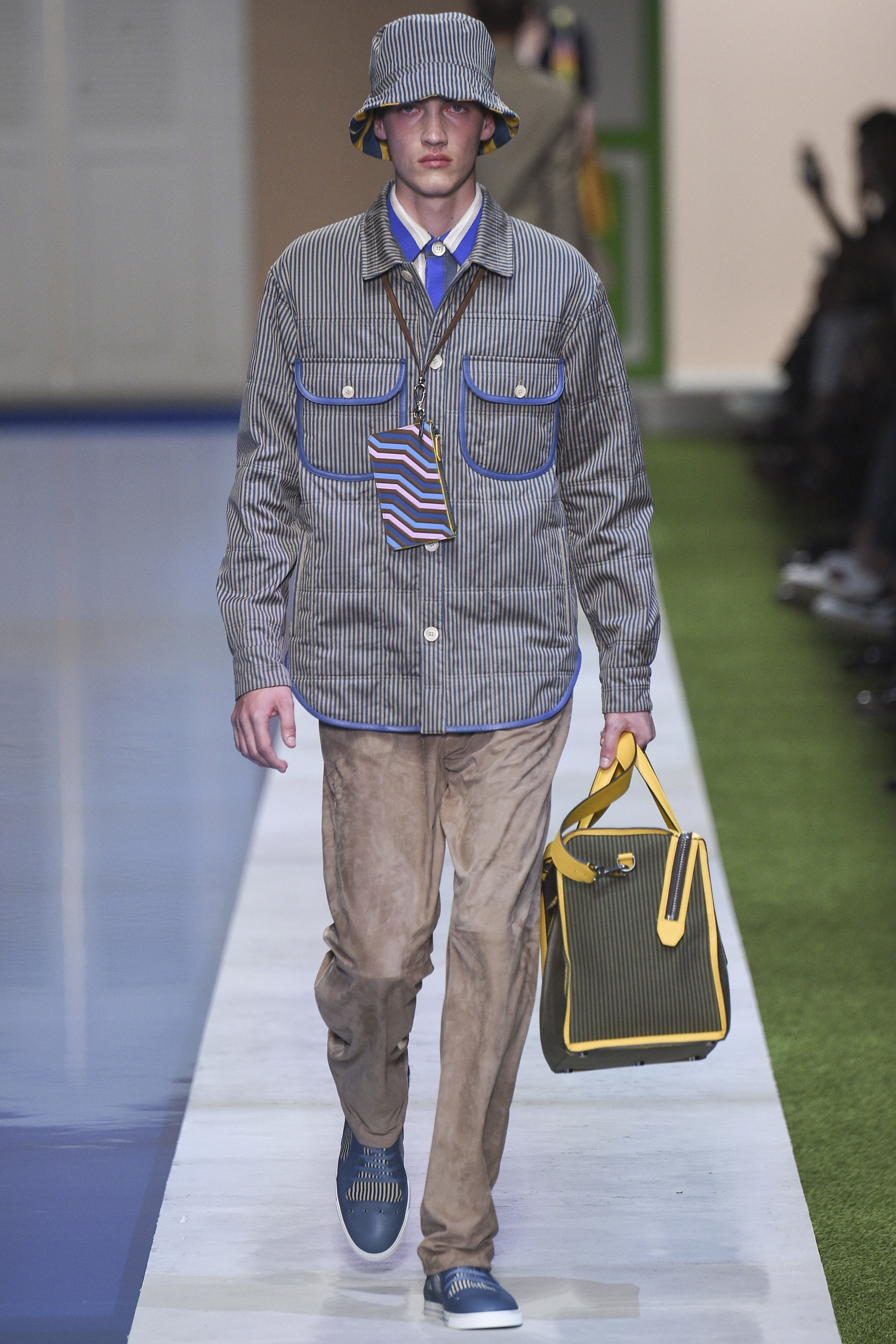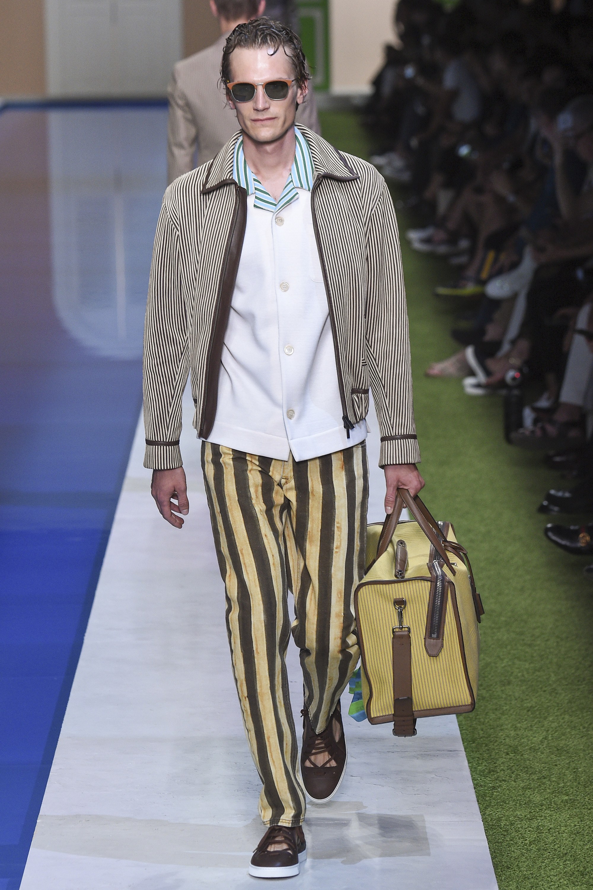 Models circled the periphery of an elongated bright blue lap pool set, feet shod in slides and lugging a range of weekenders and totes in ticking stripes that Fendi revived from the Seventies. The Roman house also debuted its first men’s eyewear collection in collaboration with Safilo, including round retro-inspired shades.