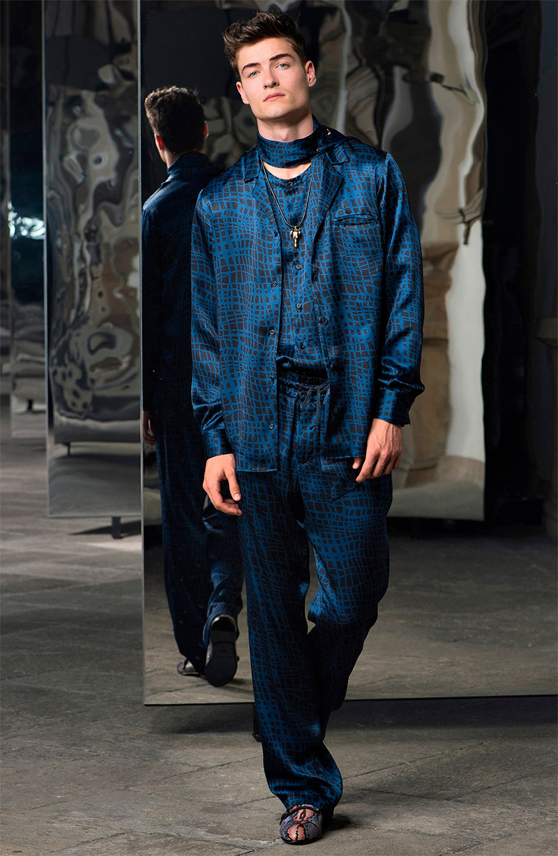 The idea of role-playing also translated into a print that showed an antique chalk mask with a bold red brush stroke over it. Contradiction is further exemplified by formal jackets and vests juxtaposed with jogging pants and materials such as Neoprene and raw linen that contrasted with denim and suede. Trussardi also reworked python leather pants with a touch of Bohemian dandyism.