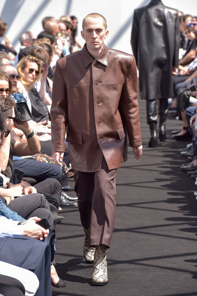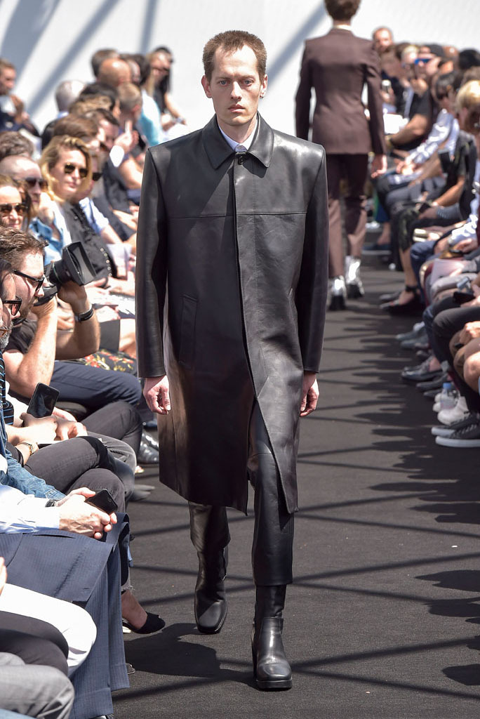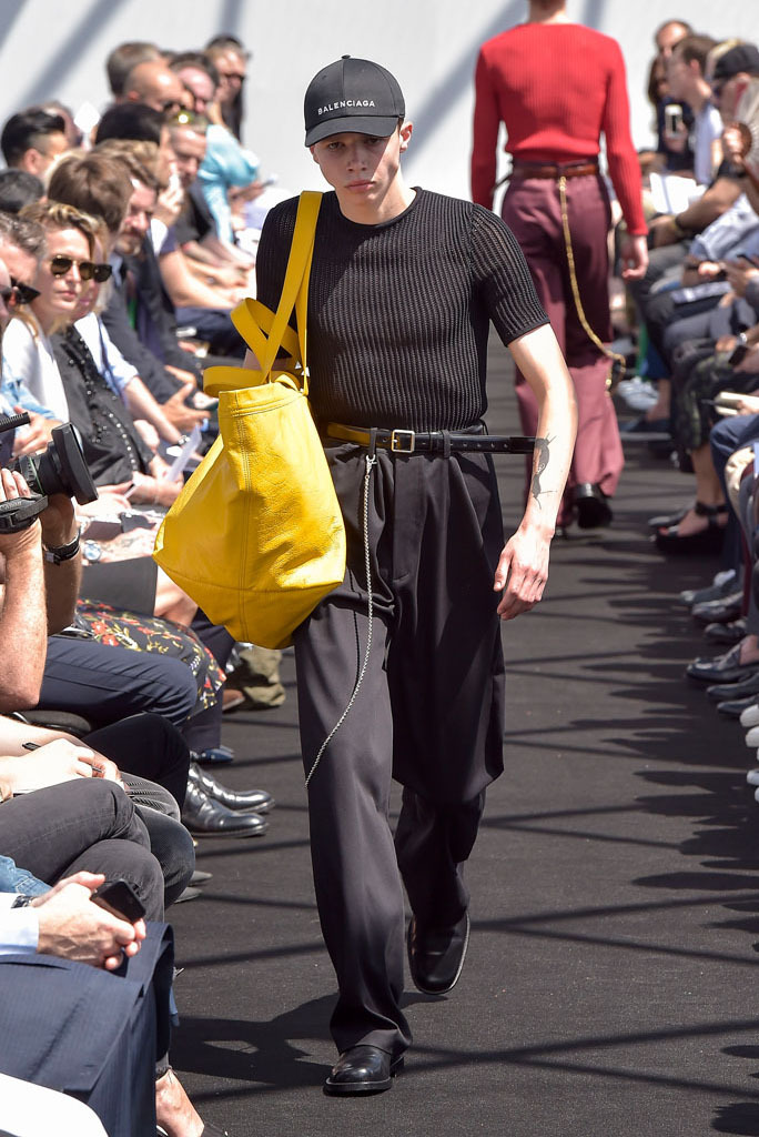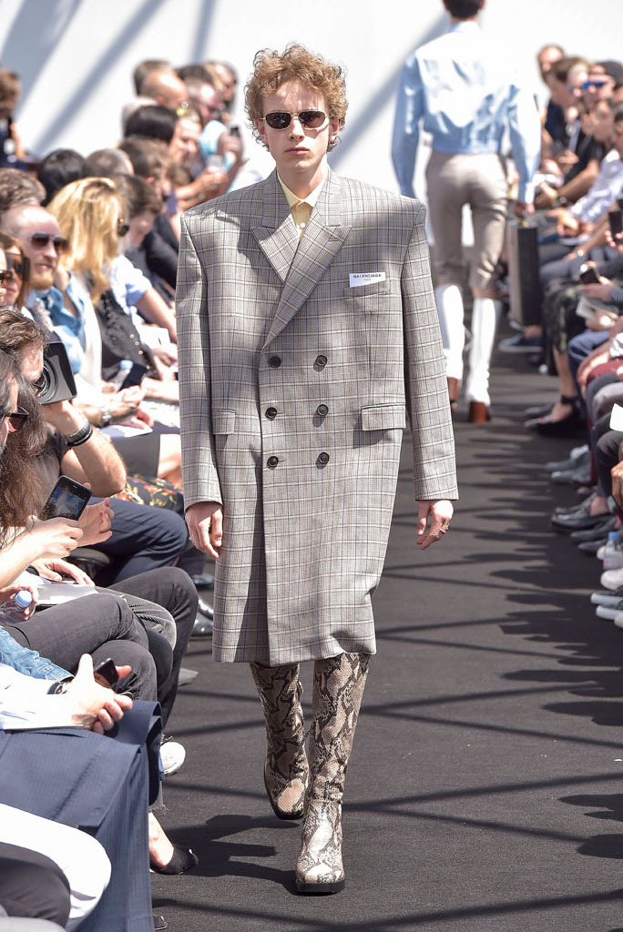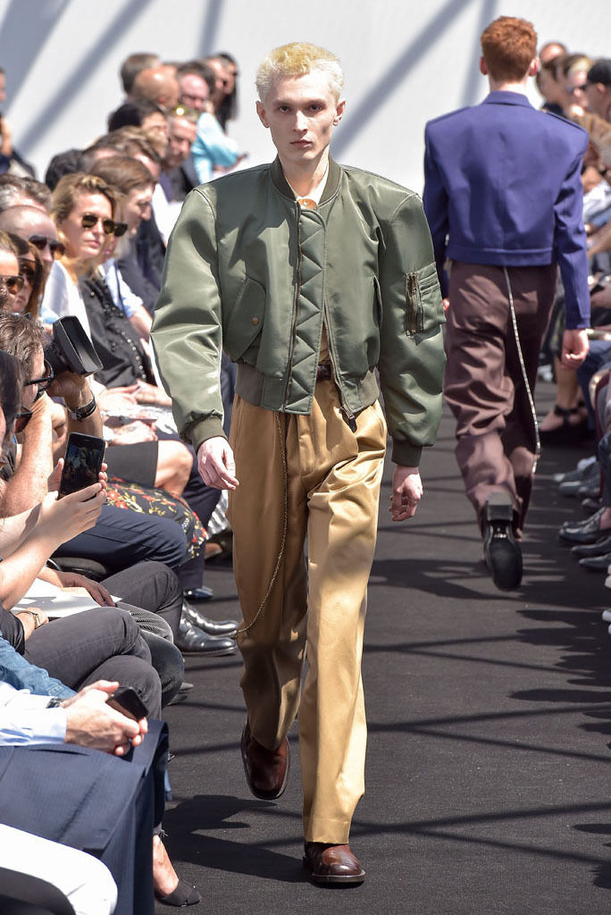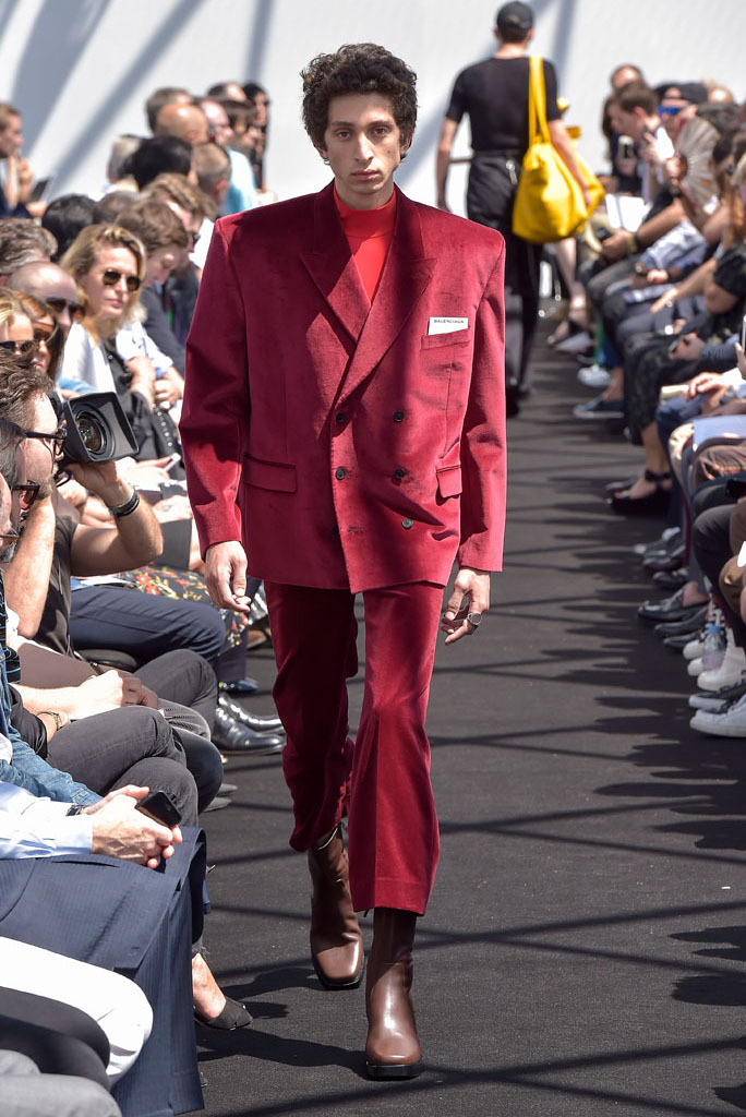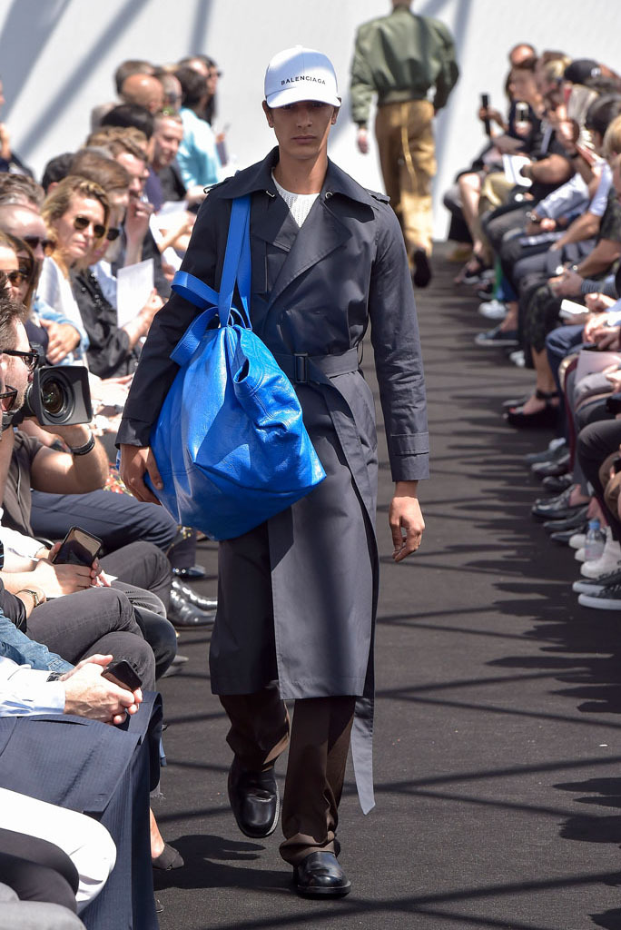 He certainly did. It wasn’t just the extremity of the garments, but the entire proposition of a highly fashioned, emphatically different silhouette for menswear and tailoring, to boot. In a few short minutes, Gvasalia managed to elucidate an erstwhile elusive men’s identity for the house. Granted, all those coats were unusual to see for an ostensibly Spring show—especially as Gvasalia returned to traditional tailoring techniques of canvased interlinings. It gave the collection a weight—not only intellectual, but physical. He felt it was important to lend the fabrics a new hand. “I wanted a feel of formality, of perfection, to everything,” he said. Hence, the sharp shoulder was translated into a casual wardrobe, jutting out of Harrington and MA-1 bomber jackets. They looked fantastic.