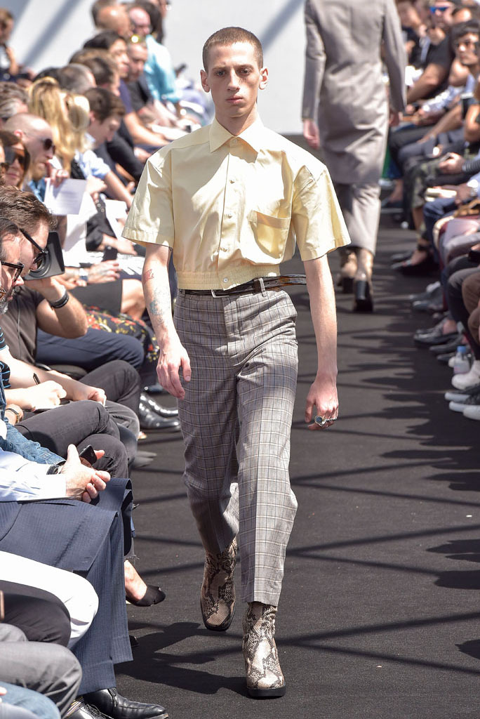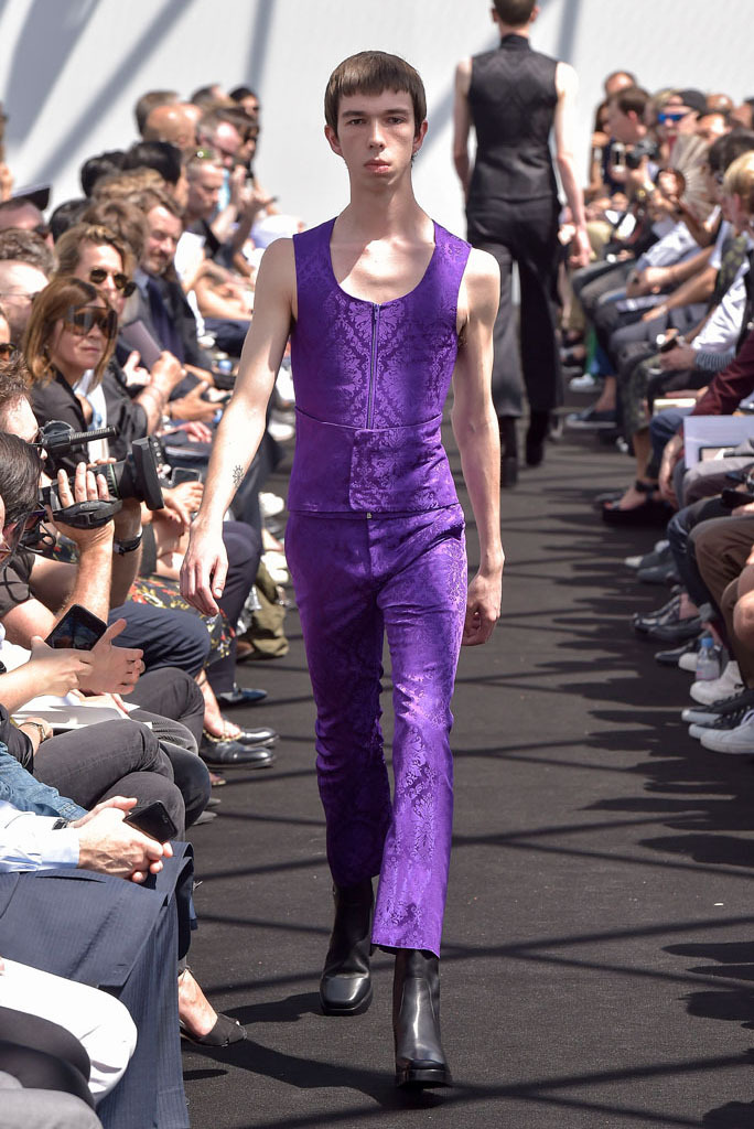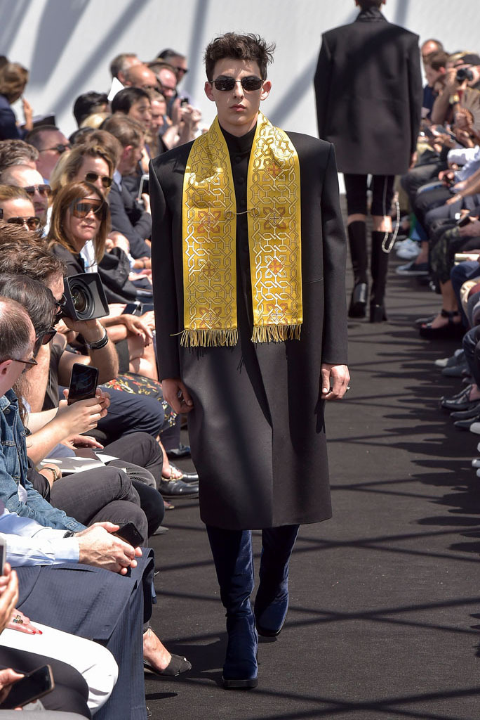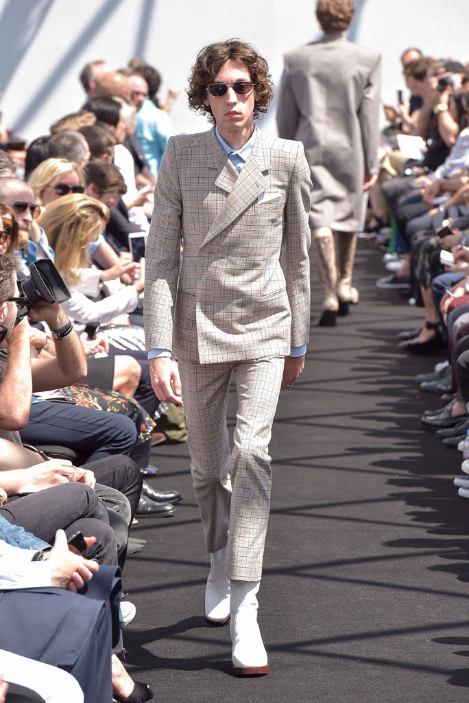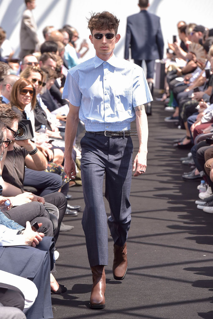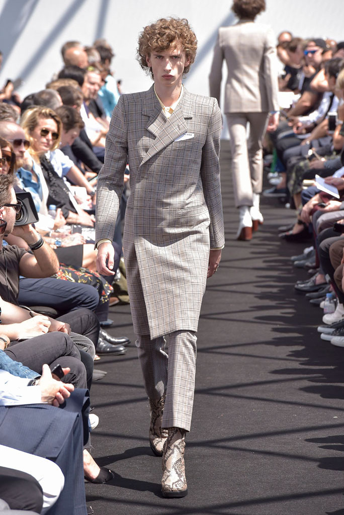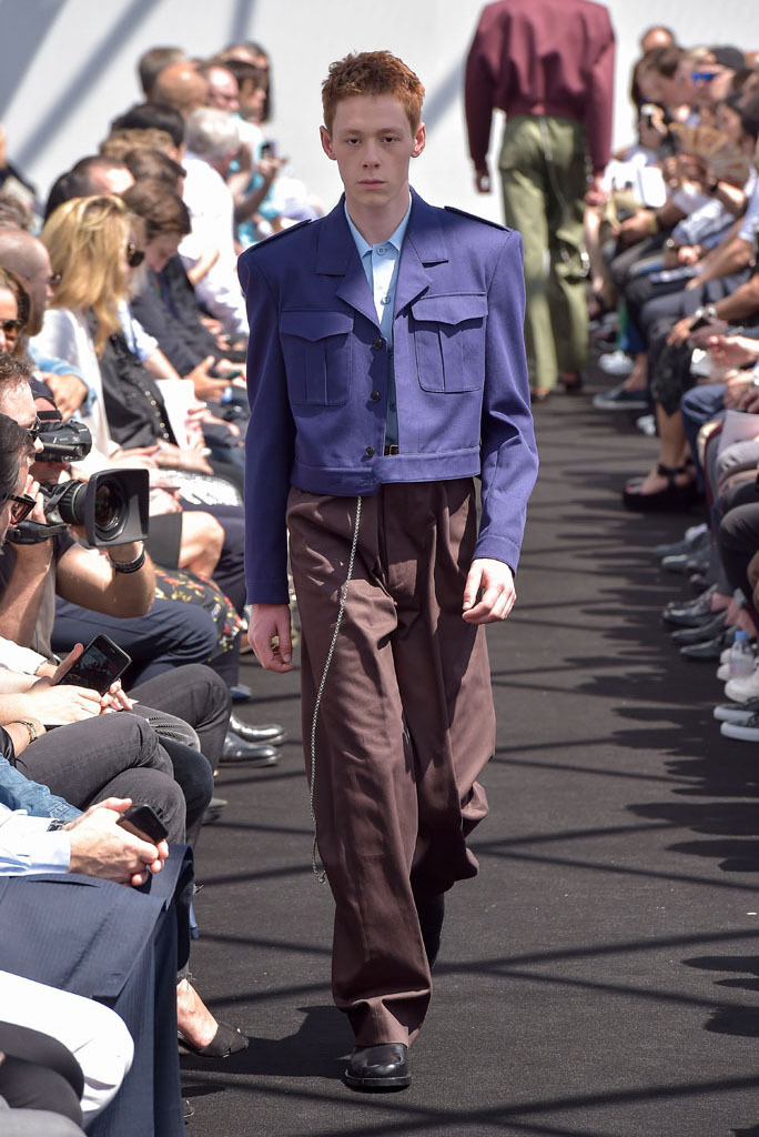 He certainly did. It wasn’t just the extremity of the garments, but the entire proposition of a highly fashioned, emphatically different silhouette for menswear and tailoring, to boot. In a few short minutes, Gvasalia managed to elucidate an erstwhile elusive men’s identity for the house. Granted, all those coats were unusual to see for an ostensibly Spring show—especially as Gvasalia returned to traditional tailoring techniques of canvased interlinings. It gave the collection a weight—not only intellectual, but physical. He felt it was important to lend the fabrics a new hand. “I wanted a feel of formality, of perfection, to everything,” he said. Hence, the sharp shoulder was translated into a casual wardrobe, jutting out of Harrington and MA-1 bomber jackets. They looked fantastic.