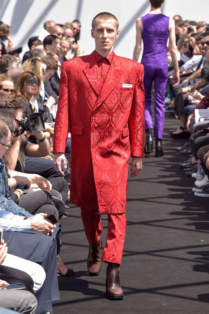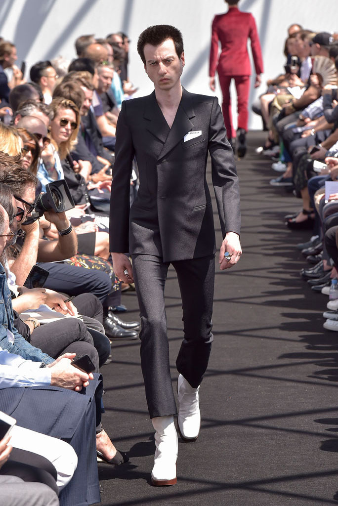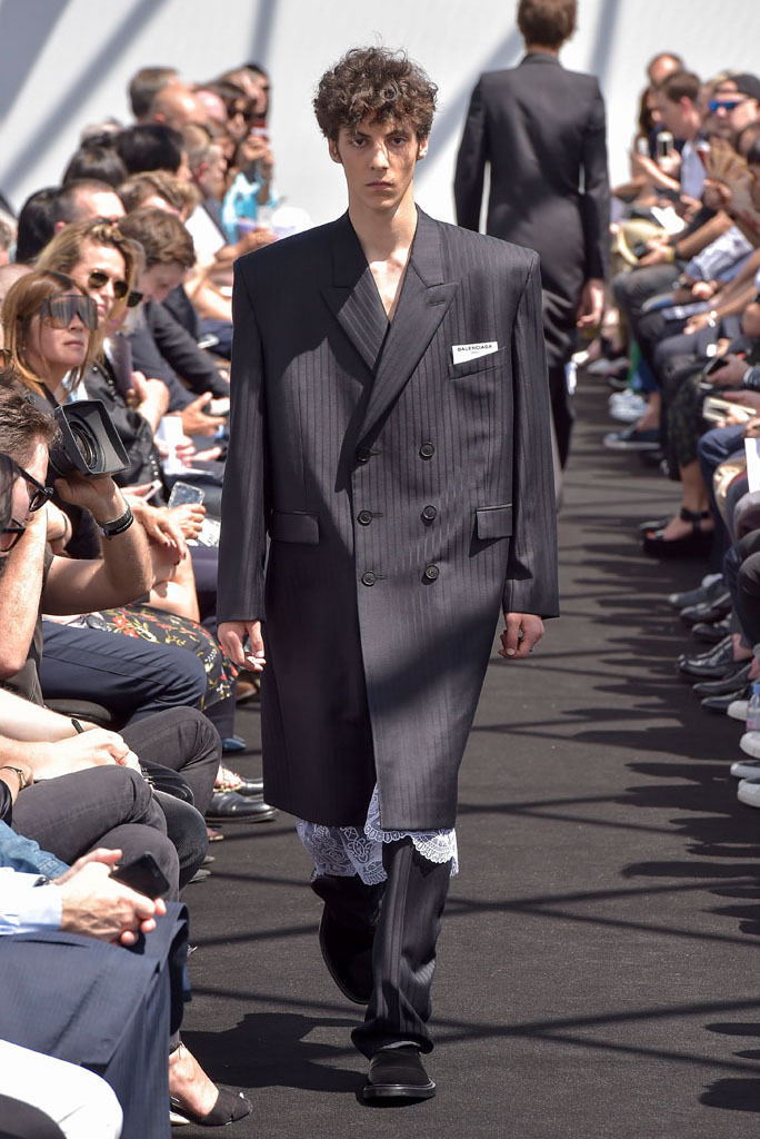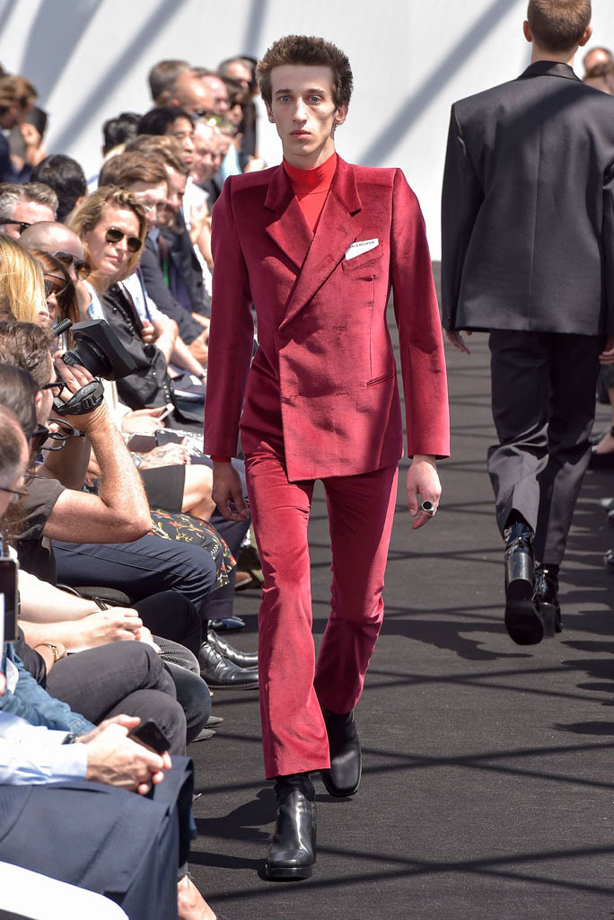Demna Gvasalia has spent much time poring through the Balenciaga archives since he joined the house last October. Under his direction, the Pre-Fall lookbook was apparently shot there, while his first womenswear collection reinterpreted the attitudes found in Cristóbal Balenciaga’s haute couture for everyday clothes of today. While pawing through the shrouded racks of gazar, cocoon-backs, and three-quarter sleeves for her, Gvasalia found a coat. It was Cristóbal’s own, made by his own hands. He never finished it. So his latest heir decided it was his job to complete it—and it opened this show.That coat was not only the basis for the tailoring of the unfitted jackets that made up half of this show; it was also a fitting metaphor for its entirety. No pun on fitting, although fit was what the collection was all about. In every breast pocket sat a small piece of card you’d be forgiven for thinking was a pocket square. Gvasalia asserted they were the fitting cards used to record the measurements of clients in bespoke tailoring. That’s the closest menswear ever gets to haute couture, and Gvasalia chose to use it as his jumping-off point for this, the house of Balenciaga’s first-ever men’s runway show.