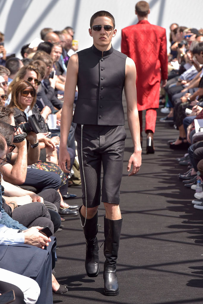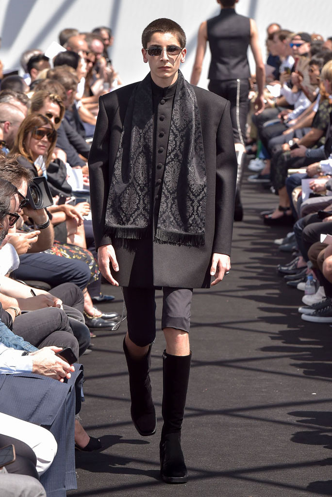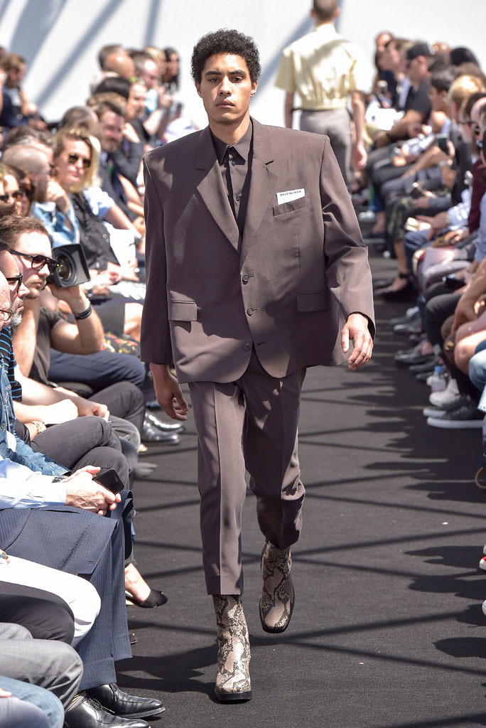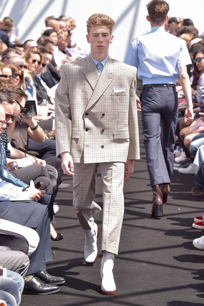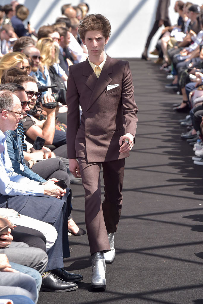 Demna Gvasalia has spent much time poring through the Balenciaga archives since he joined the house last October. Under his direction, the Pre-Fall lookbook was apparently shot there, while his first womenswear collection reinterpreted the attitudes found in Cristóbal Balenciaga’s haute couture for everyday clothes of today. While pawing through the shrouded racks of gazar, cocoon-backs, and three-quarter sleeves for her, Gvasalia found a coat. It was Cristóbal’s own, made by his own hands. He never finished it. So his latest heir decided it was his job to complete it—and it opened this show.That coat was not only the basis for the tailoring of the unfitted jackets that made up half of this show; it was also a fitting metaphor for its entirety. No pun on fitting, although fit was what the collection was all about. In every breast pocket sat a small piece of card you’d be forgiven for thinking was a pocket square. Gvasalia asserted they were the fitting cards used to record the measurements of clients in bespoke tailoring. That’s the closest menswear ever gets to haute couture, and Gvasalia chose to use it as his jumping-off point for this, the house of Balenciaga’s first-ever men’s runway show.