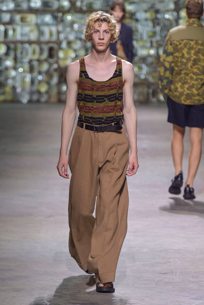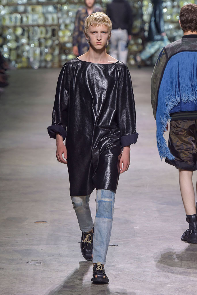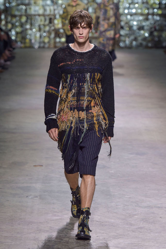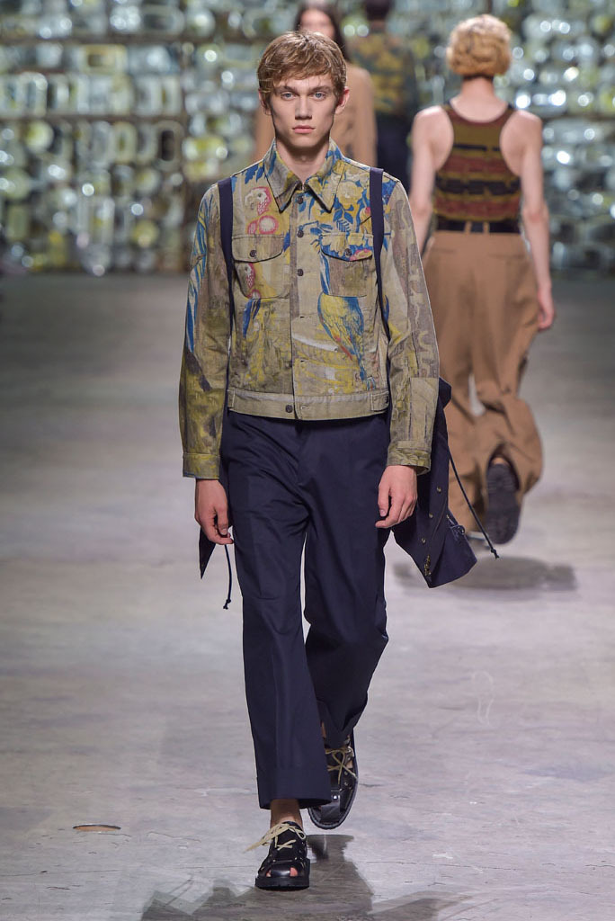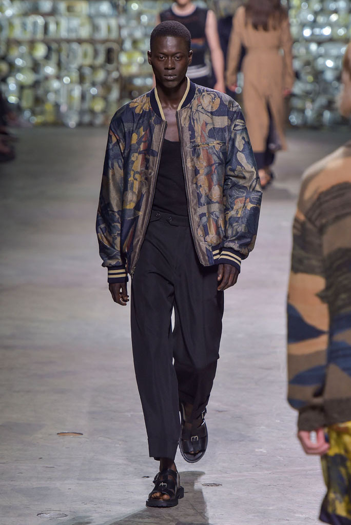 Van Noten was at his best when he played with hybrid looks: Rendering tank tops as knitted sweaters minus the sleeves, or mixing panels of tapestry prints with metallic technical fabrics to produce sporty-cool jackets. The juxtaposition between smooth surfaces and rough, unfinished constructions, meanwhile, has been a growing trend this season.