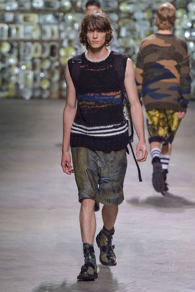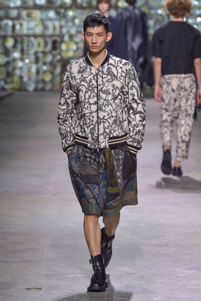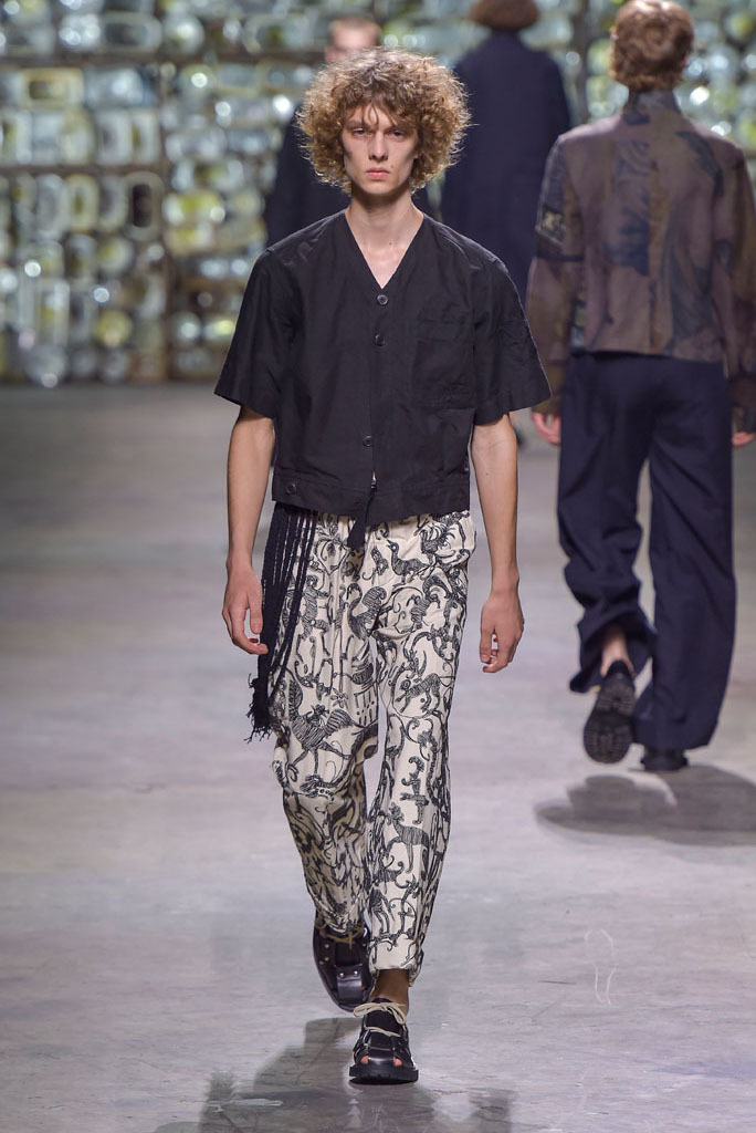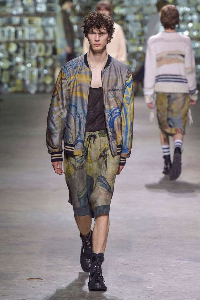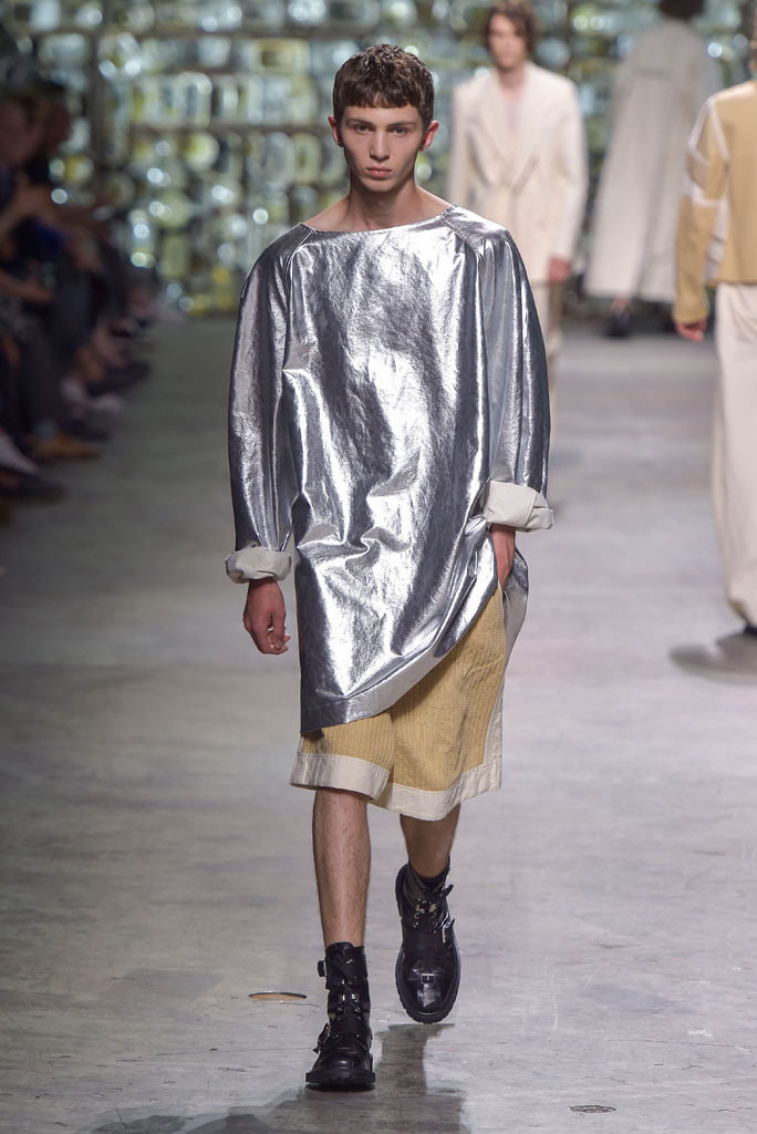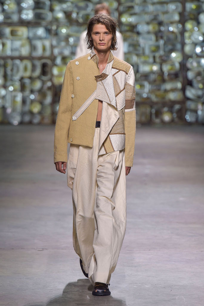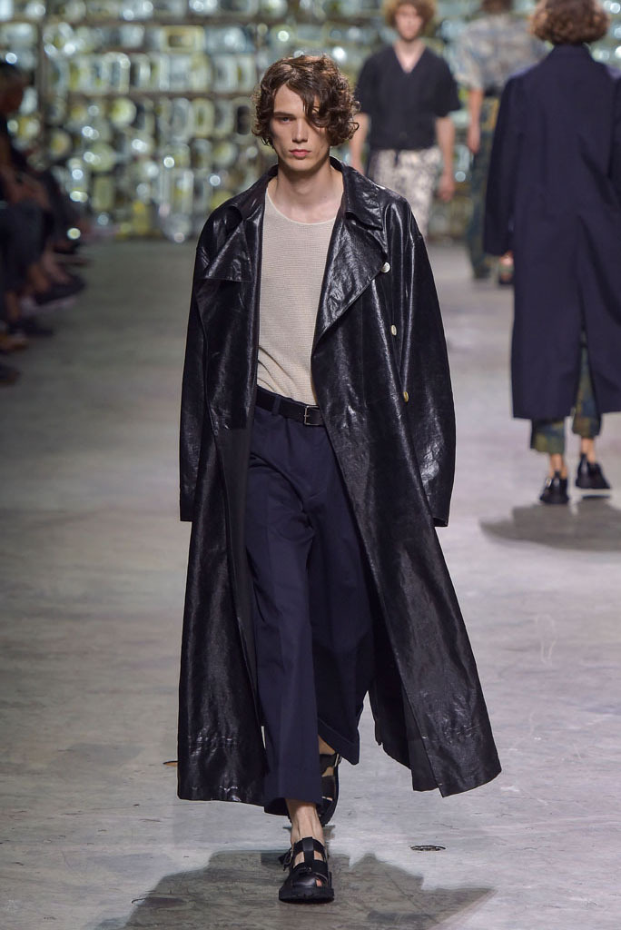 Van Noten was at his best when he played with hybrid looks: Rendering tank tops as knitted sweaters minus the sleeves, or mixing panels of tapestry prints with metallic technical fabrics to produce sporty-cool jackets. The juxtaposition between smooth surfaces and rough, unfinished constructions, meanwhile, has been a growing trend this season.