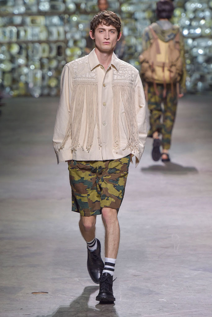 Belted trenchcoats and high-waisted full-length pants, some of which had enough leg-room to fit two in, were familiar categories but still compelling ones — the type that have blessed the designer with a loyal following. There was a whiff of soft military, too, as the prints gradually grew into camouflage patterns, as seen on cropped carrot pants and utility jackets. To contrast, it was unclear where the designer was heading with a series of outerwear options boasting long fringy tassels, clearly inspired by Kelmscott’s noble interior but which would be unlikely to jibe with the cool kids on the streets.