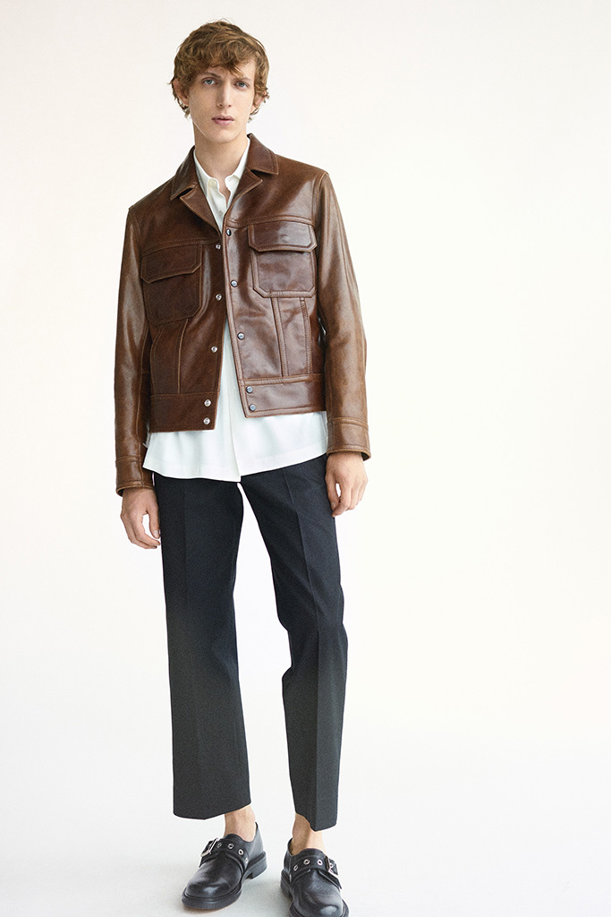 The vintage vibe carried through into a Fifties-style, red silk zip-up jacket with front pockets, and a brown leather car coat in a distressed patina that was matched on chunky brogues. For a more casual look, the label offered cropped track pants with a signature “S” embroidered over one hip.