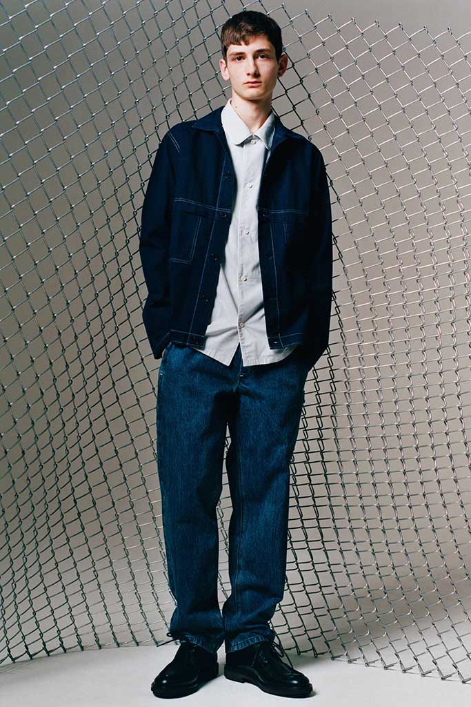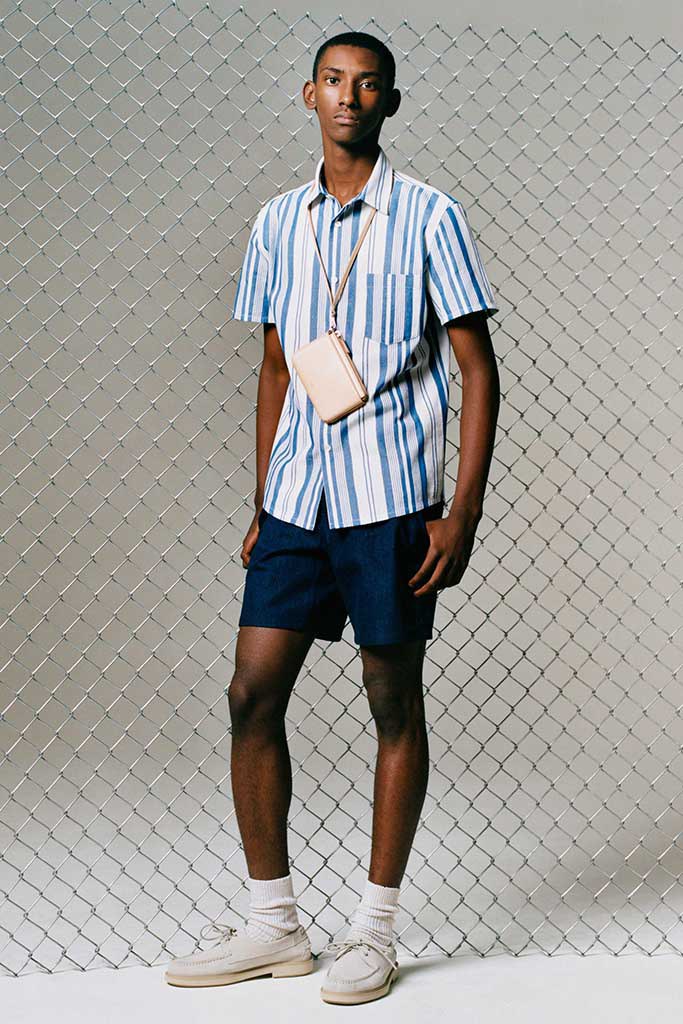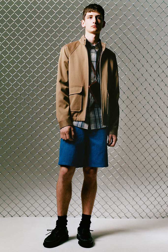 Less preppy than the label’s recent collections, the collection focused heavily on baggy overalls in a range of washed-out denim or railway-striped canvases. These were paired with loose ribbed sweaters printed tone on tone so they looked to be bleached by the sun and wide shirt-style jackets with a workwear feel. There were still elements of the almost gauche rigidity that has become part of the brand’s geek-chic signature, nevertheless, as in a pair of midlength waterproof fabric shorts or a Prince of Wales check Oxford coat.