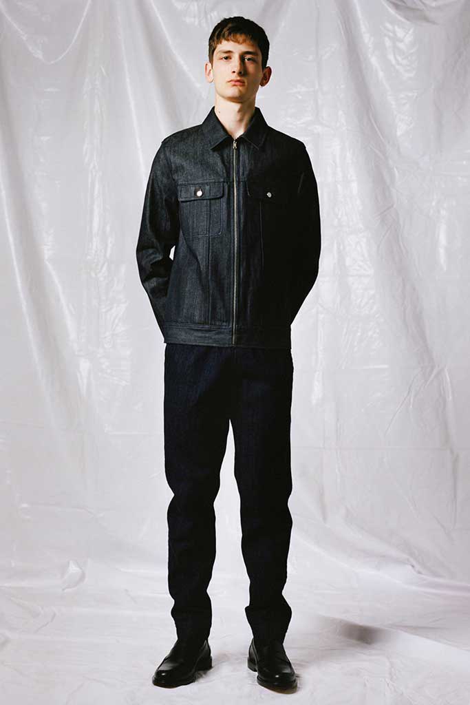 Less preppy than the label’s recent collections, the collection focused heavily on baggy overalls in a range of washed-out denim or railway-striped canvases. These were paired with loose ribbed sweaters printed tone on tone so they looked to be bleached by the sun and wide shirt-style jackets with a workwear feel. There were still elements of the almost gauche rigidity that has become part of the brand’s geek-chic signature, nevertheless, as in a pair of midlength waterproof fabric shorts or a Prince of Wales check Oxford coat.