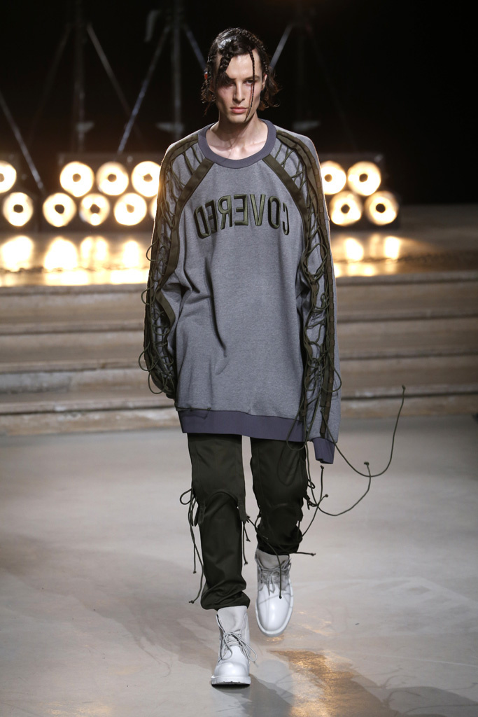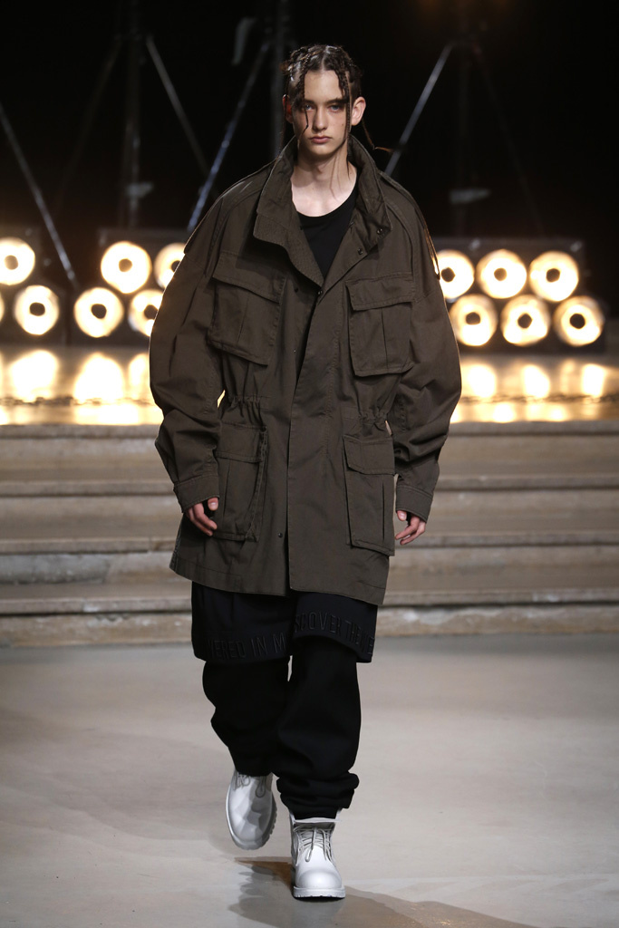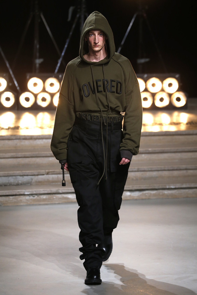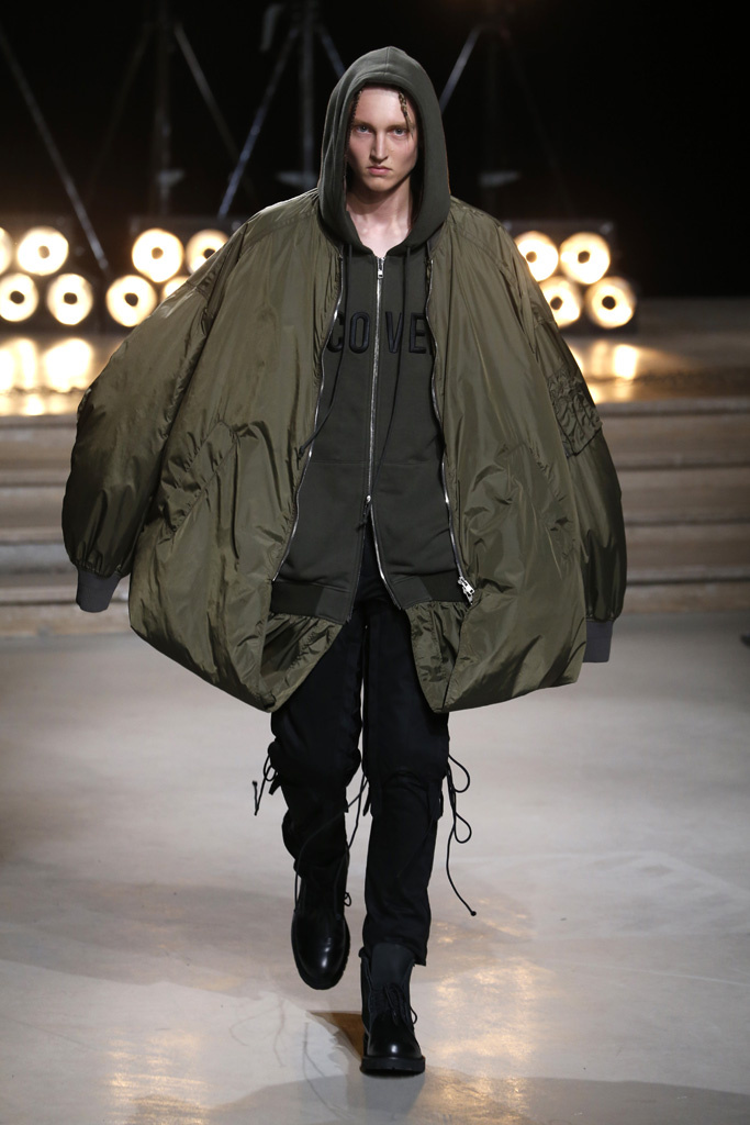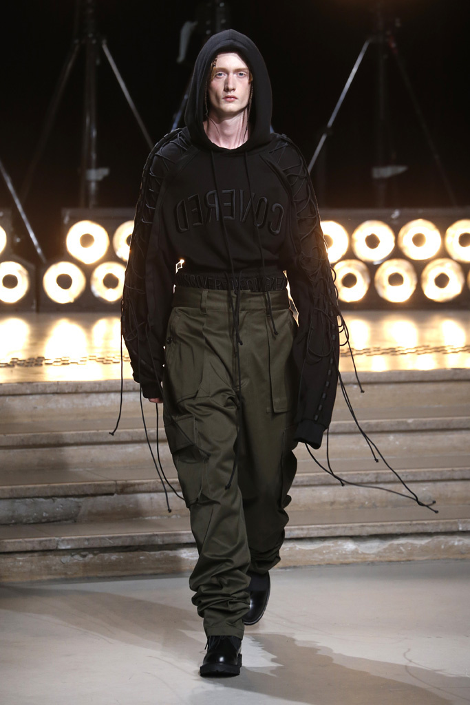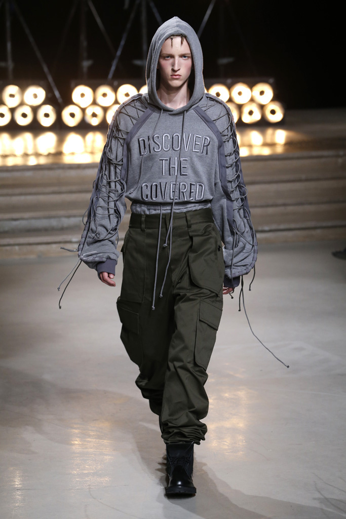 The Korean designer said he was interested in putting the suits’ technical details, which he coincidentally discovered while surfing the web, into casual hoodies, teddies, knits and parkas. He upped their ante with massive pockets and hardware, while also working convoluted lacing constructions on the sleeves of sweatshirts and bombers, an aesthetic that paved its way down the legs of cargo pants.