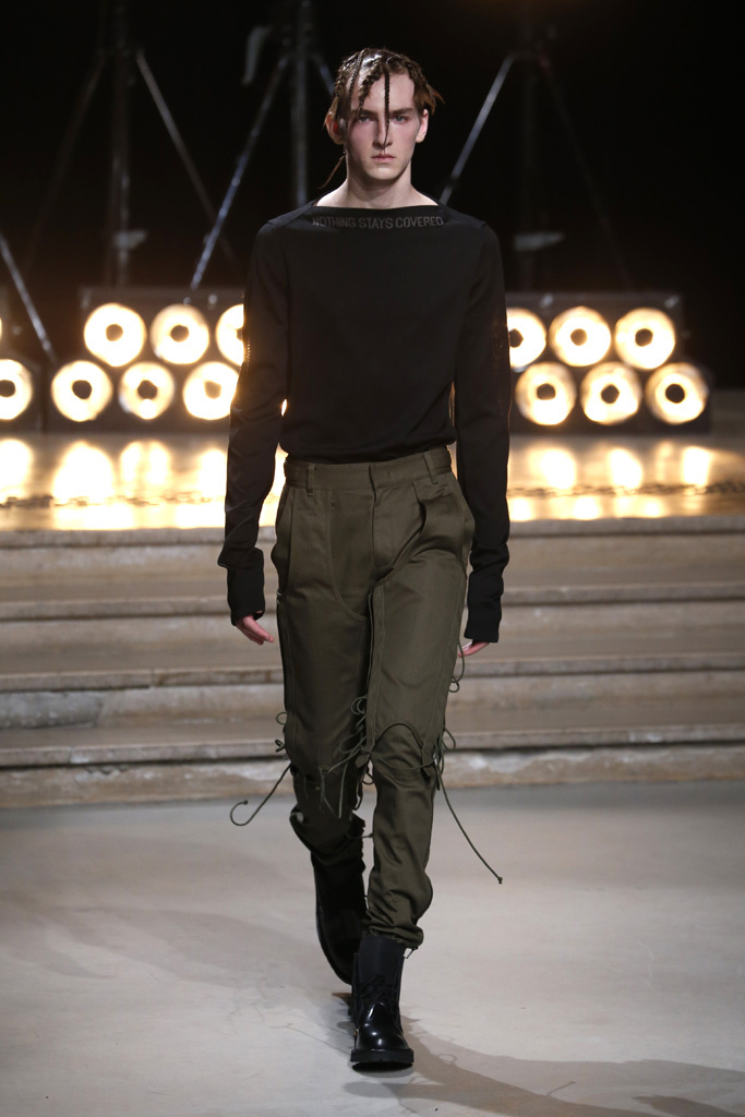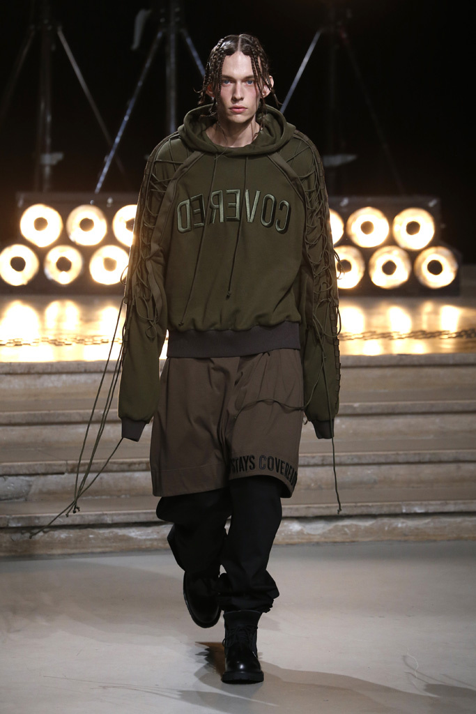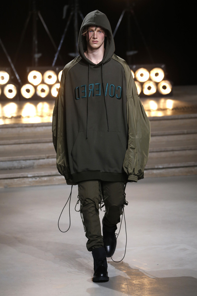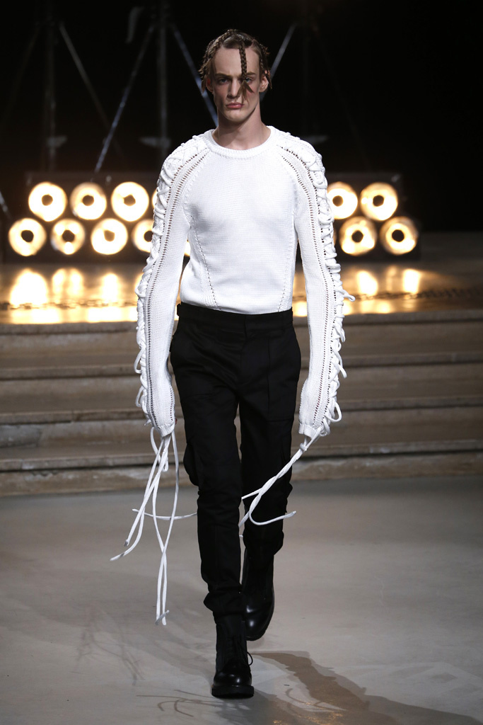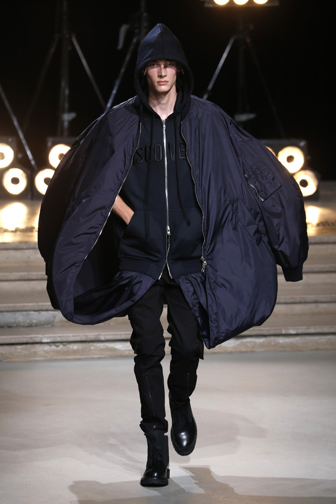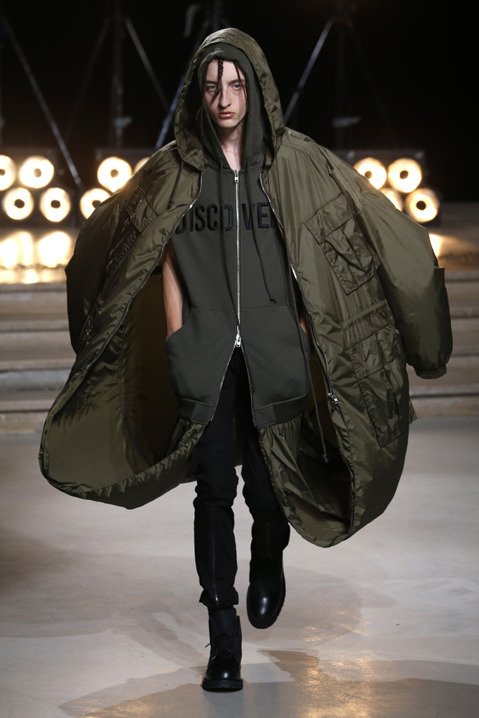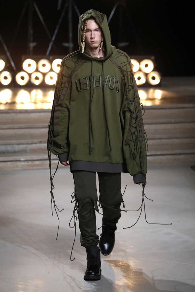 The Korean designer said he was interested in putting the suits’ technical details, which he coincidentally discovered while surfing the web, into casual hoodies, teddies, knits and parkas. He upped their ante with massive pockets and hardware, while also working convoluted lacing constructions on the sleeves of sweatshirts and bombers, an aesthetic that paved its way down the legs of cargo pants.