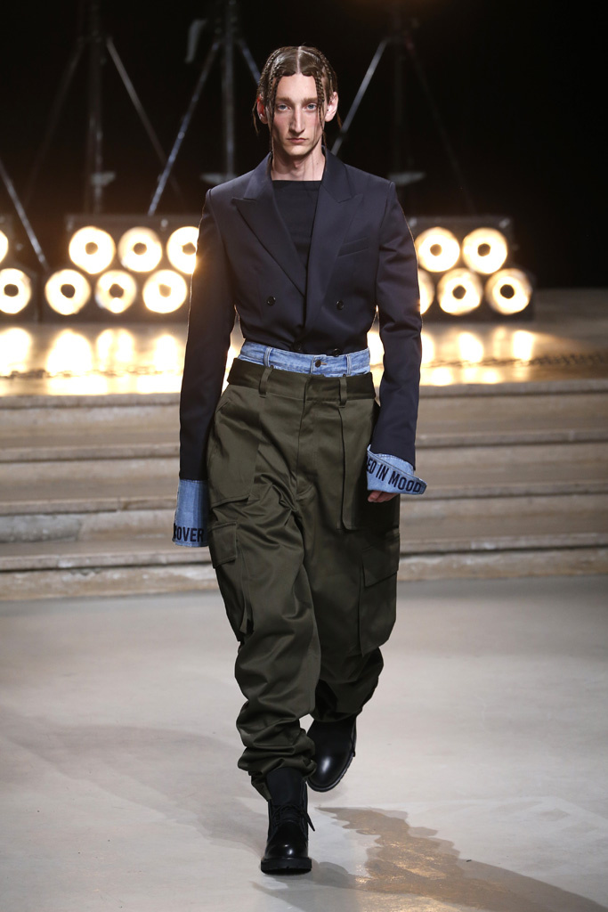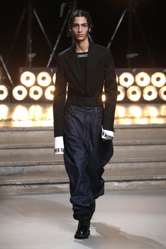 The bottoms quickly turned gargantuan and too bold for some to handle. In one case, they literally slid down the skinny hips of a model, who had to hold his jeans from further slipping down his equally giant leather pants.
