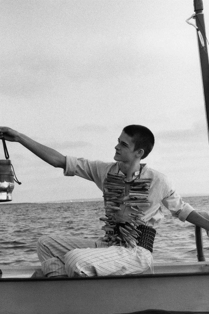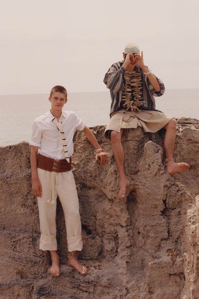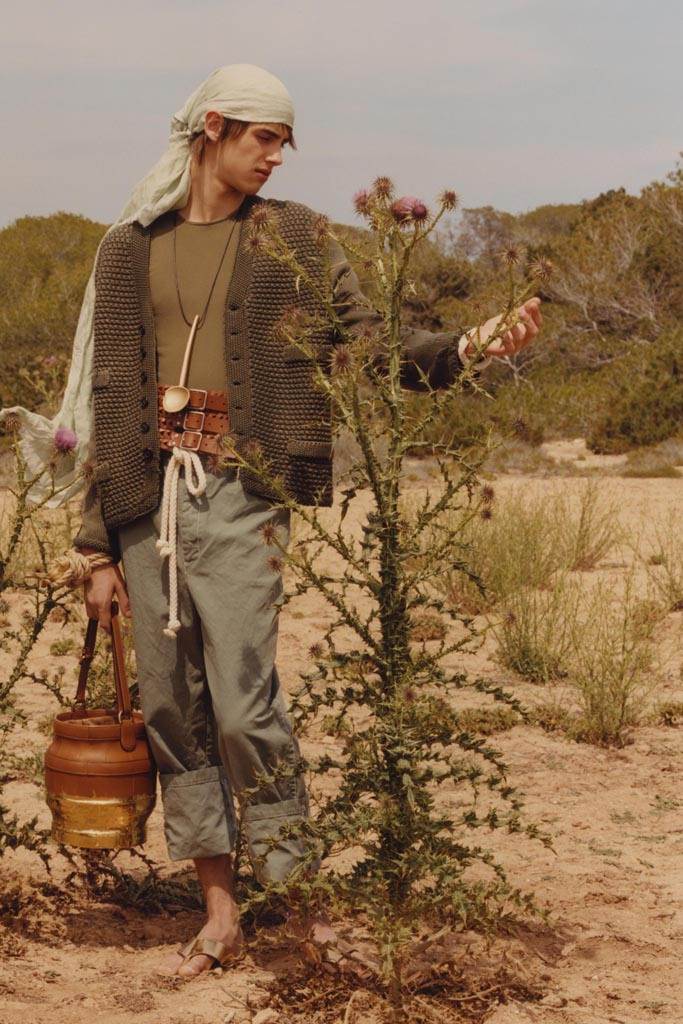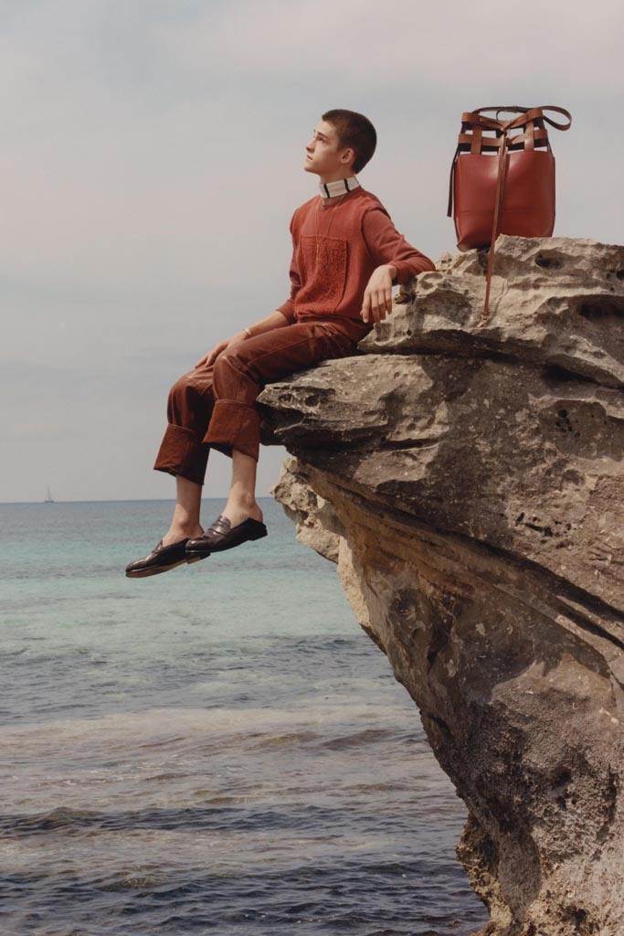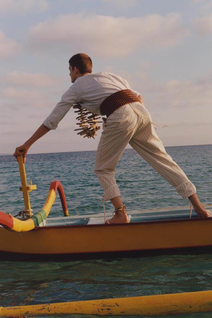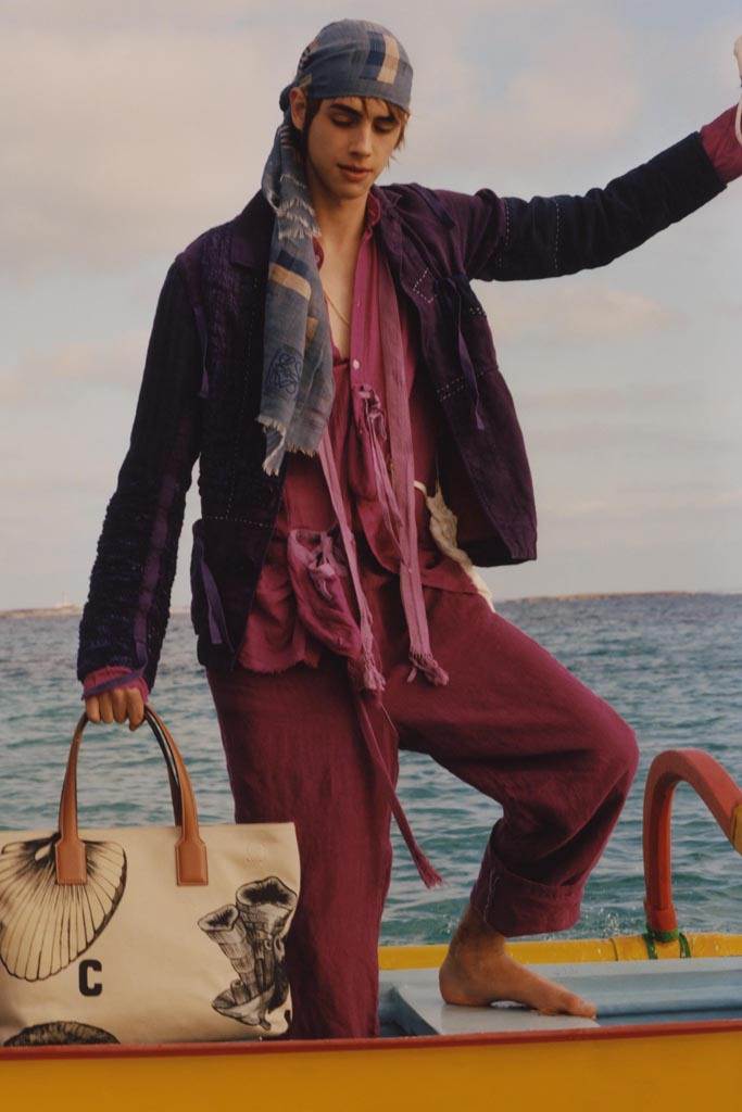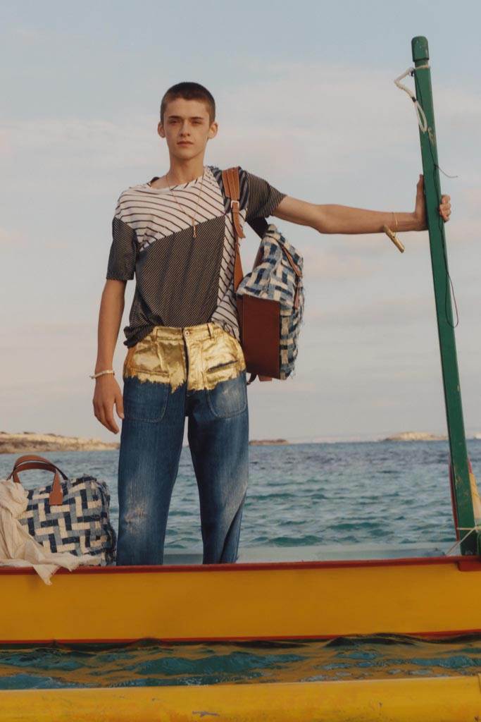 Anderson captured the summer idyll of Ibiza and the eccentric dress codes of locals in his languid shirts dangling streamers and little pouches; long boxing trunks in buttery leather; cropped rain jackets in bright yellow, and plain gray cardigans, the hems dipped in gold.