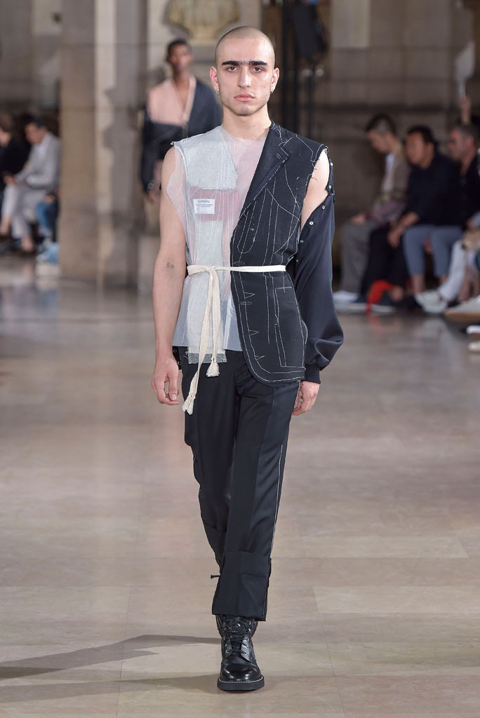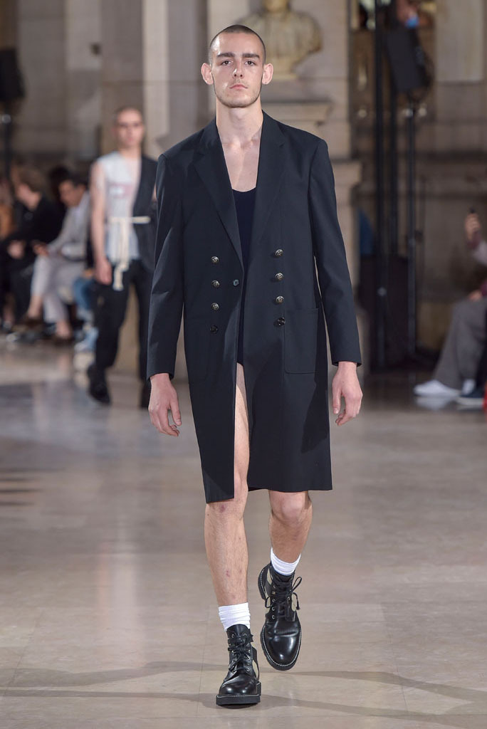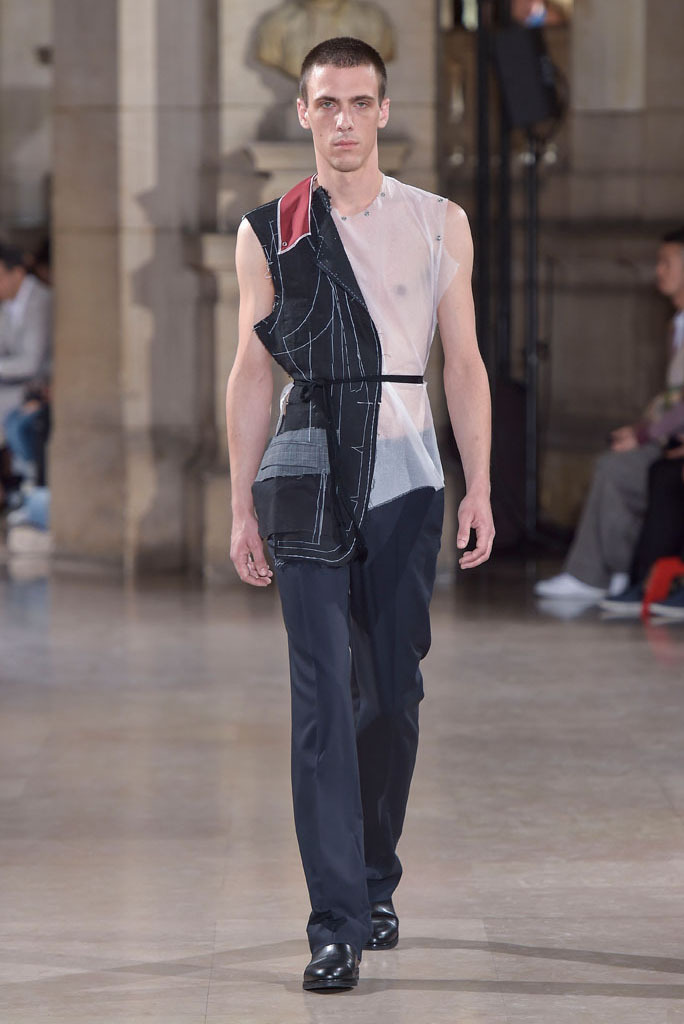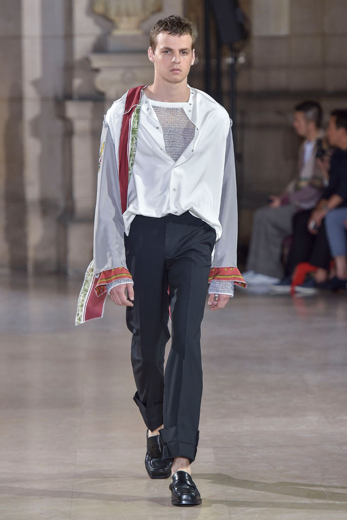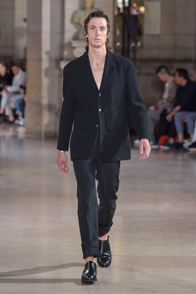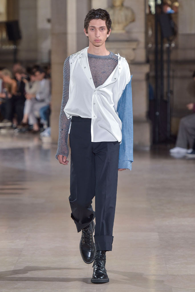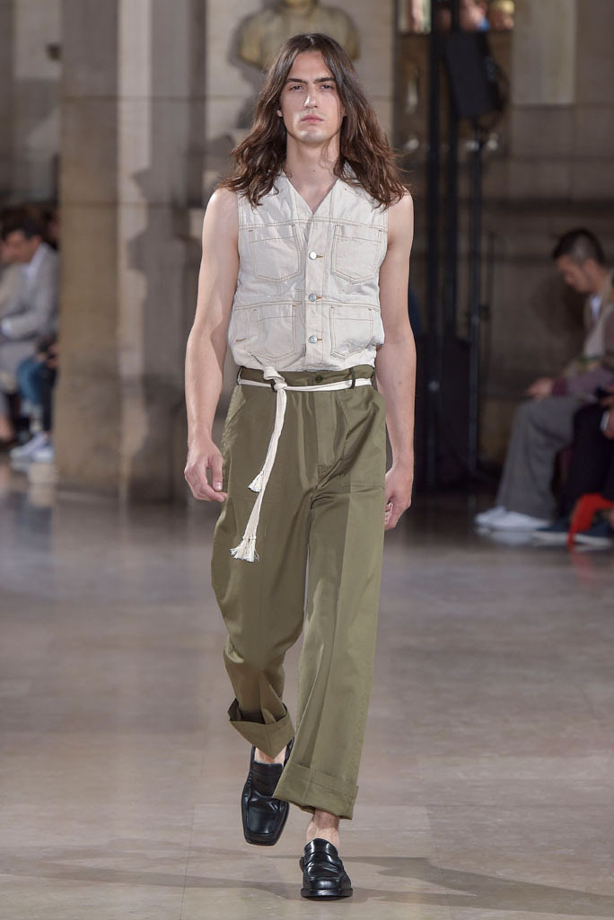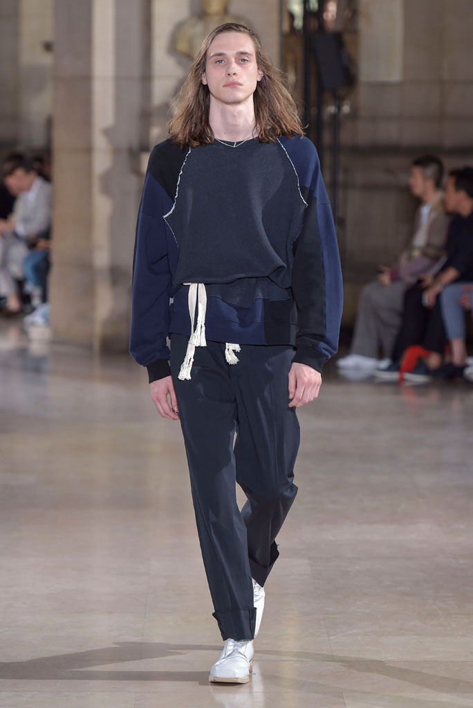 The unfinished constructions also upped the ante of shirts, some of which were patched together from contrasting fabrics — chambray, knit and poplin — or were buttoned instead of sewn, accentuating the season’s DYI spirit. When styled with athletic tear-away pants and folded loafers, they oozed a fresh, youthful vibe. The guys look as if they had just crawled out of bed, though one had to admire their quick-wittedness to put on clothing that actually made sense regardless of its rugged, yet never random character.