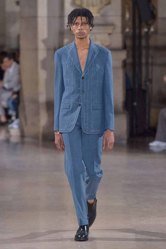 Sending out more conceptual silhouettes, the design team conjured some interesting alternatives that could easily resonate with a younger and more moody consumer. Cue exposed basting stitches on suit jackets, which turned the crafty handwork into decoration, adding an edgy vibe to an old-man’s staple.