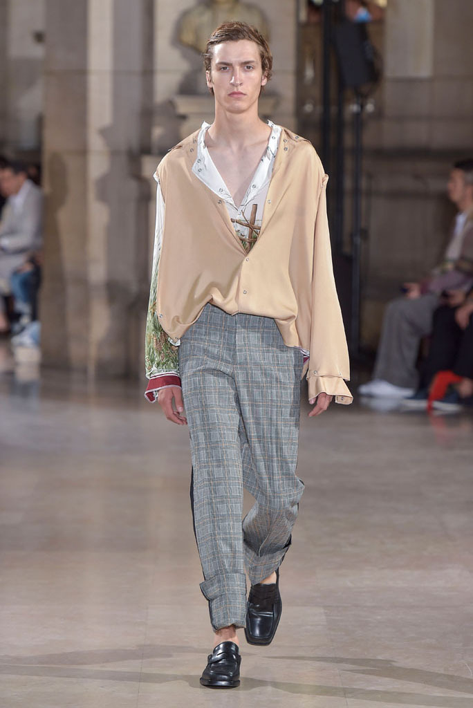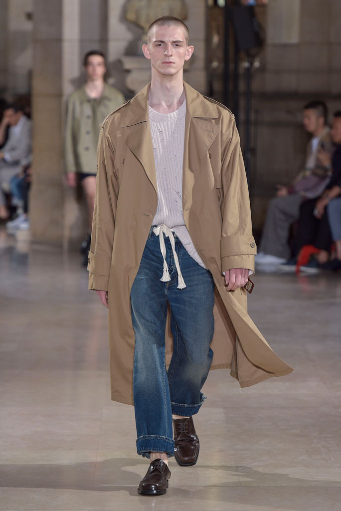 There was cool and carefree tailoring based on soft shoulders and insouciantly rolled up cuffs. The elongated jacket of a tranquil suit done up in a Prince of Wales check was gently enveloped by a ribbon, while a run of fluid trenchcoats came with slightly bell-shaped sleeves favoring freedom of movement over conventions.