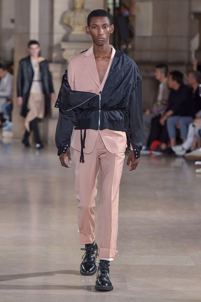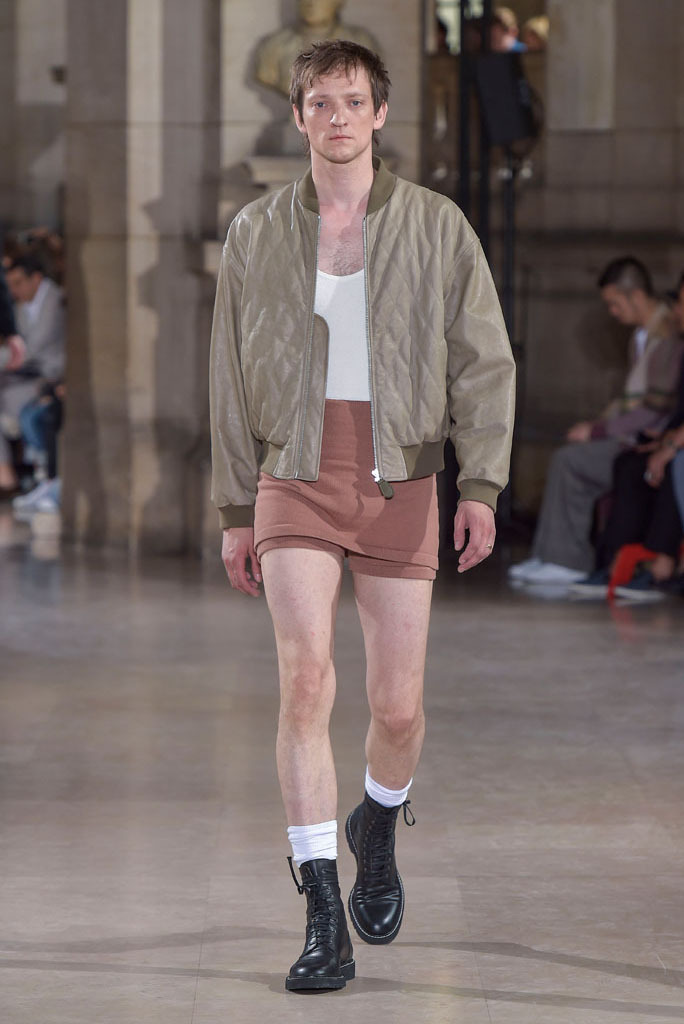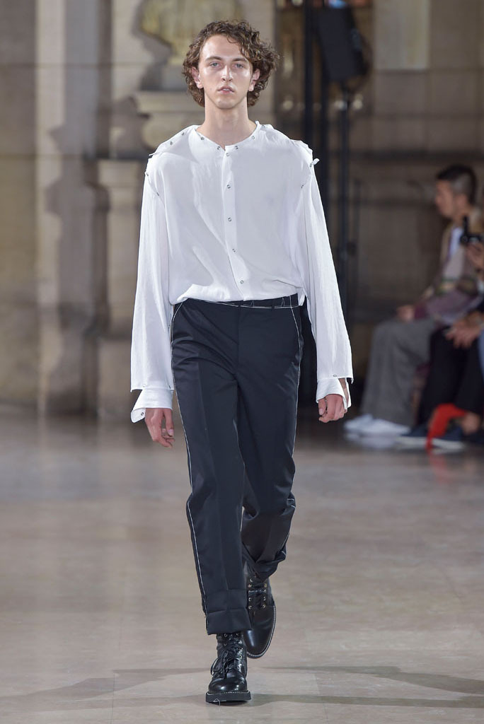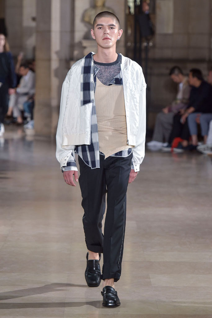 The unfinished constructions also upped the ante of shirts, some of which were patched together from contrasting fabrics — chambray, knit and poplin — or were buttoned instead of sewn, accentuating the season’s DYI spirit. When styled with athletic tear-away pants and folded loafers, they oozed a fresh, youthful vibe. The guys look as if they had just crawled out of bed, though one had to admire their quick-wittedness to put on clothing that actually made sense regardless of its rugged, yet never random character.