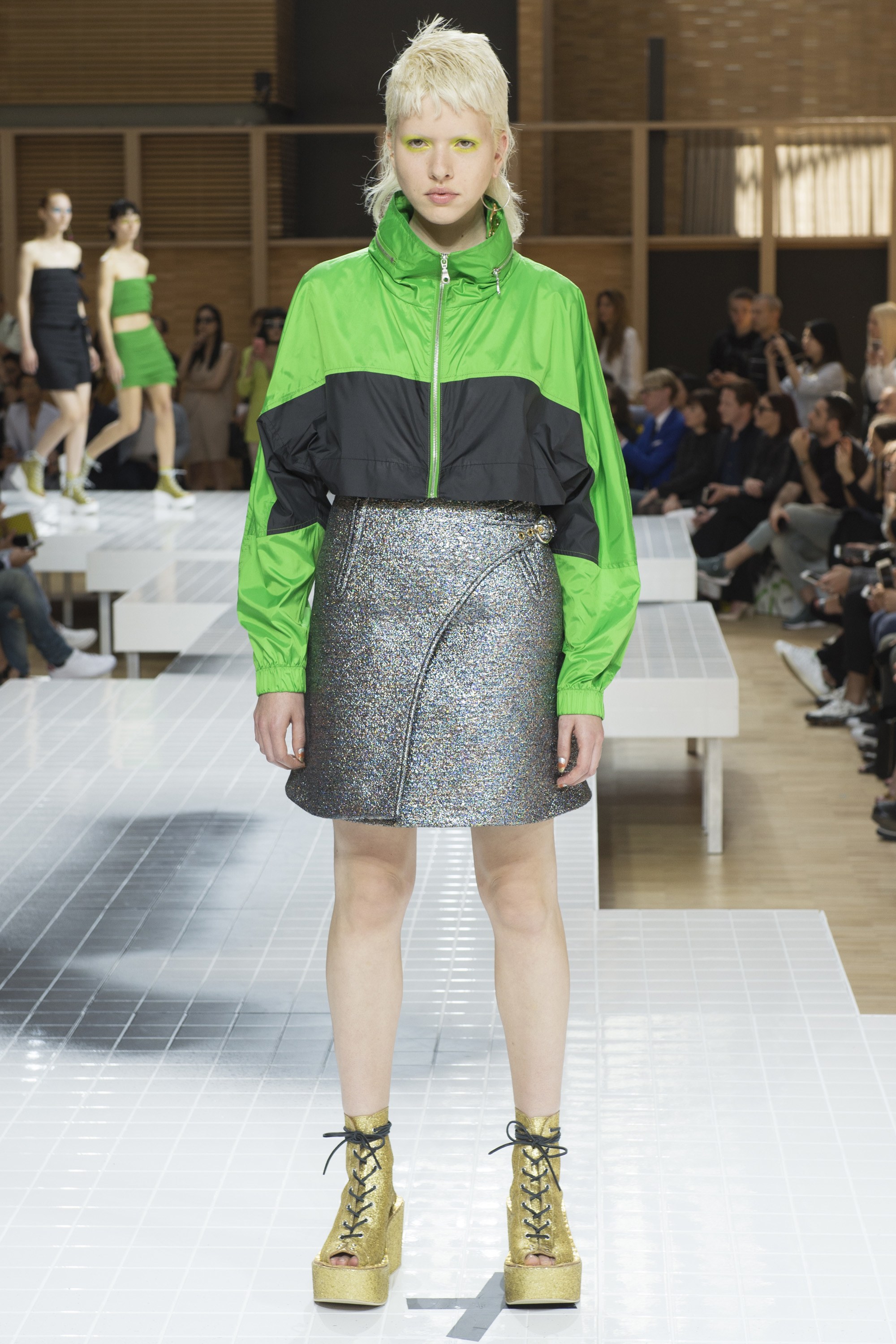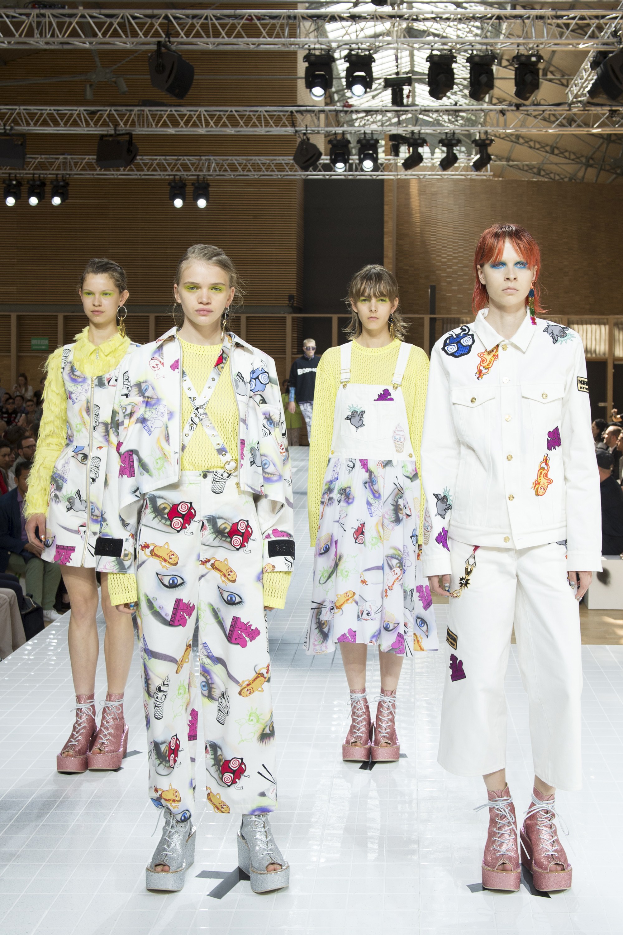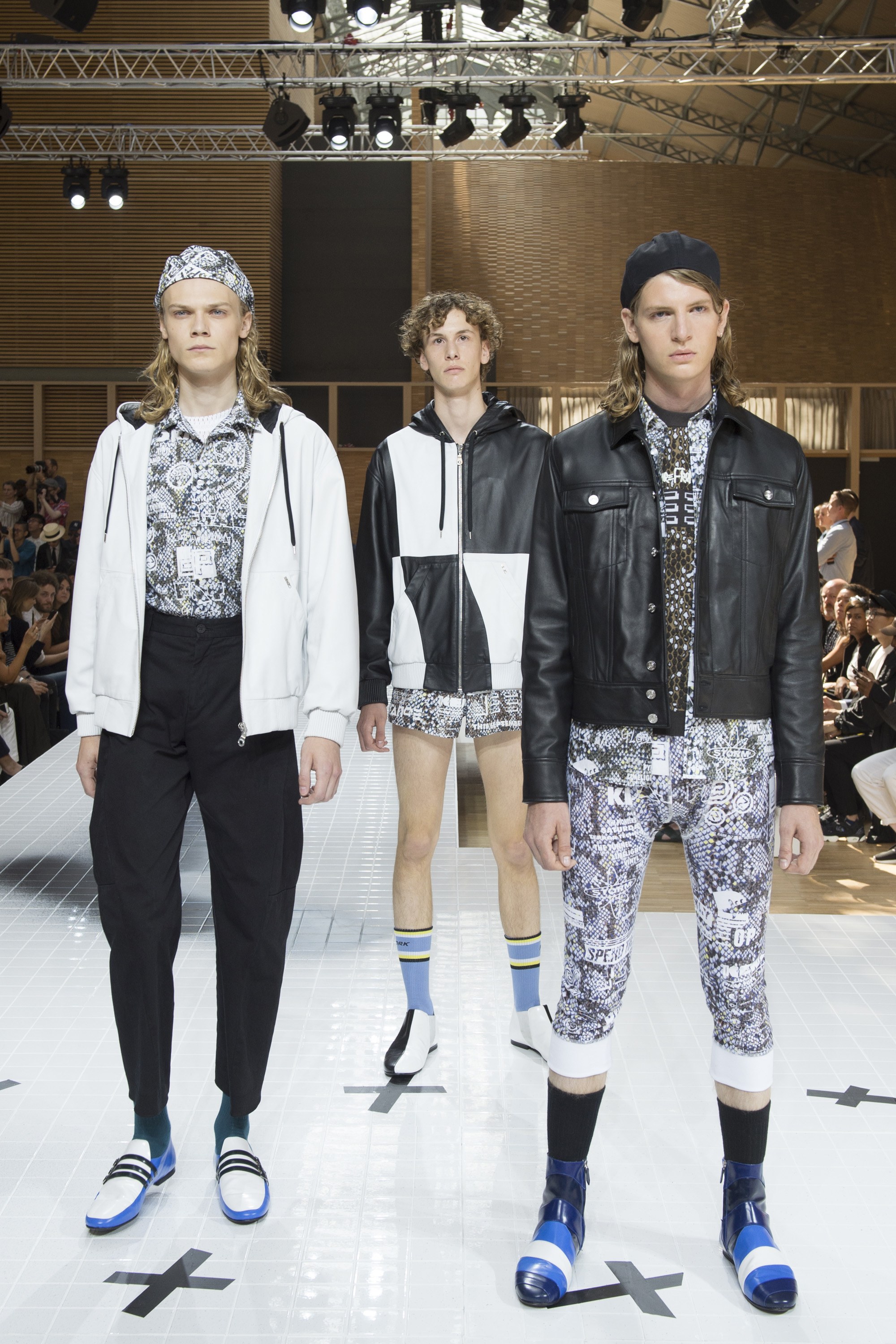 The models emerged in groups, cliques of club kids heading out in tribally-aligned suites of house-jungle-techno-trance–ready attire. There were three lads in monochrome looks of berets, windbreakers, and dancing pants worn atop colored leather rubber-soled loafers. Then three more in blue and lime looks of tracksuits and sweats or short-sleeve printed shirts and jackets layered over long-sleeved logo ringer tees and rib-knits. Print pants were pulled low to the hip to allow views of print boxer shorts pulled high to the navel and worn under tucked-in horizontal-striped ringer tees to act as equator. Eight-stripe zip-up boots complemented similarly striped knits of the sort Paul Smith did a lot of back in the day. There was a raver-esque Moschino-ness in the soap powder–font ‘Brilliant’ hoodies. An eyelet and scallop hemmed and cuffed double-skirted dress in what looked like crunchily treated silk-cotton-nylon indented white on white with the impression of some flyer-sourced ice cream sundae image looked wicked. Lim and Leon kept dropping clique after clique, men after women, in a back-against-the base-bin onrush of looks that challenged the eye to stay in sync but was a rush to try and hold down.