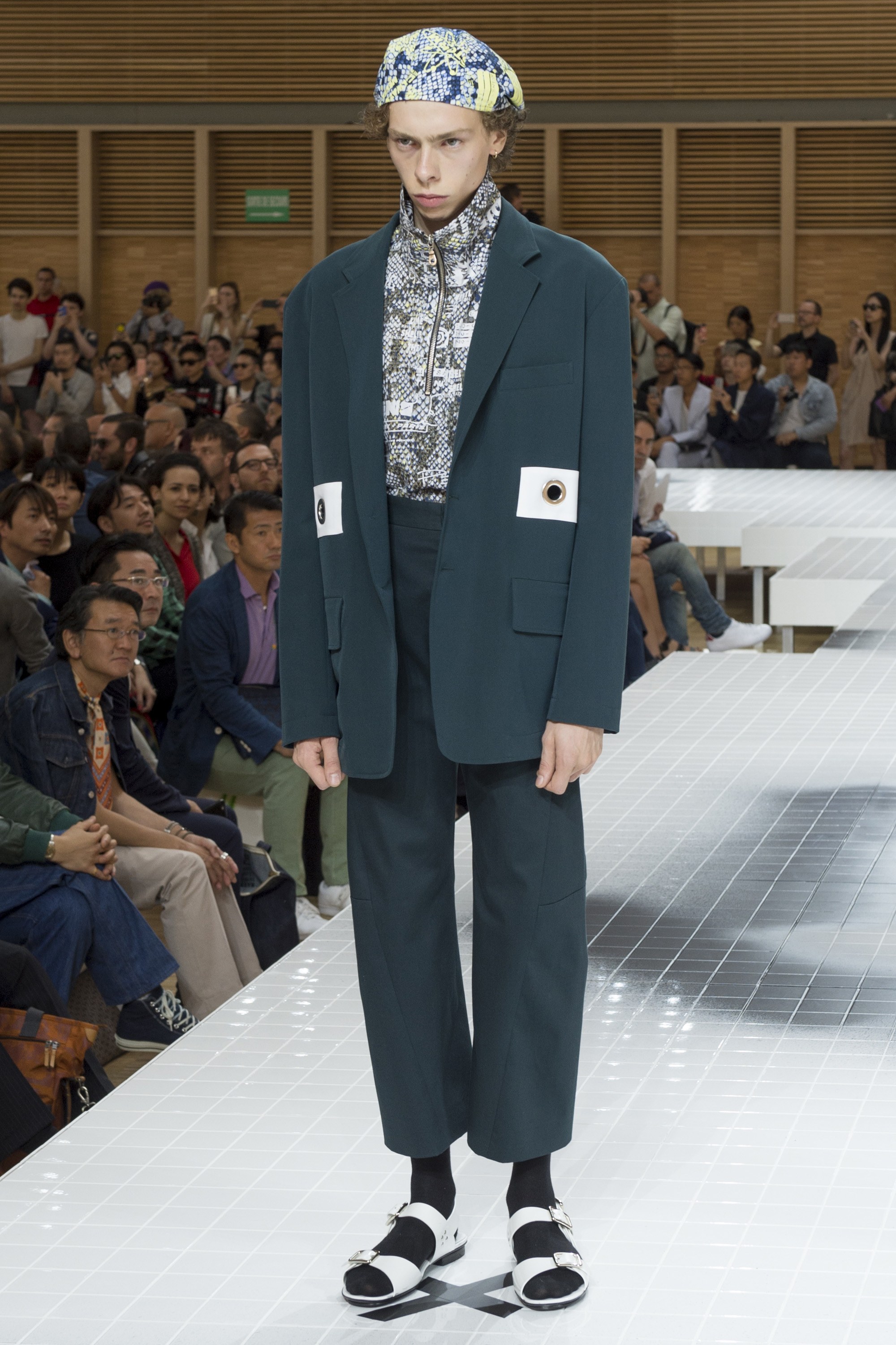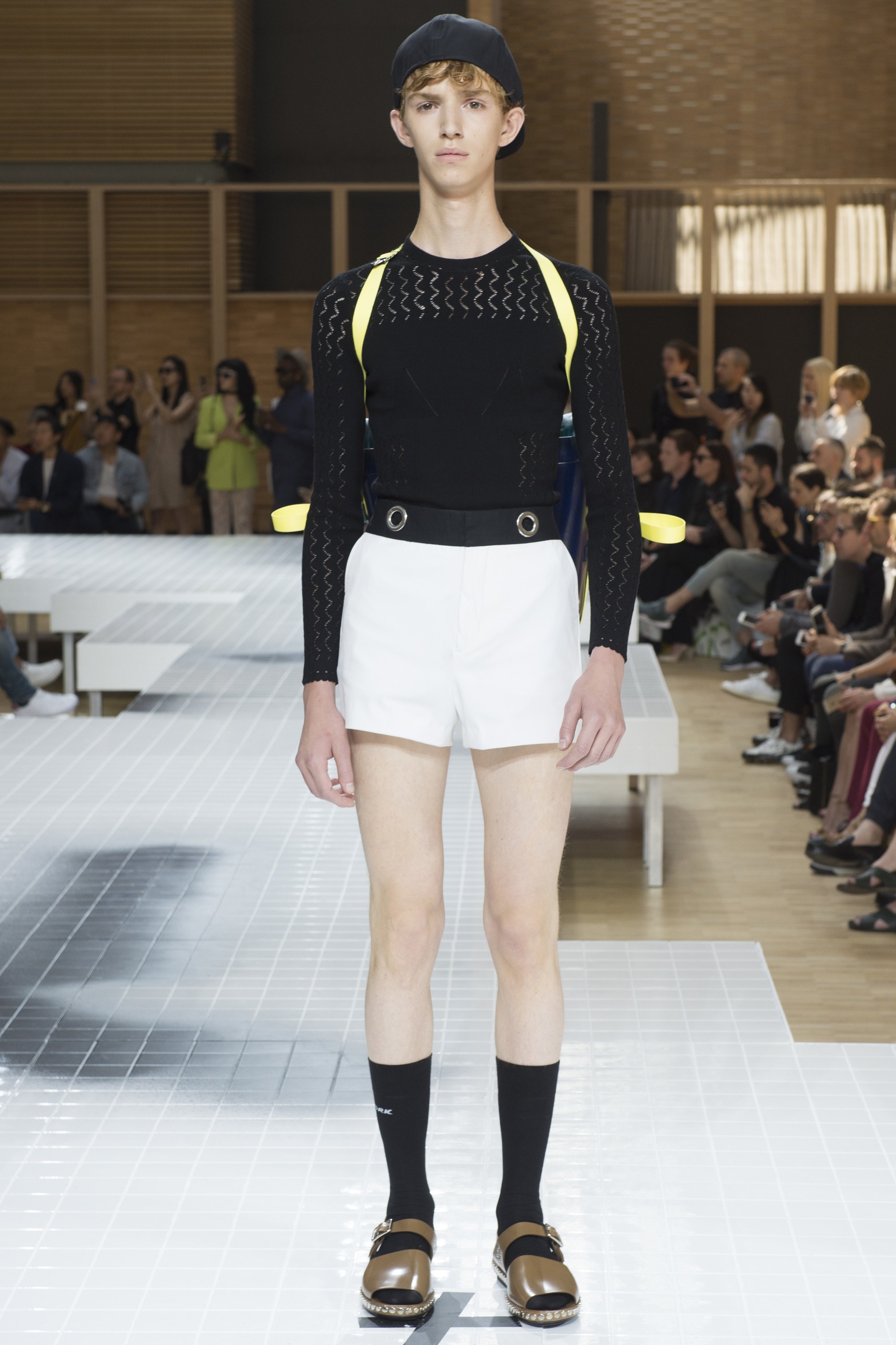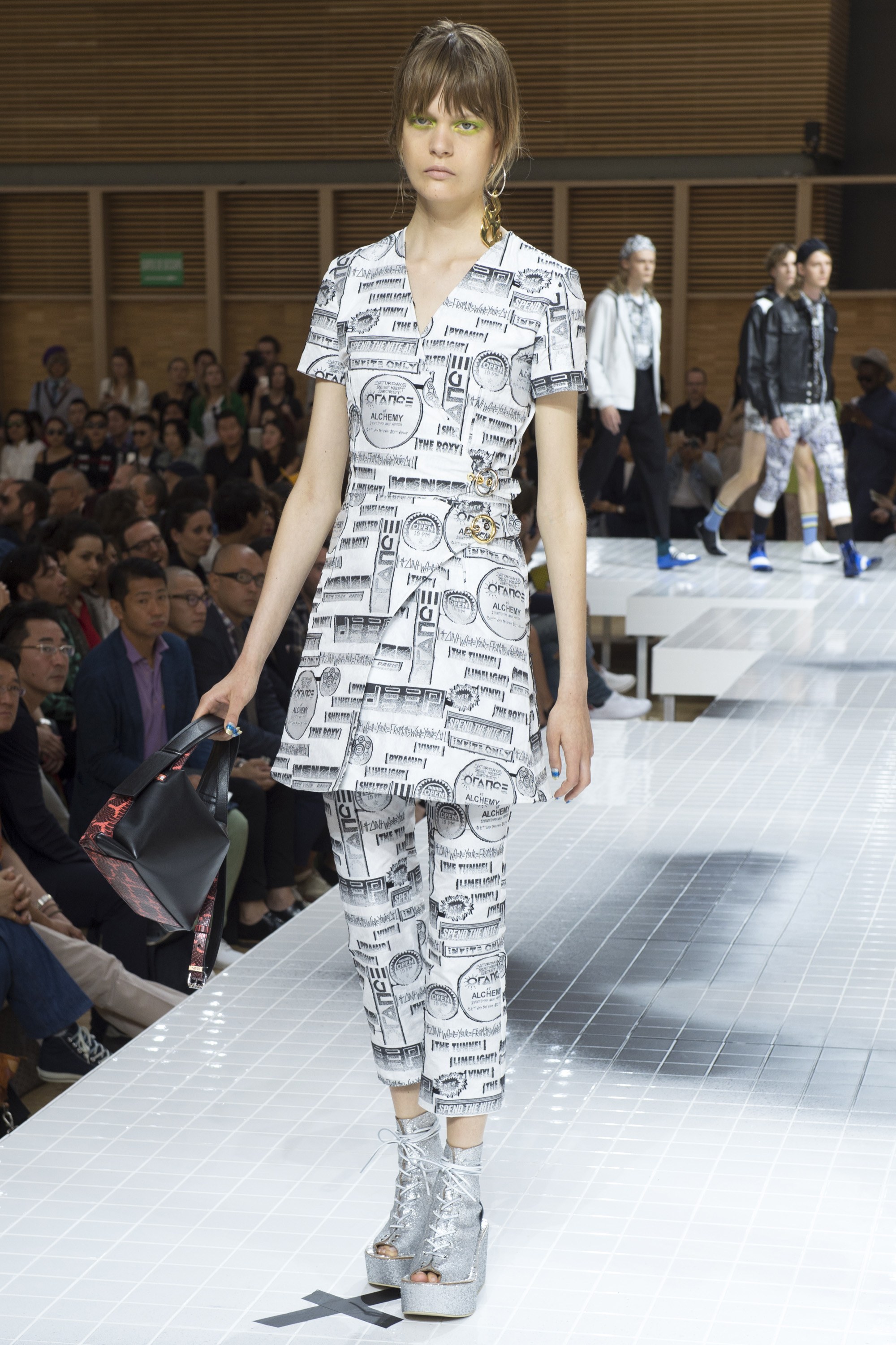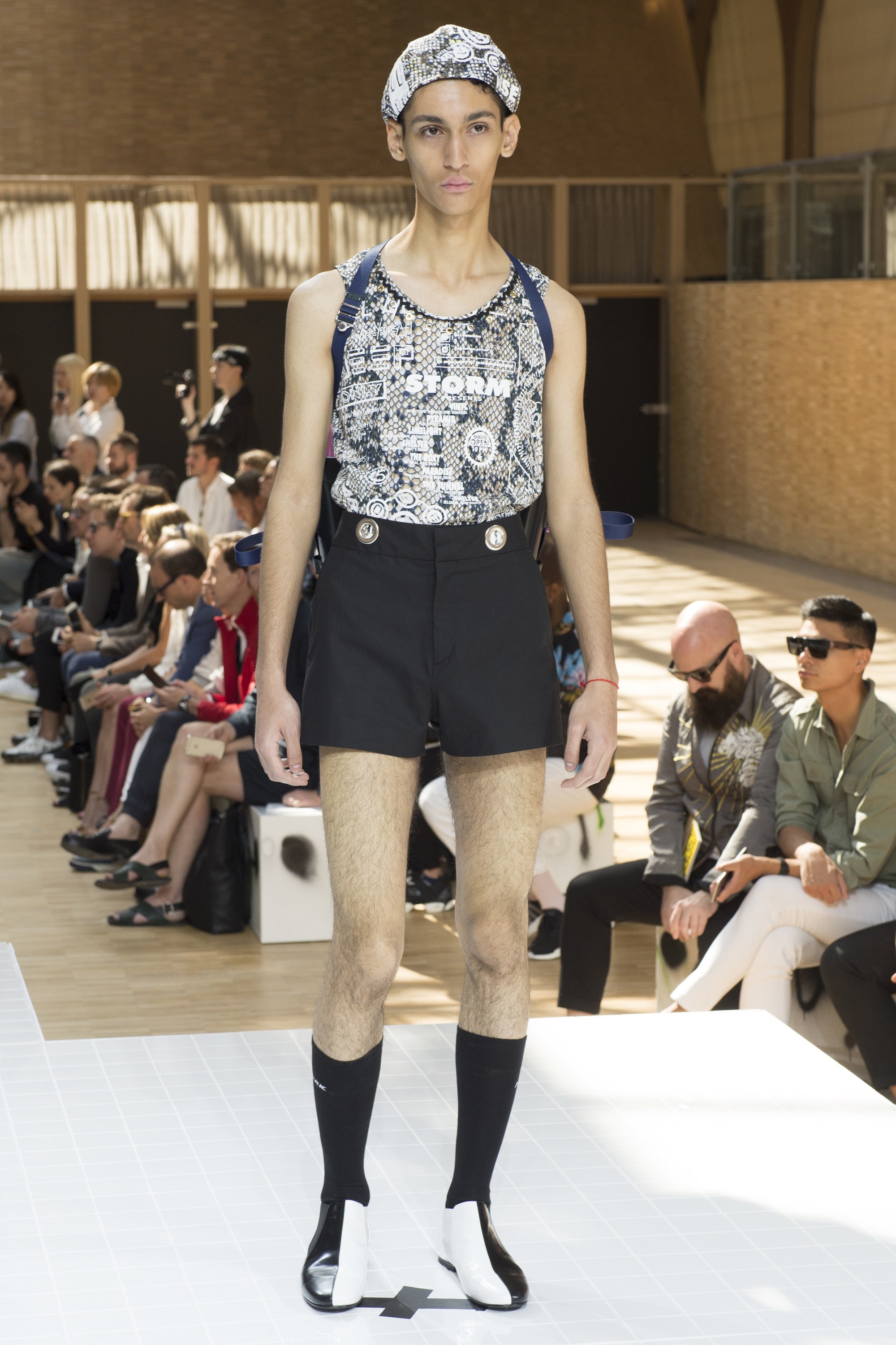 The models emerged in groups, cliques of club kids heading out in tribally-aligned suites of house-jungle-techno-trance–ready attire. There were three lads in monochrome looks of berets, windbreakers, and dancing pants worn atop colored leather rubber-soled loafers. Then three more in blue and lime looks of tracksuits and sweats or short-sleeve printed shirts and jackets layered over long-sleeved logo ringer tees and rib-knits. Print pants were pulled low to the hip to allow views of print boxer shorts pulled high to the navel and worn under tucked-in horizontal-striped ringer tees to act as equator. Eight-stripe zip-up boots complemented similarly striped knits of the sort Paul Smith did a lot of back in the day. There was a raver-esque Moschino-ness in the soap powder–font ‘Brilliant’ hoodies. An eyelet and scallop hemmed and cuffed double-skirted dress in what looked like crunchily treated silk-cotton-nylon indented white on white with the impression of some flyer-sourced ice cream sundae image looked wicked. Lim and Leon kept dropping clique after clique, men after women, in a back-against-the base-bin onrush of looks that challenged the eye to stay in sync but was a rush to try and hold down.