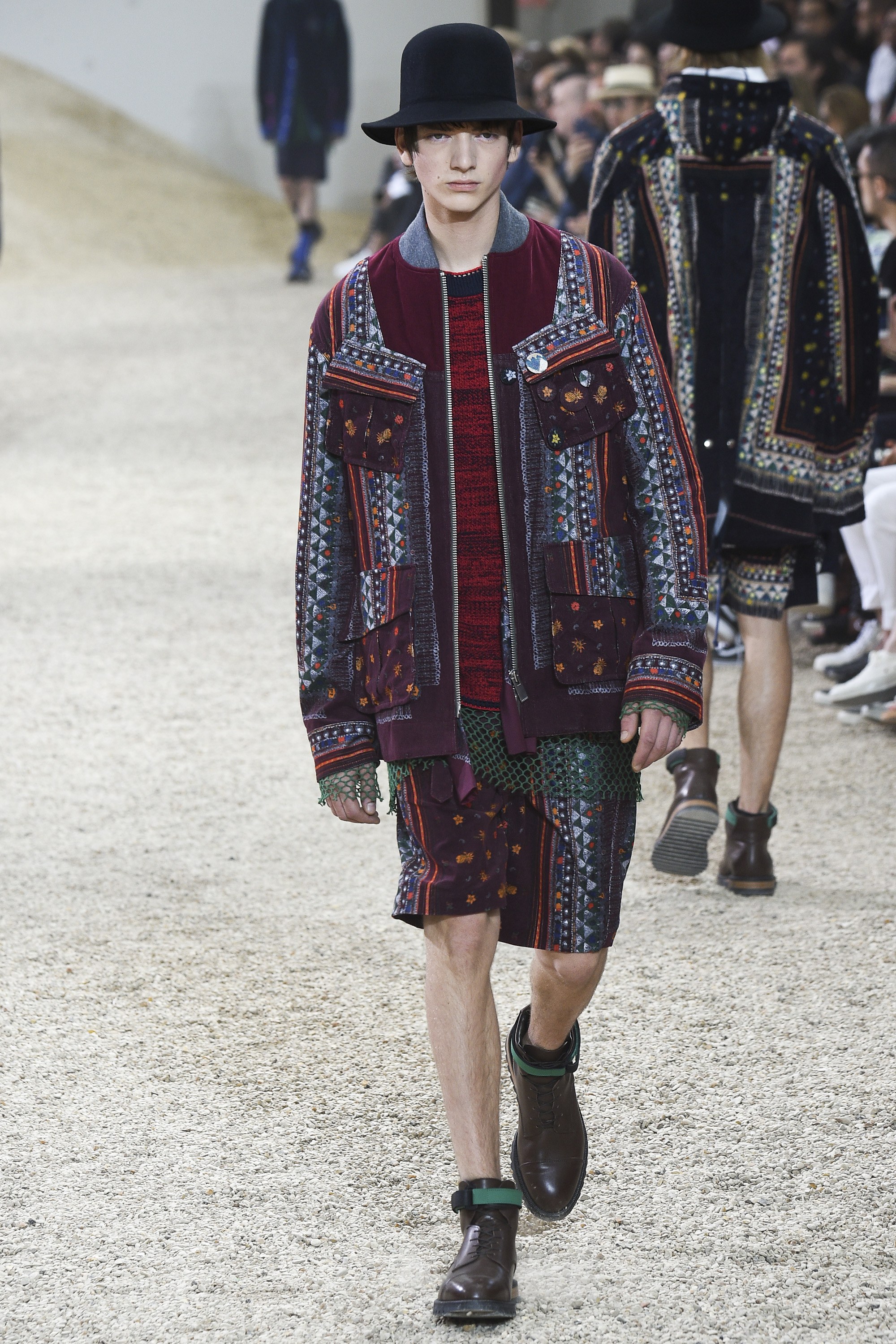 Chitose Abe eased up on her cross-pollination of garments, most splicing knit panels into crispy Windbreakers, or as the waistband on a shirt in lumberjack plaid. Mexican poncho fabrics and other folkloric patterns fed the collection’s jumbled, global wanderer feel. Abe used the former for toggle coats and slim pants that ended in wads of fringe.