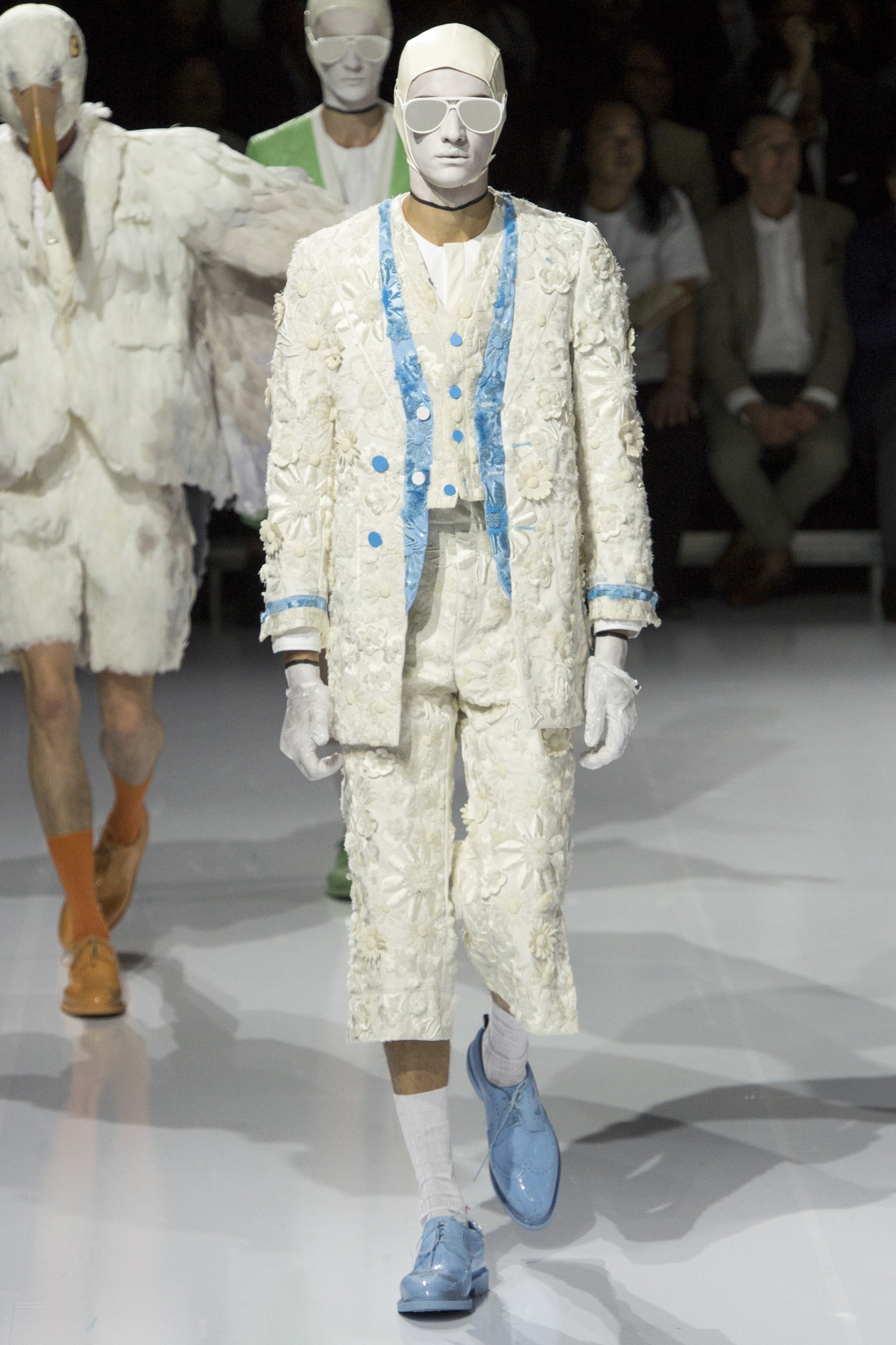 The end of the Paris menswear shows is a time for bleary eyes and stony faces. But here the audience smiled. They laughed. And they even put down their smartphones and applauded, with all the glee of little kids. They also held their breath in a moment’s silence for the esteemed New York Times style photographer Bill Cunningham, whose death was announced yesterday. Browne himself requested the moment of silence. Watching the subsequent runway show unfold, a celebration of fashion’s power to transform, of unabashed exuberance in dress, and of superlative showmanship, you couldn’t help but feel Cunningham would have adored Browne’s audacity and absolute commitment to his crafts. That’s plural, please note: the craft of making clothes, and the craft of spectacle. Browne is an American master of both.