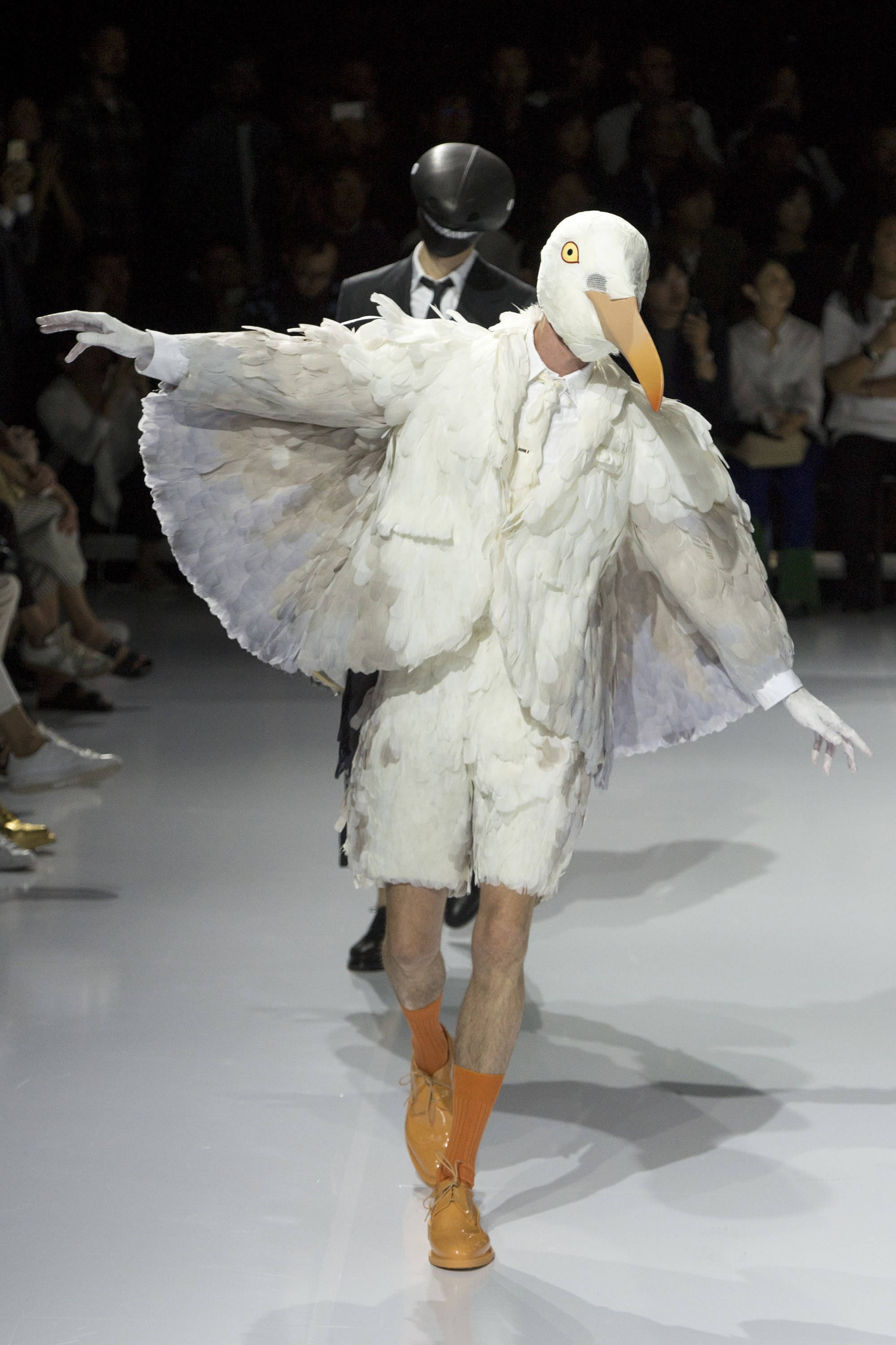 Speaking of which, the aforementioned great white was still circling ominously (read: hilariously). At some point, a few seagulls joined him—men in feather-crusted shorts suits and beaked Stephen Jones headpieces, flapping their wings like angels in a preschool nativity play. You couldn’t help but grin, the models then stripping off for a second time, revealing each ensemble to be a fused trompe l’oeil, like a snug wet suit, a reveal worthy of a winning RuPaul’s Drag Race main-stage lip sync, and just as camp. Underneath each wore a retro-style bathing suit in an eye-popping Lilly Pulitzer–style print. Oh, at some point a couple of macaws joined in. Who knows when, or why. The damn shark was still circling.