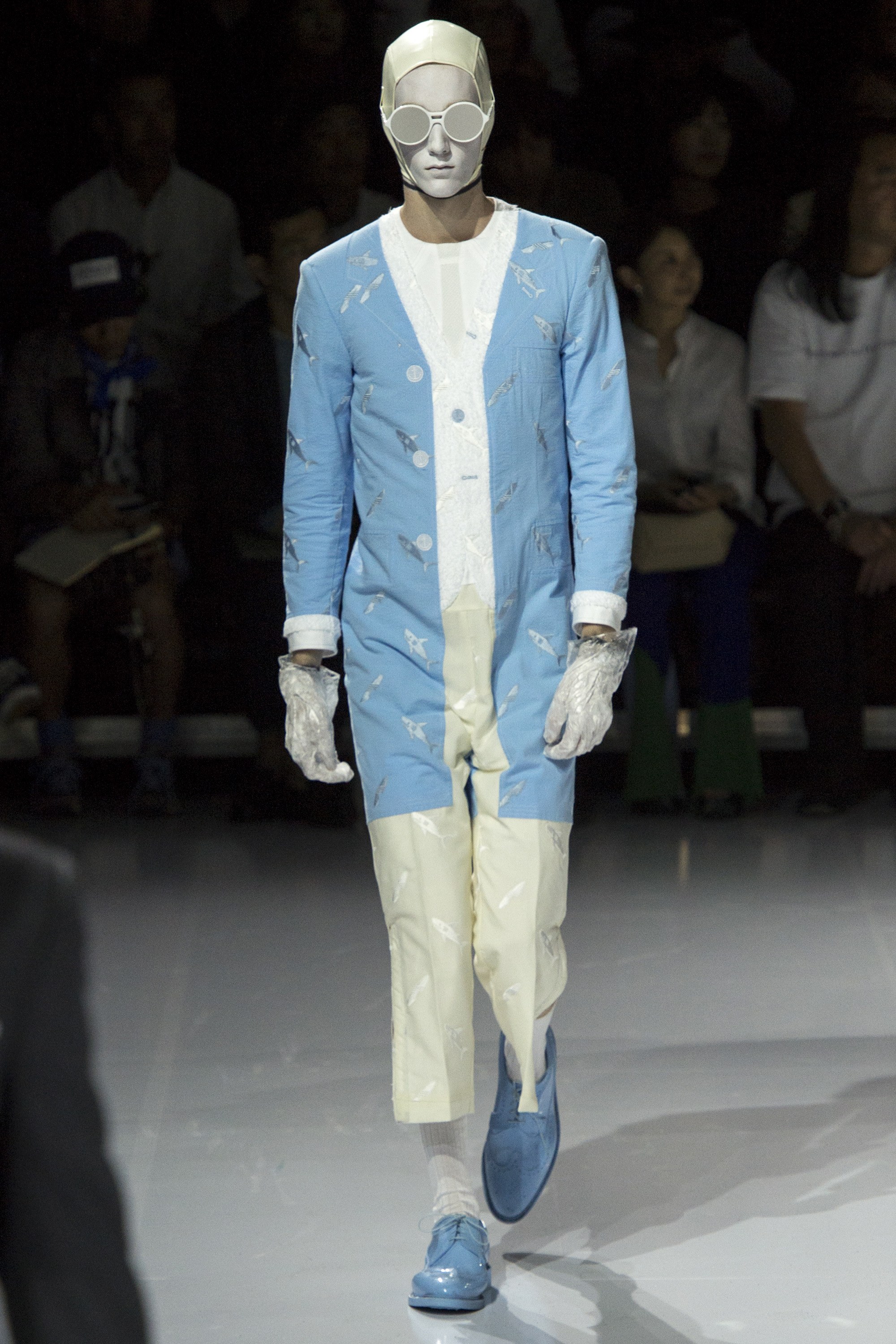 Here was the scene: a post-apocalyptic beach of black sand, gray palm tree, and a lounging sunbather in a tight zippered wet suit, like a black-and-white movie still. John Williams’s ominous Jaws theme began to play, and a model in a black suit—drop-crotch pants, jacket with a dorsal fin attached, head hidden under a leather shark mask—perambulated out and circled the set. No word of a lie. Then a bunch of shark-attack-ready models waddled out in Fatty Arbuckle onesies, plodding to take their place about the tree. A quick zip and, like a cheap infomercial before and after, the corpulence literally peeled right off, to reveal spangled short suits, tailcoats, and overcoats in brilliant, poolside cocktail shades of orange sorbet, cassata, and piña colada, in fur or tweed or hibiscus flower laces with embroideries of surfboards, and islands, and sharks.