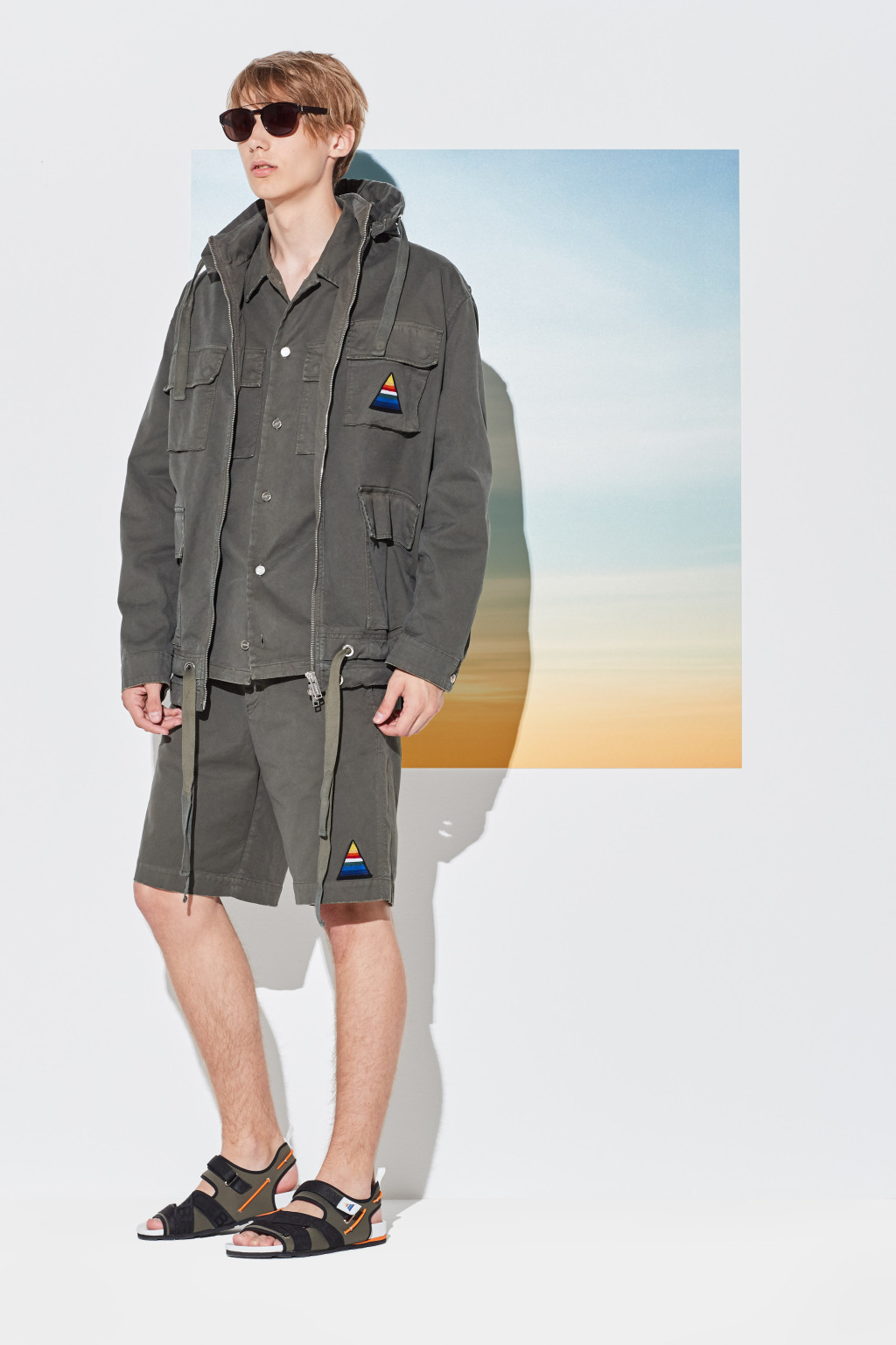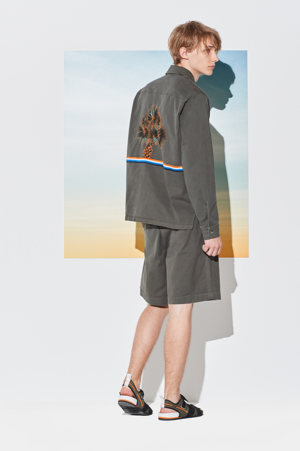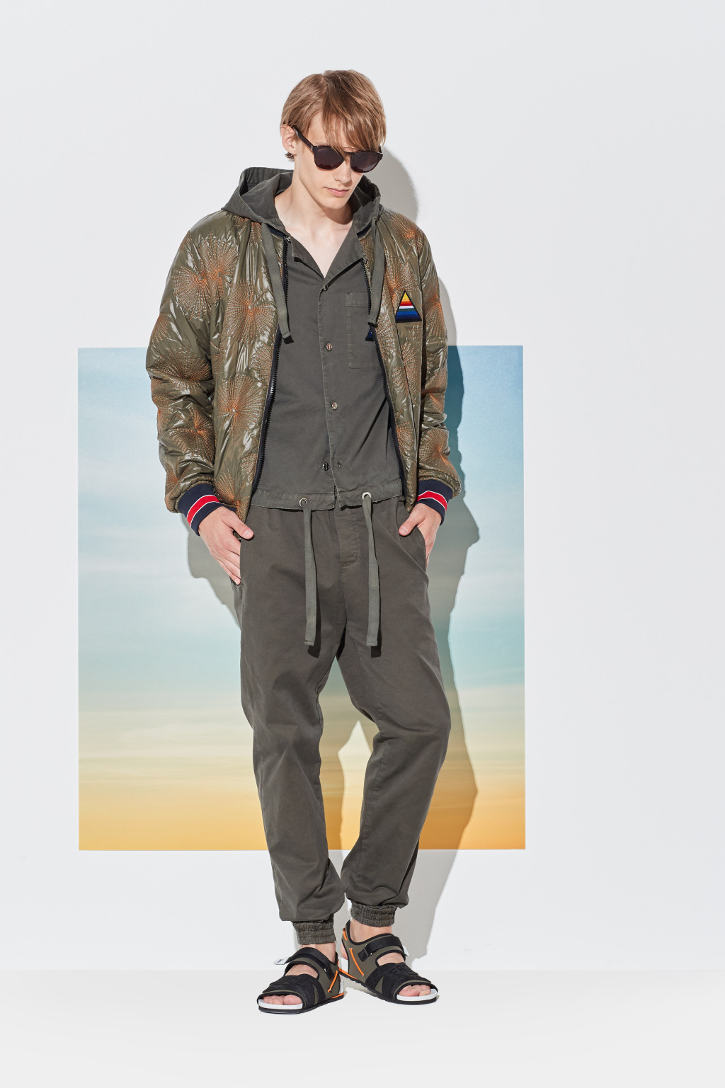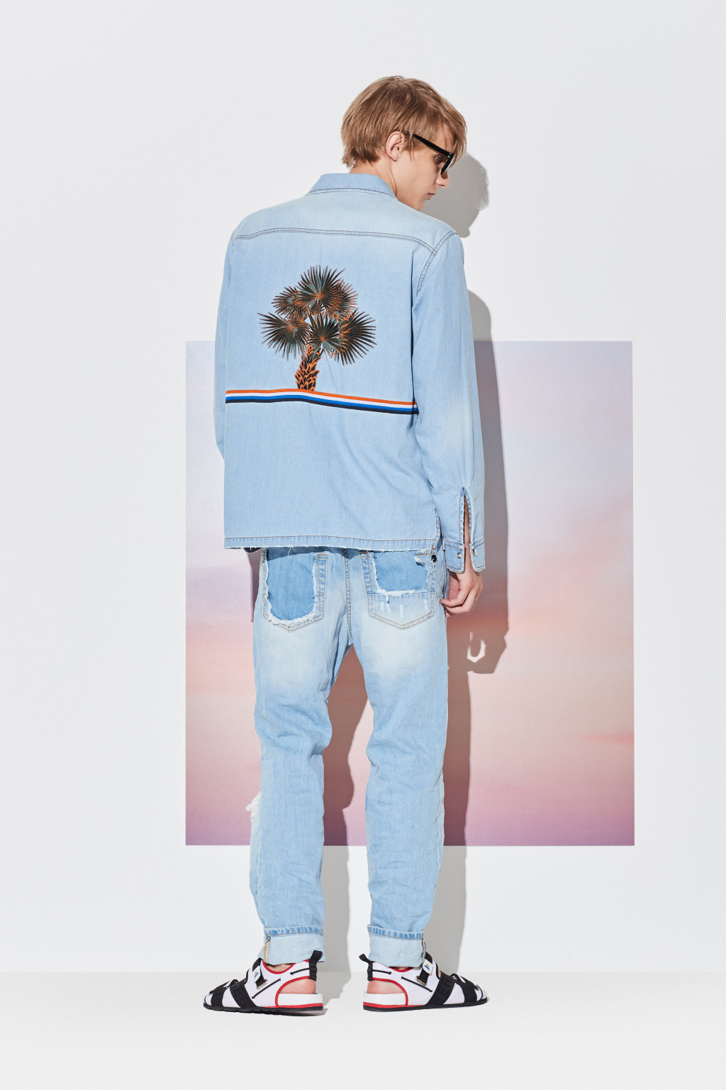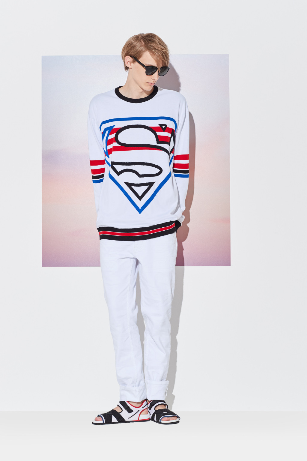 In a move to explore exotic atmospheres, Long splashed an allover tropical pattern worked in a subdued color palette of military green and black on a fluid silk shirt and reversible bombers, and embroidered the back of a washed denim jacket with a palm. In an homage to Iceberg’s long-lasting link with the art world, a Warhol-like image of Superman appeared as an intarsia on a crewneck sweater.