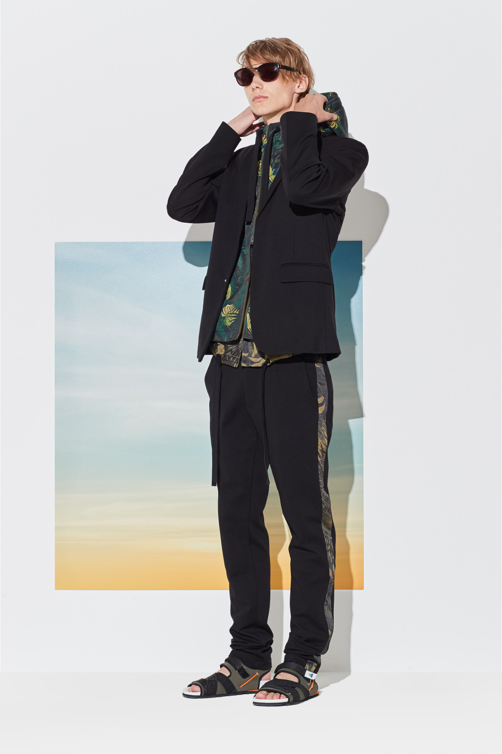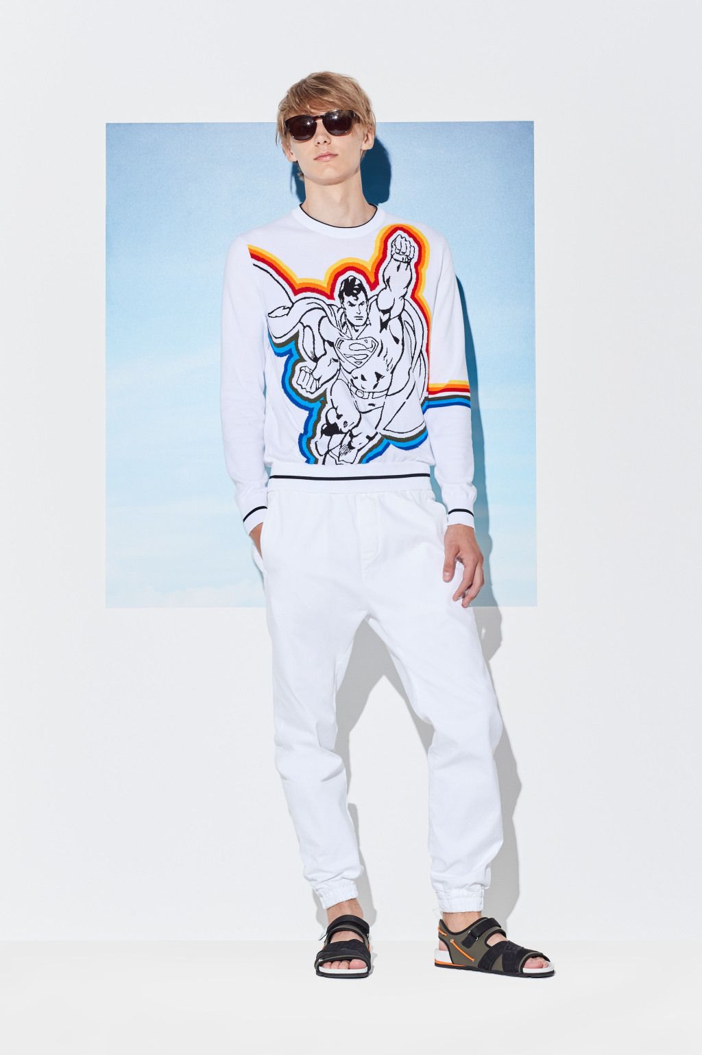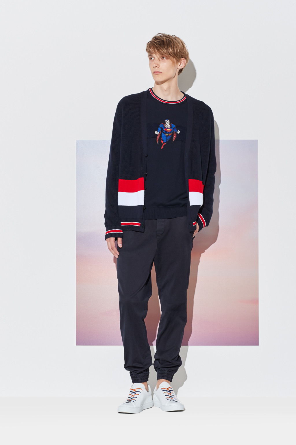 In a move to explore exotic atmospheres, Long splashed an allover tropical pattern worked in a subdued color palette of military green and black on a fluid silk shirt and reversible bombers, and embroidered the back of a washed denim jacket with a palm. In an homage to Iceberg’s long-lasting link with the art world, a Warhol-like image of Superman appeared as an intarsia on a crewneck sweater.