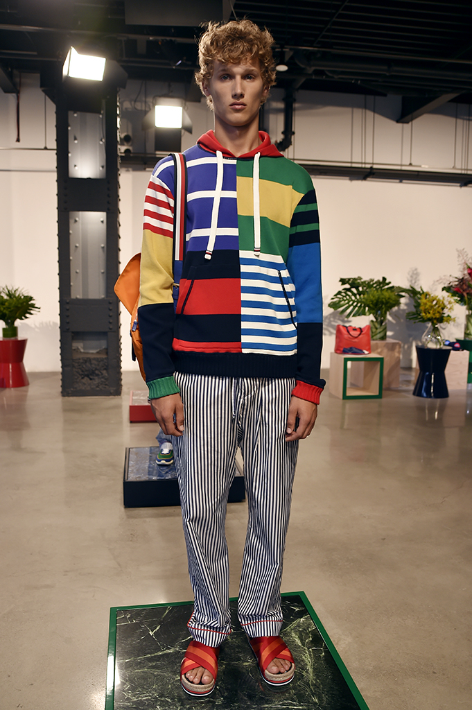 Hilfiger’s trademark stripe was used throughout the line, in everything from patchwork sweaters and tracksuits to technical parkas with reengineered rugby stripes. Other graphic details included floral prints that worked best in pajama bottoms and voluminous belted shorts.