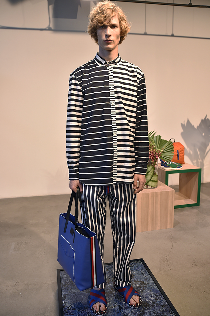 Hilfiger’s trademark stripe was used throughout the line, in everything from patchwork sweaters and tracksuits to technical parkas with reengineered rugby stripes. Other graphic details included floral prints that worked best in pajama bottoms and voluminous belted shorts.