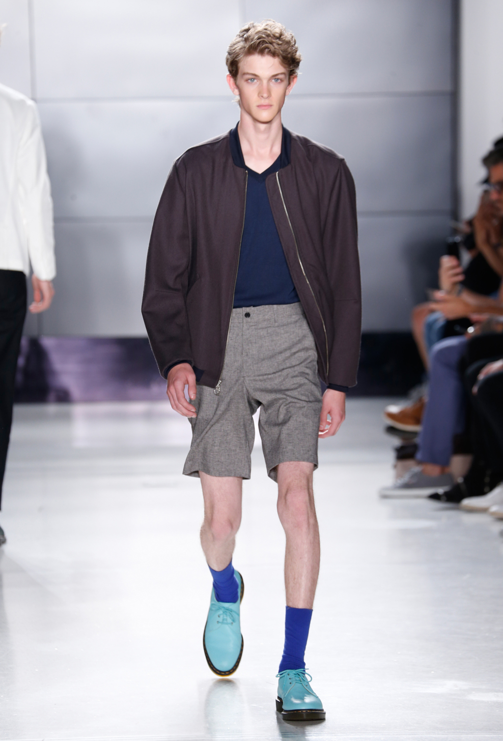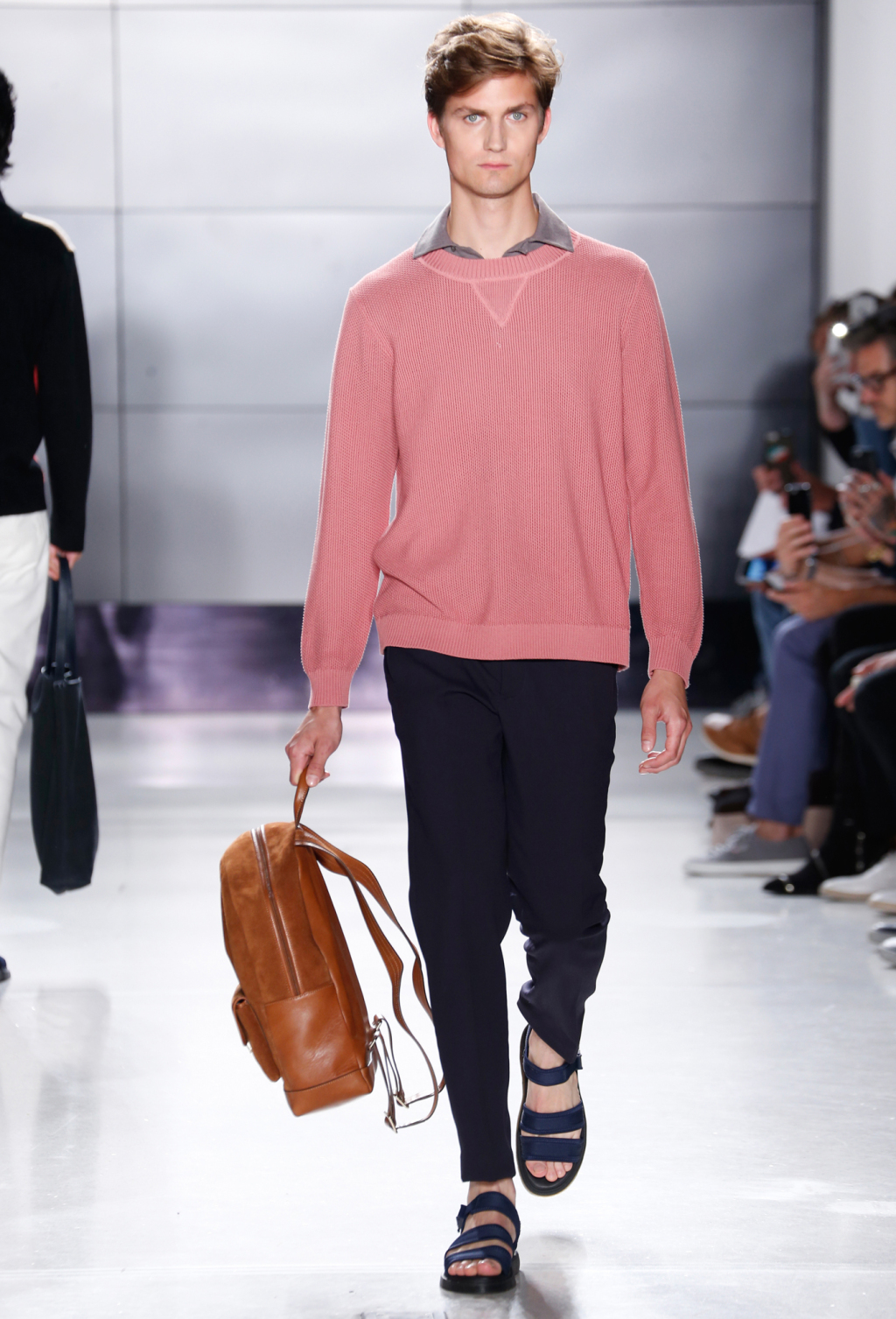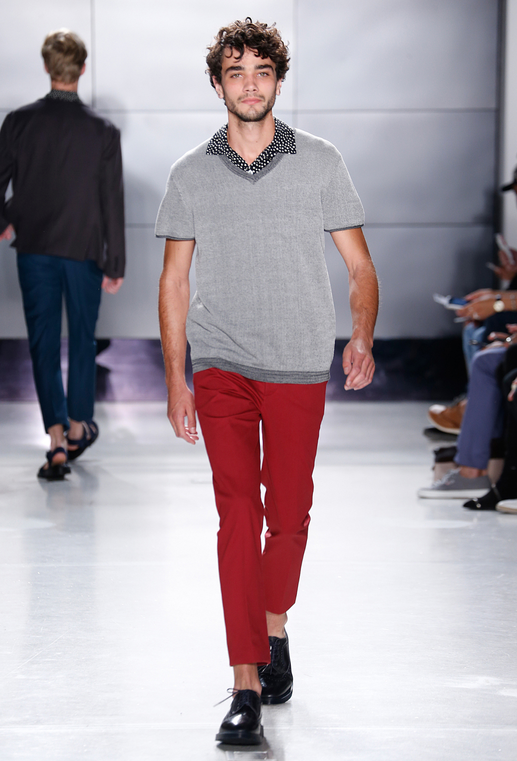 Timo Weiland’s spring collection expounded on what the brand does best: create quirky pieces with a preppy twist — although the overall offering fell a bit flat. This season the team, which includes Timo Weiland, Donna Kang and Alan Eckstein, referenced classic men’s silhouettes from the Fifties and updated them with bold colors and varying textures. Combinations of cherry red, pink, kelly green and cobalt blue appeared on chevron knits, basic sweatshirts and color-blocked sweaters. The silk shirt, which was either shiny or sometimes matte, helped lend what the designers called a “casual luxe” feel to the collection.