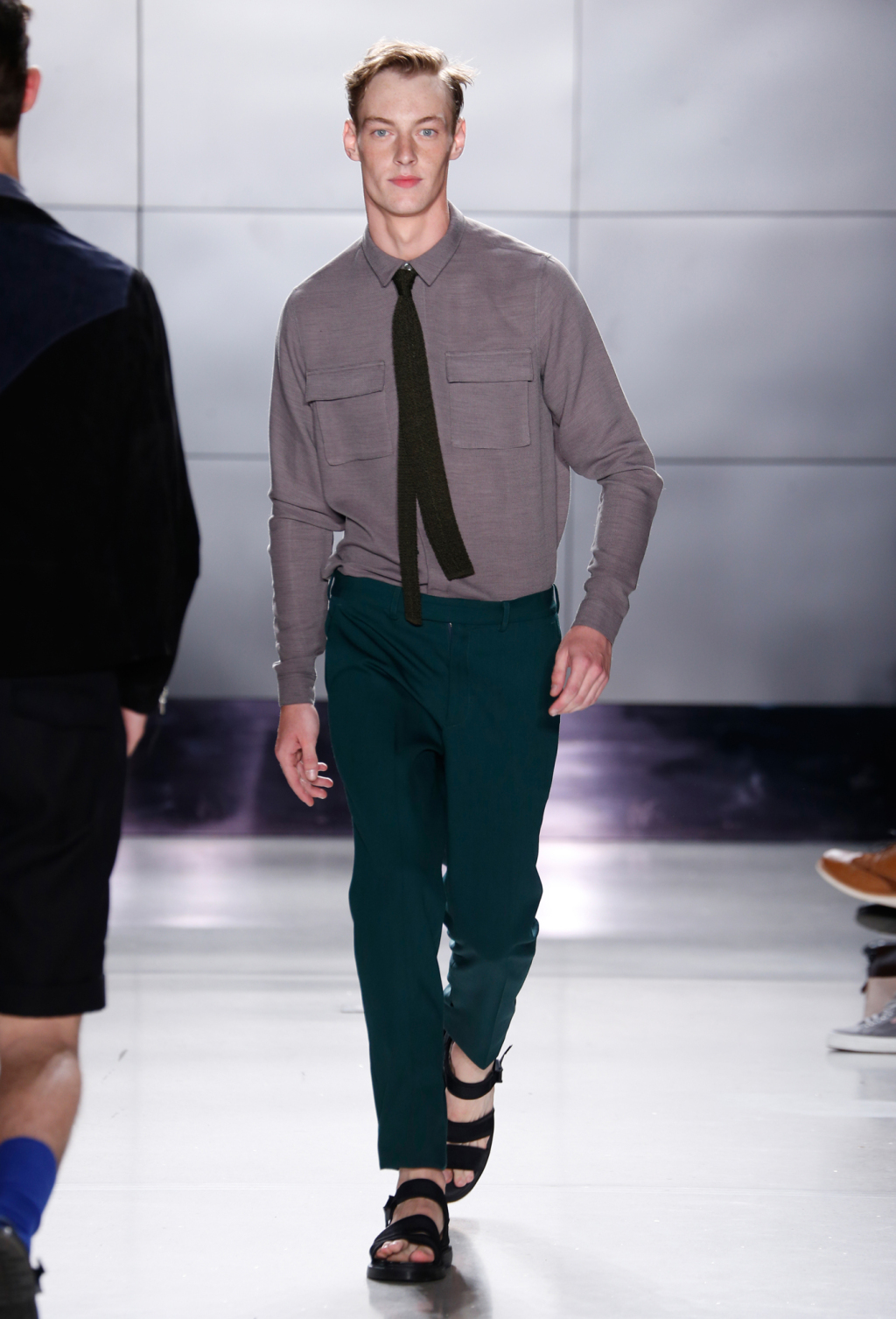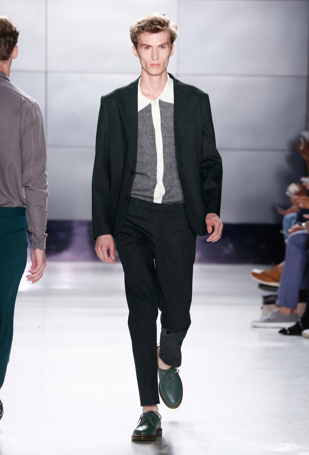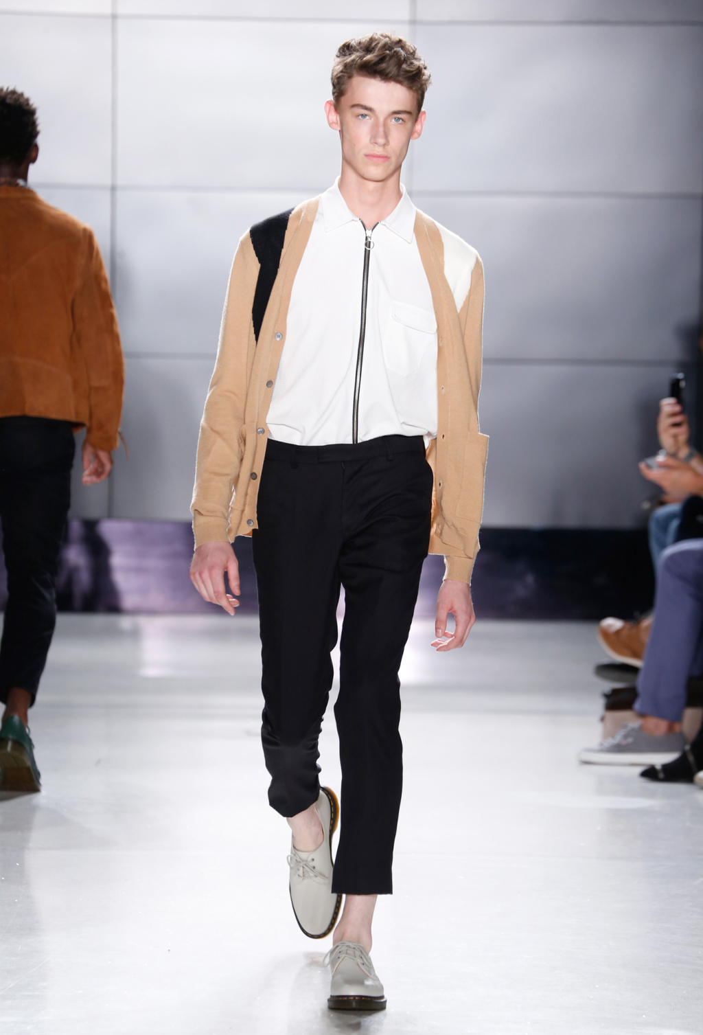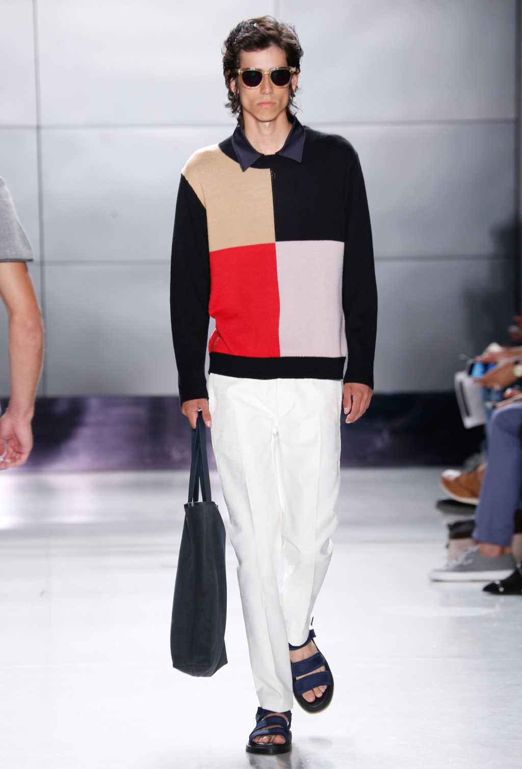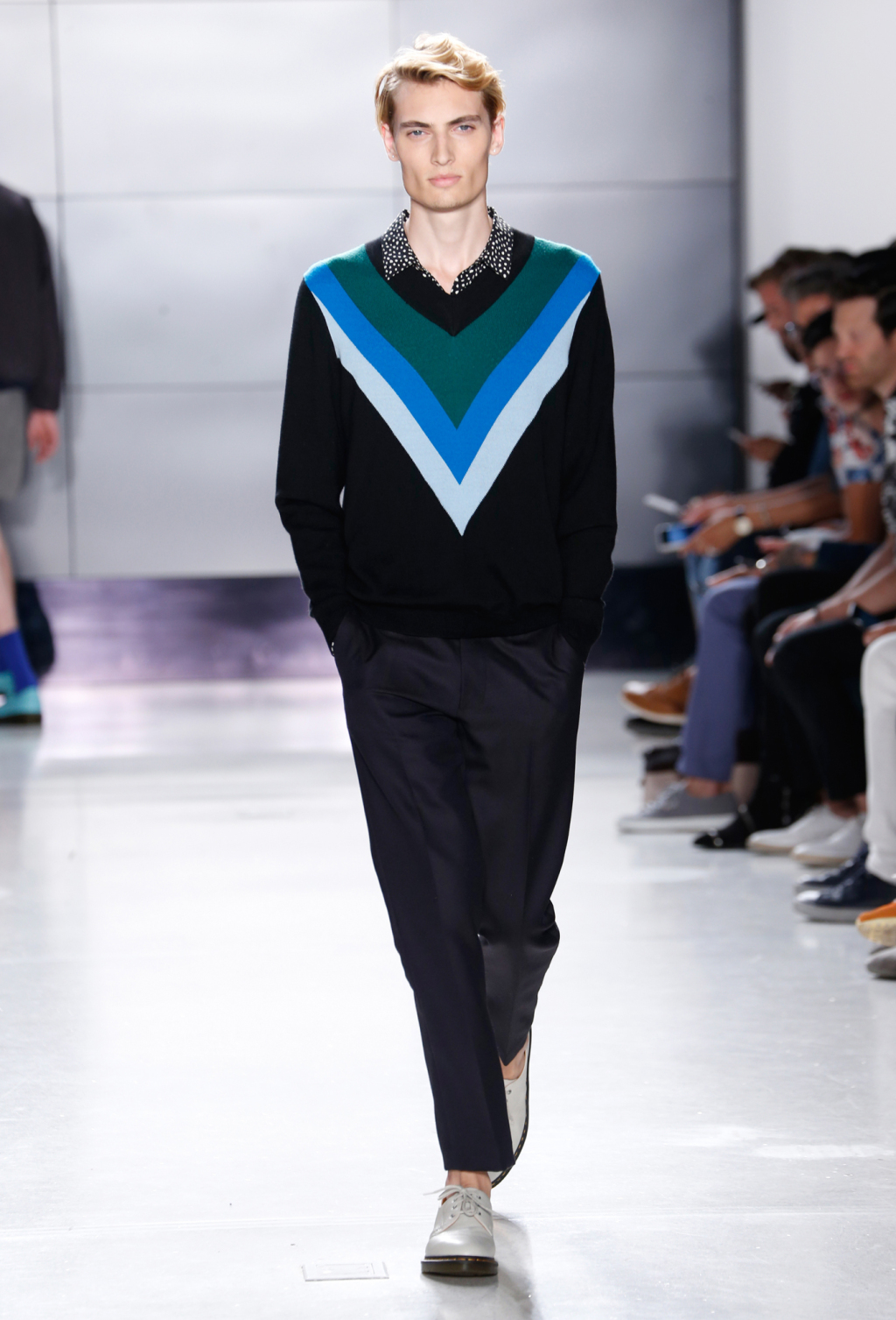 Timo Weiland’s spring collection expounded on what the brand does best: create quirky pieces with a preppy twist — although the overall offering fell a bit flat. This season the team, which includes Timo Weiland, Donna Kang and Alan Eckstein, referenced classic men’s silhouettes from the Fifties and updated them with bold colors and varying textures. Combinations of cherry red, pink, kelly green and cobalt blue appeared on chevron knits, basic sweatshirts and color-blocked sweaters. The silk shirt, which was either shiny or sometimes matte, helped lend what the designers called a “casual luxe” feel to the collection.